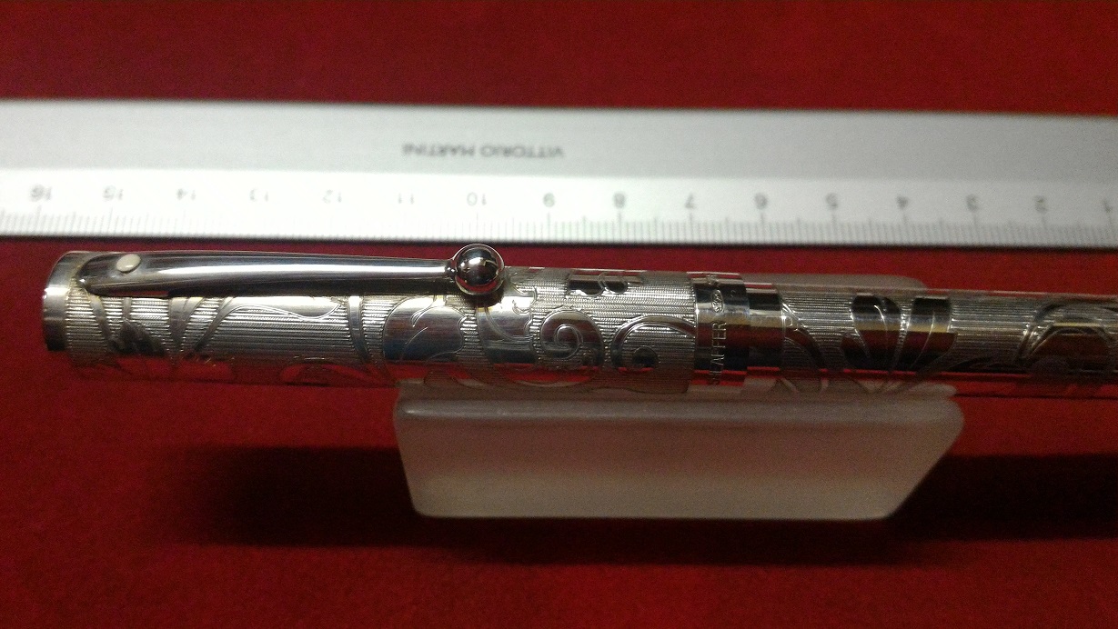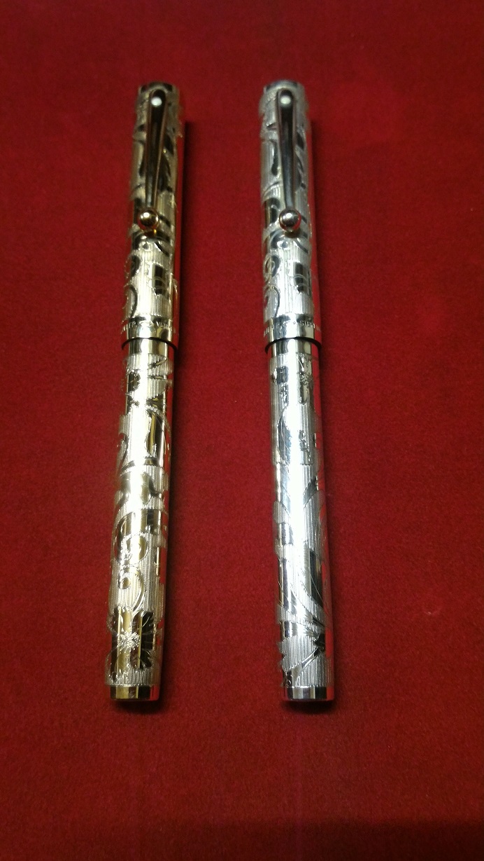 Questa coppia di Sheaffer in argento massiccio e argento laminato oro è un altro modello particolare della Casa americana. Anche in questo caso la cesellatura è fatta a mano da orafi inglesi.