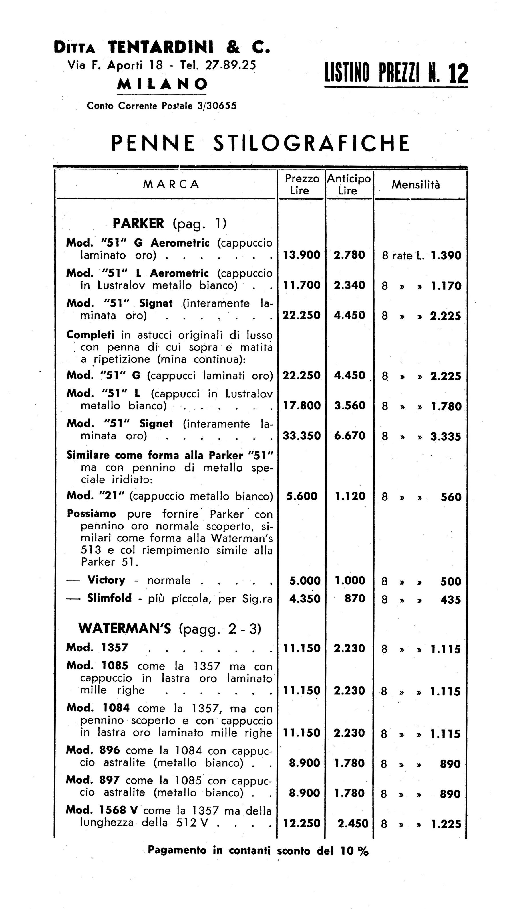che riporta penne stilografiche disegnate in grandezza naturale con i relativi prezzi in un foglietto allegato.