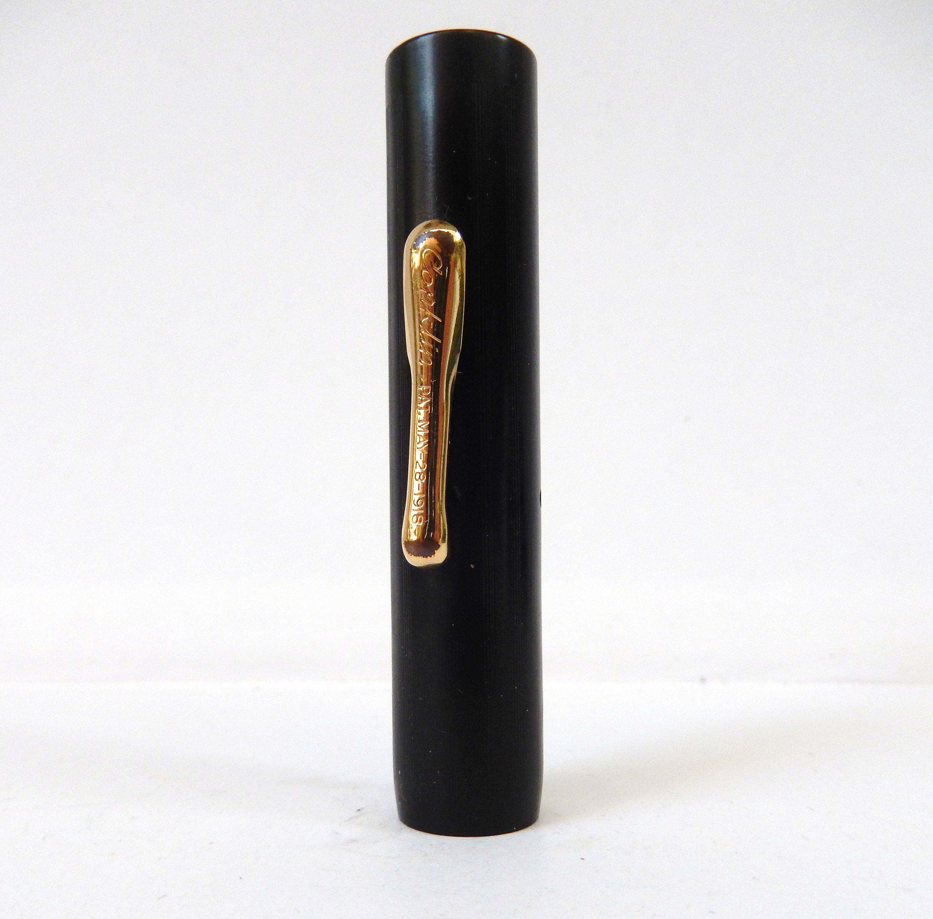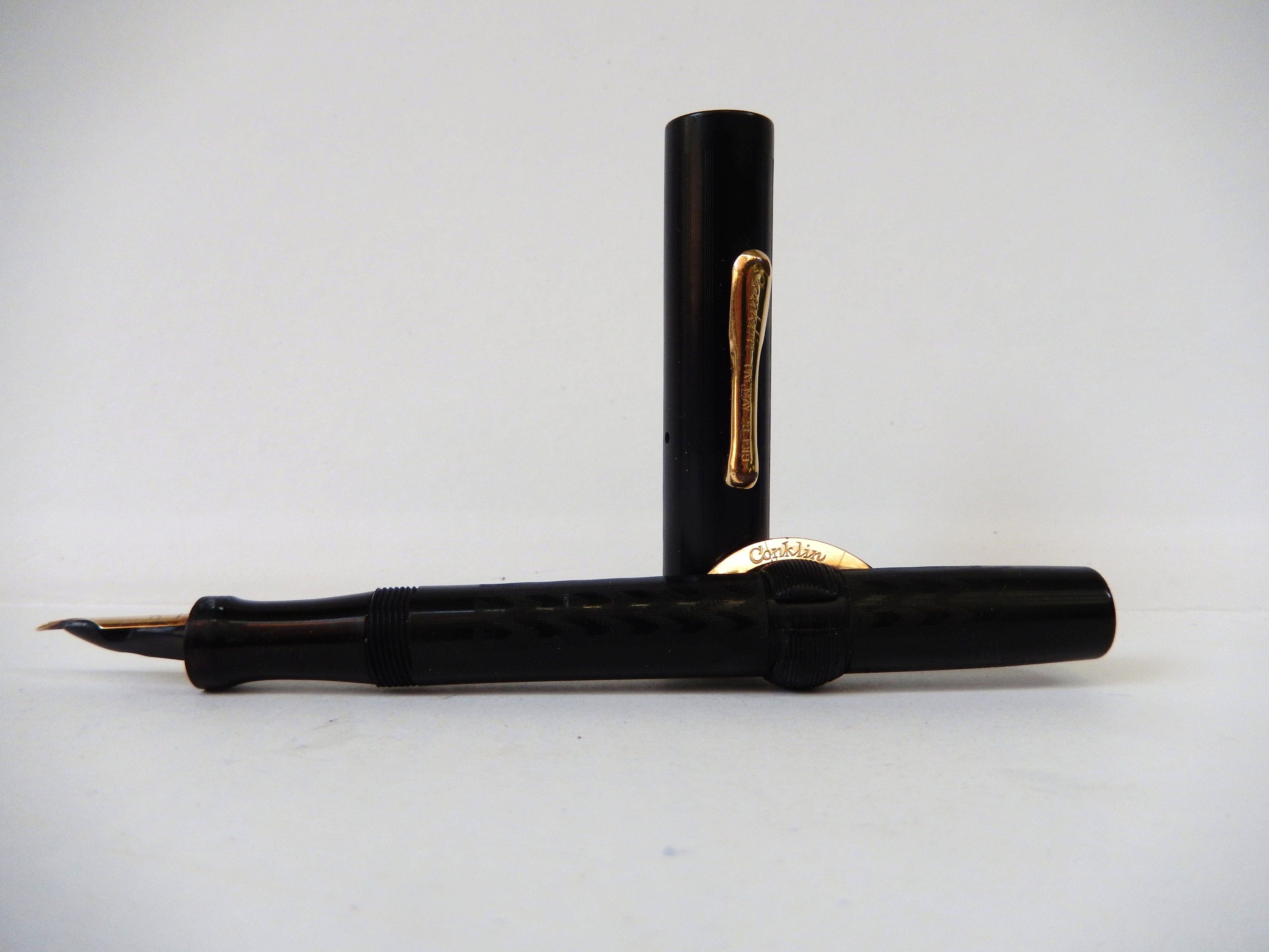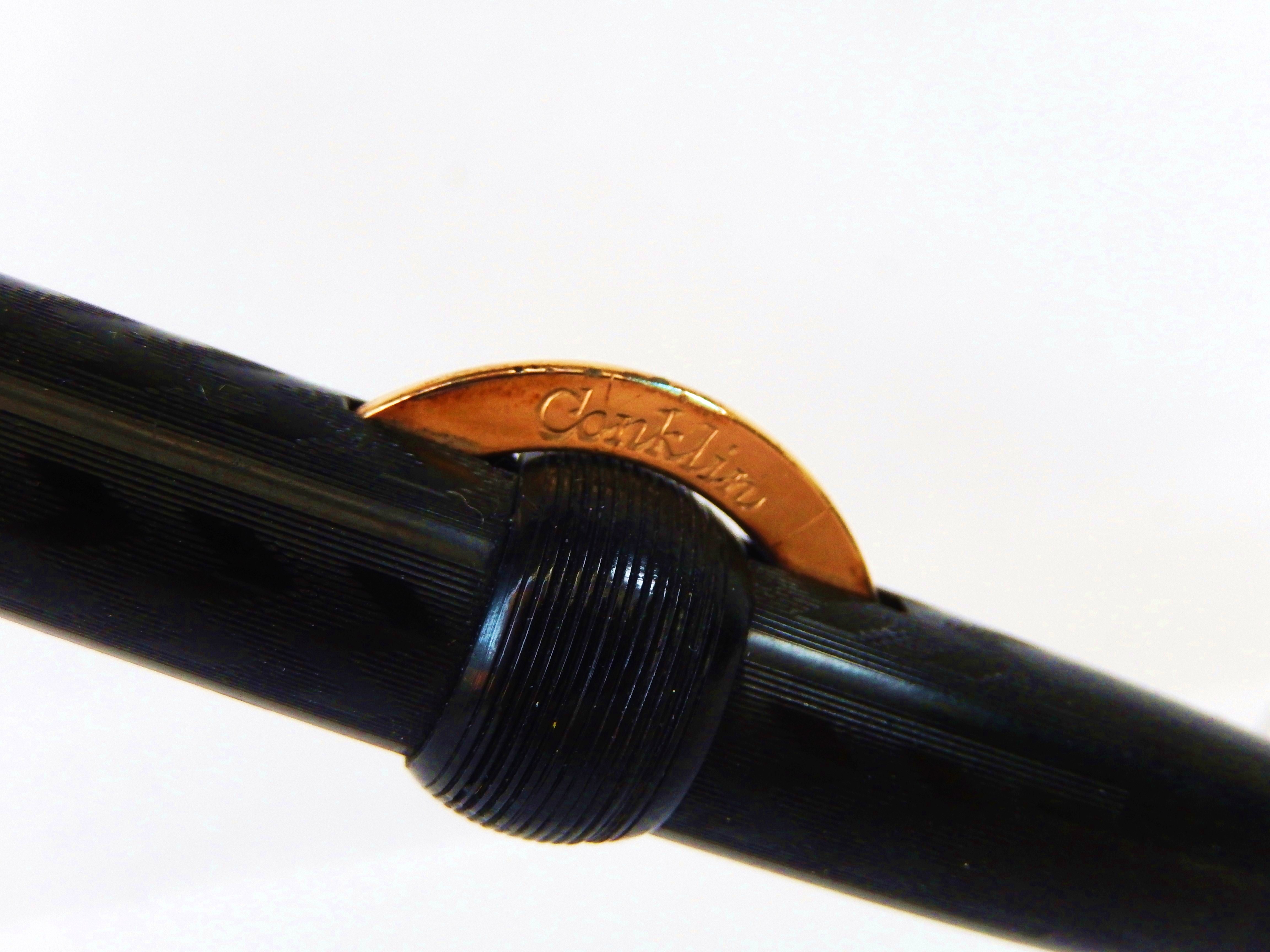 Il modello fu in produzione fino a verso il 1923/24 quando sulla Duragraph la Conklin cominciò ad utilizzare la carica a levetta. Per datare questo esemplare può essere utile ricordare che fino al 1908 sulla mezzaluna non figuravano scritte, dal 1909 appare la scritta "trade mark crescent filler" e dal 1918 viene riportato, sull'altra faccia della luna,il marchio Conklin, come in questo esemplare, riferibile dunque fra il 1918 ed il 1923 circa. Il pennino in oro è un n. 5. come di norma su questo modello, di ottima flessibilità e scorrevolezza.