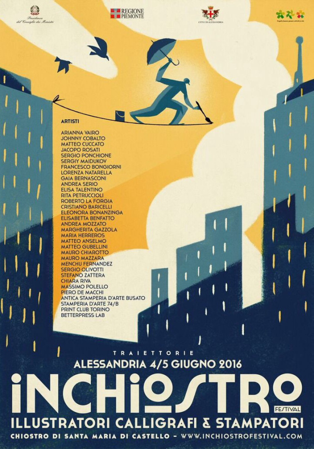 Inchiostro Festival è un evento culturale performativo che si svolge il primo weekend di giugno. Una manifestazione che ospita per alcuni giorni, come in una residenza artistica, illustratori, calligrafi e stampatori d’arte creando un vero e proprio laboratorio dell’eccellenza artistica, e della creazione dal vivo, aperto ad un pubblico attivo e coinvolto. Il suo format è il bianco e nero, nelle varie sfumature, per le opere realizzate con ogni tecnica manuale e, ogni anno, viene abbinato ad una parola ispiratrice come Traiettorie per il 2016, declinata in un abstract per spiegarne origini e stimoli.
