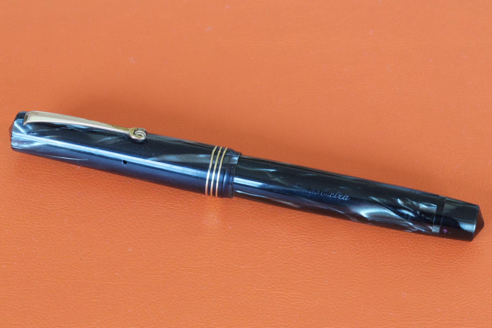 .Trovare questa bellezza mi ha fatto tremare le gambe, praticamente mai usata, il pennino è super flessibile e molto fine, la penna misura 13,5 cm. da chiusa. Penso sia databile tra il 1945-1950, giusto? La celluloide così variegata è bellissima e illuminata dal sole regala contrasti abbaglianti. Il sughero dello stantuffo nonostante fosse solo leggermente sporco di inchiostro non aderiva bene, ho provato a tenerlo a bagno e a passarlo nel grasso al silicone ma non ho avuto gli effetti desiderati, mi sono allora cimentato nella costruzione di uno nuovo e tutto è andato per il meglio.