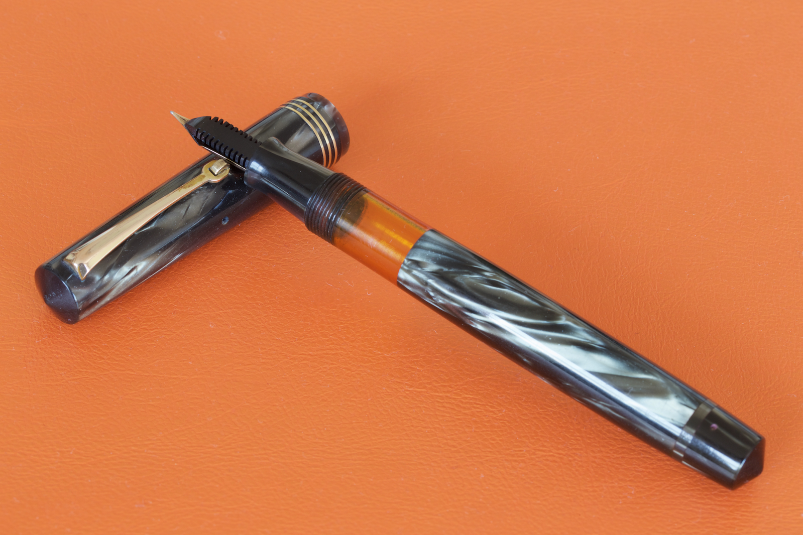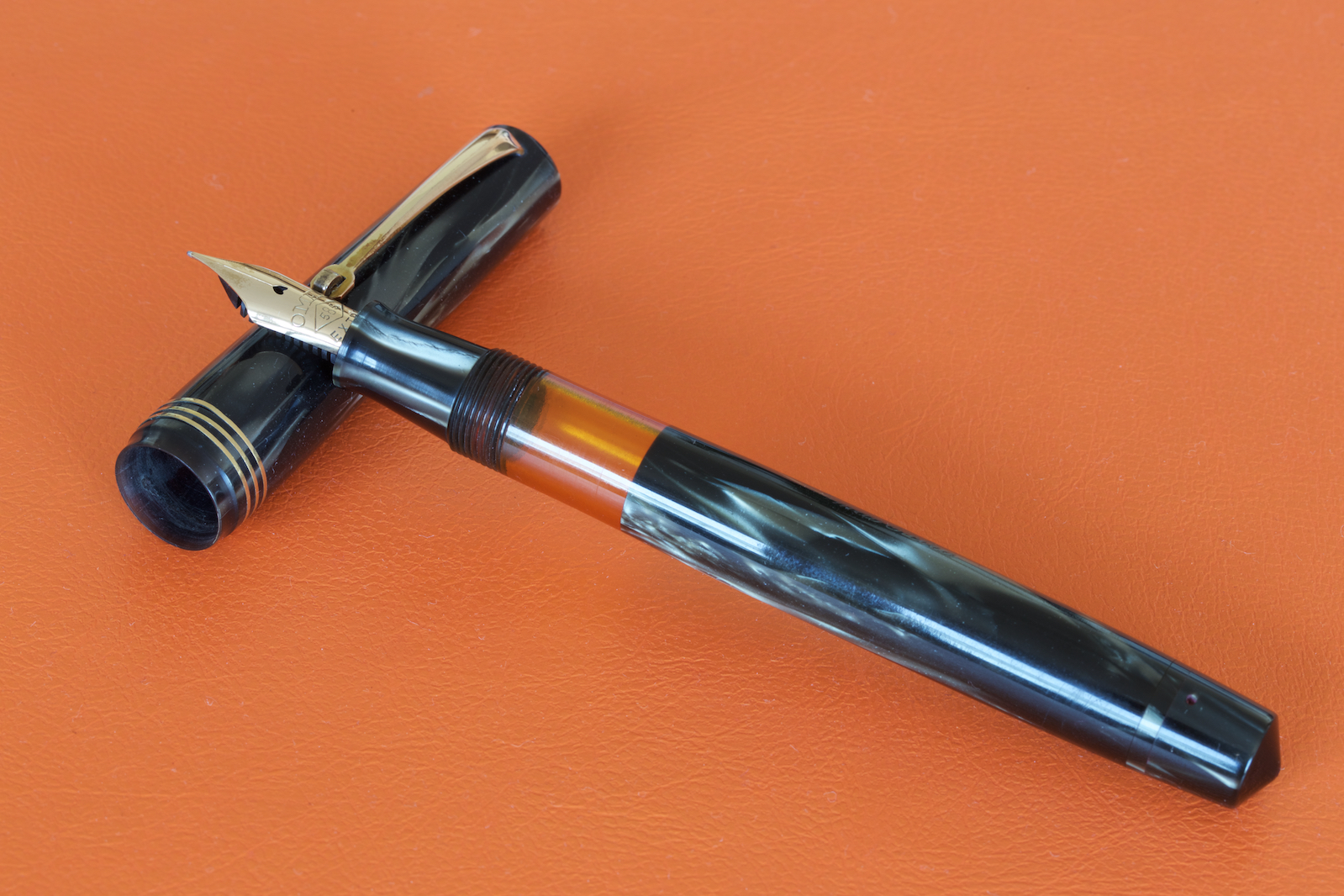 .Trovare questa bellezza mi ha fatto tremare le gambe, praticamente mai usata, il pennino è super flessibile e molto fine, la penna misura 13,5 cm. da chiusa. Penso sia databile tra il 1945-1950, giusto? La celluloide così variegata è bellissima e illuminata dal sole regala contrasti abbaglianti. Il sughero dello stantuffo nonostante fosse solo leggermente sporco di inchiostro non aderiva bene, ho provato a tenerlo a bagno e a passarlo nel grasso al silicone ma non ho avuto gli effetti desiderati, mi sono allora cimentato nella costruzione di uno nuovo e tutto è andato per il meglio.