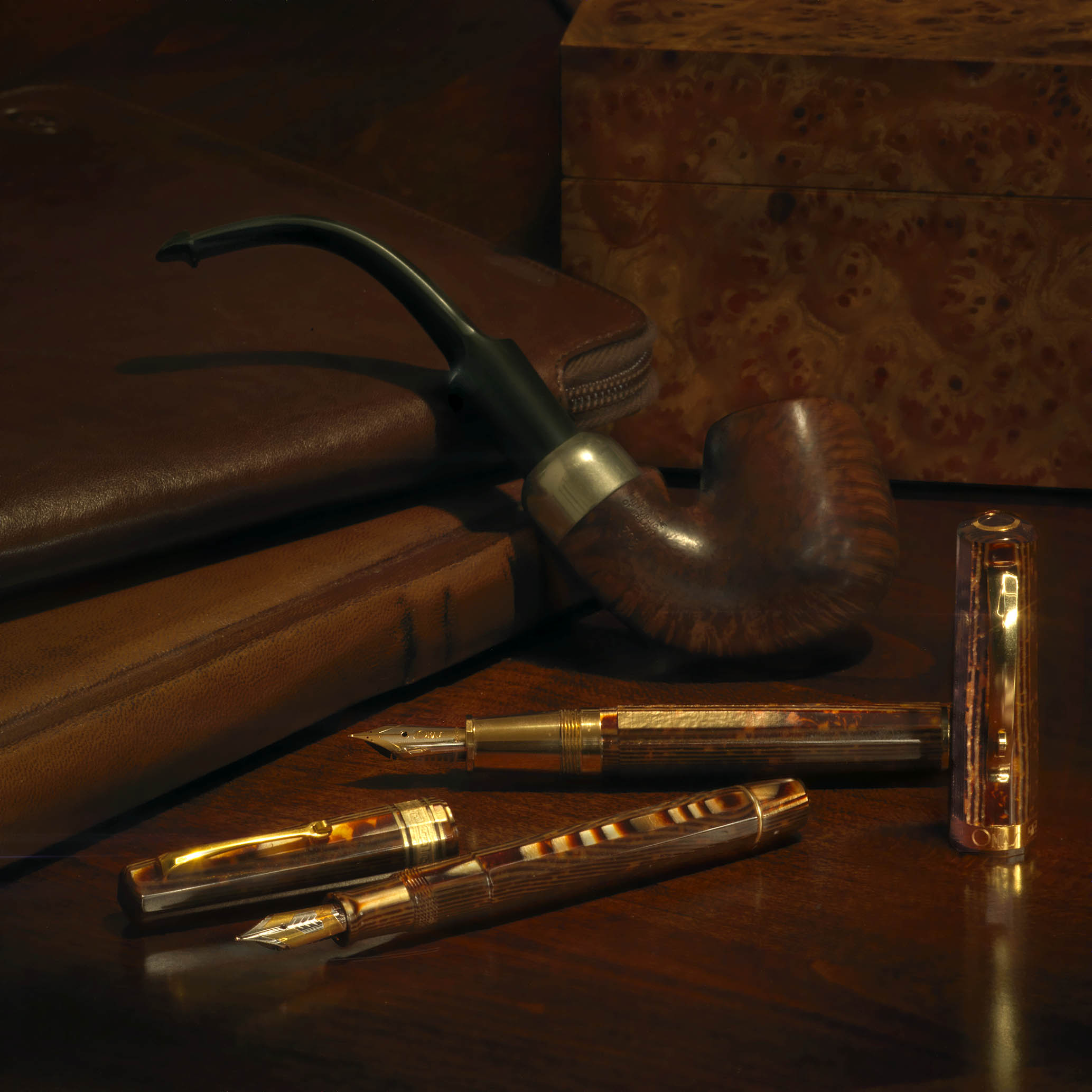 Per me, che vivo lontano dall’Italia, i colori caldi delle terre bruciate, del cuoio tinto al vegetale, della terracotta, della radica di noce, dei bronzetti rinascimentali, sono i colori della terra di Dante, terra di colline a cipressi, colori di nostalgia. A questi devo aggiungere il colore unico della celluloide marrone Arco, che Omas usava per alcune linee delle sue penne. E’ un colore cosí italiano…