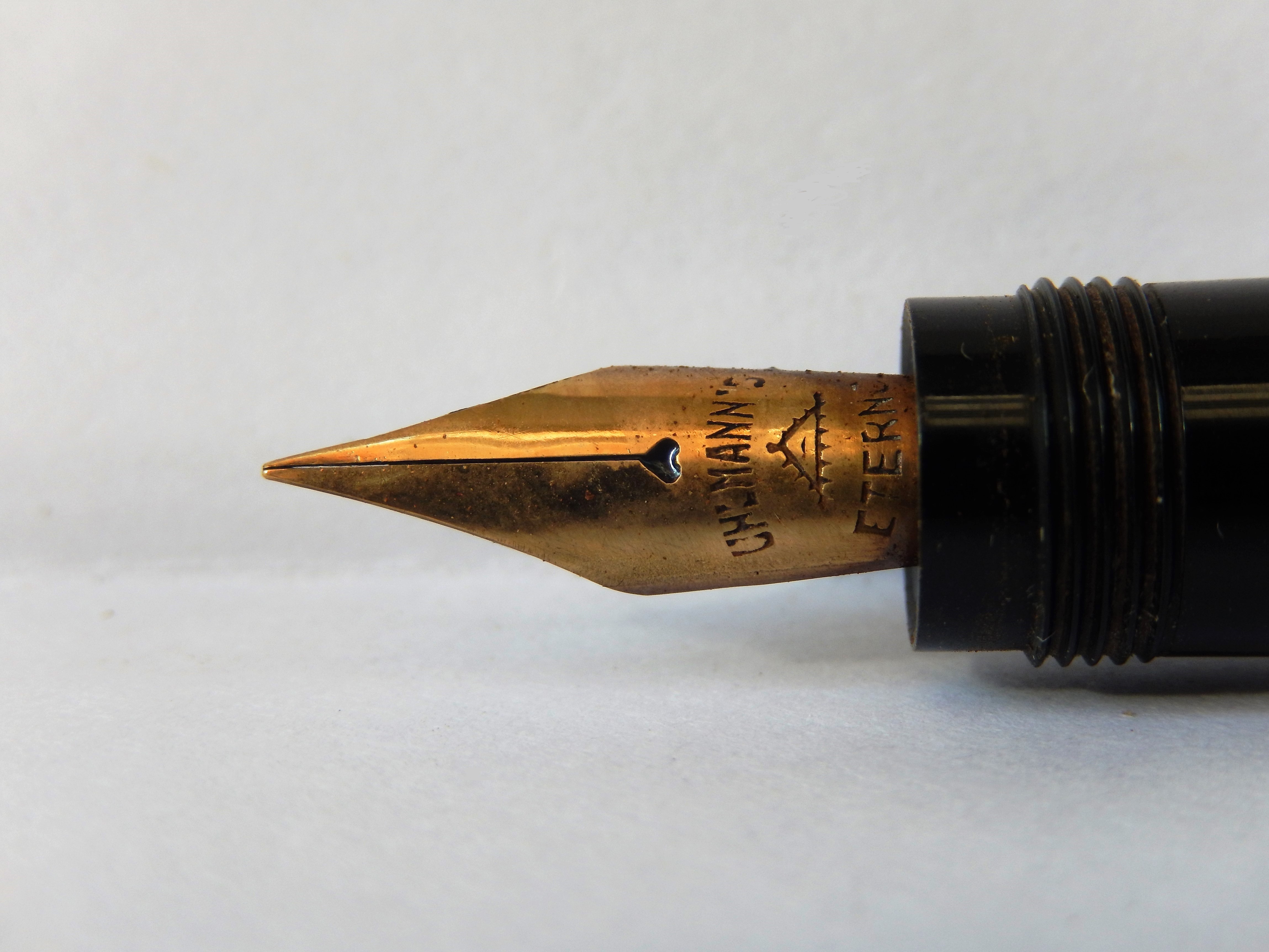 Il pennino, con sfiatatoio a cuoricino, è marcato Uhlmann's Eterno su due livelli, fra i quali compare il logo di un triangolo da cui si irradiano raggi, al