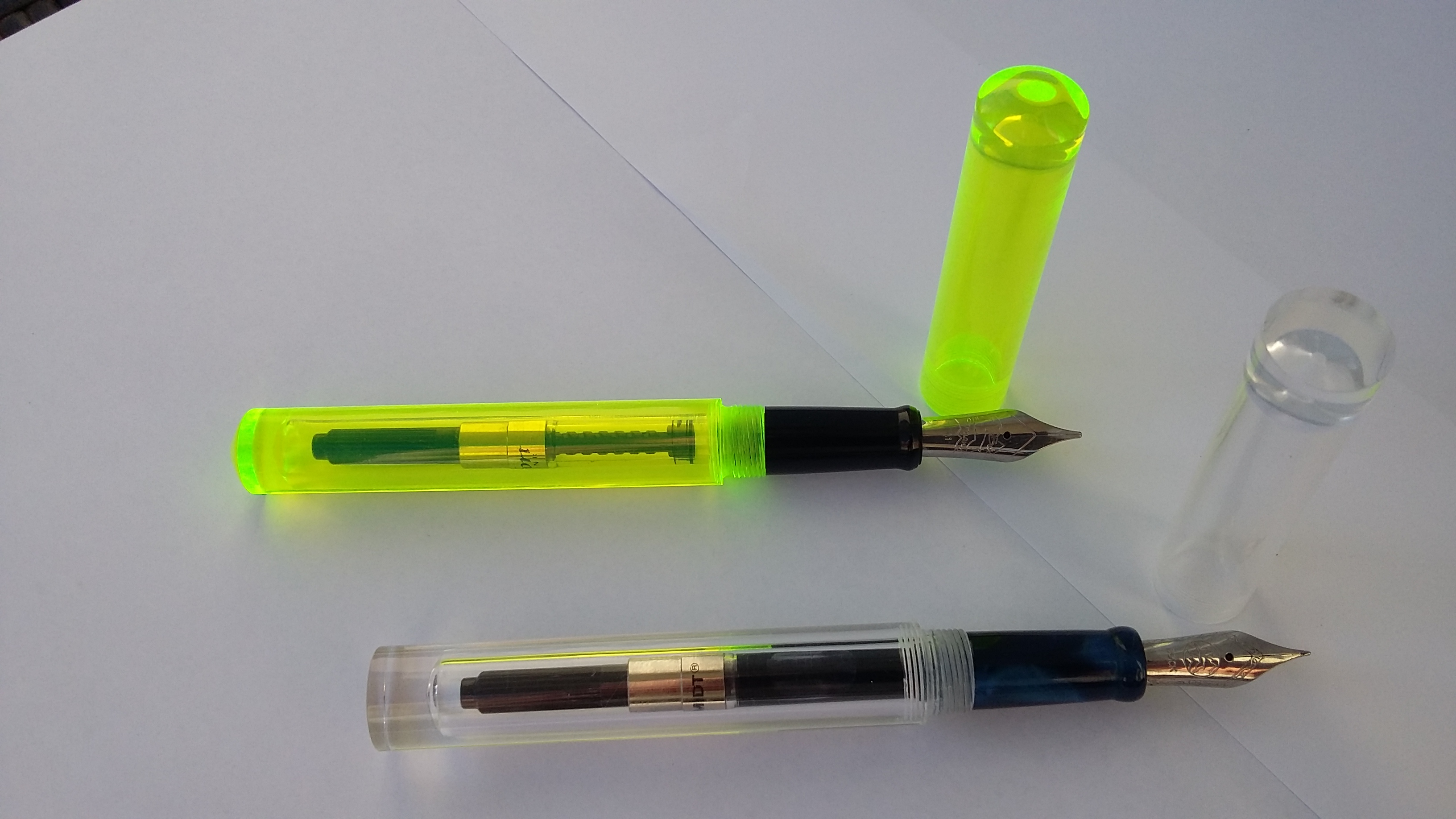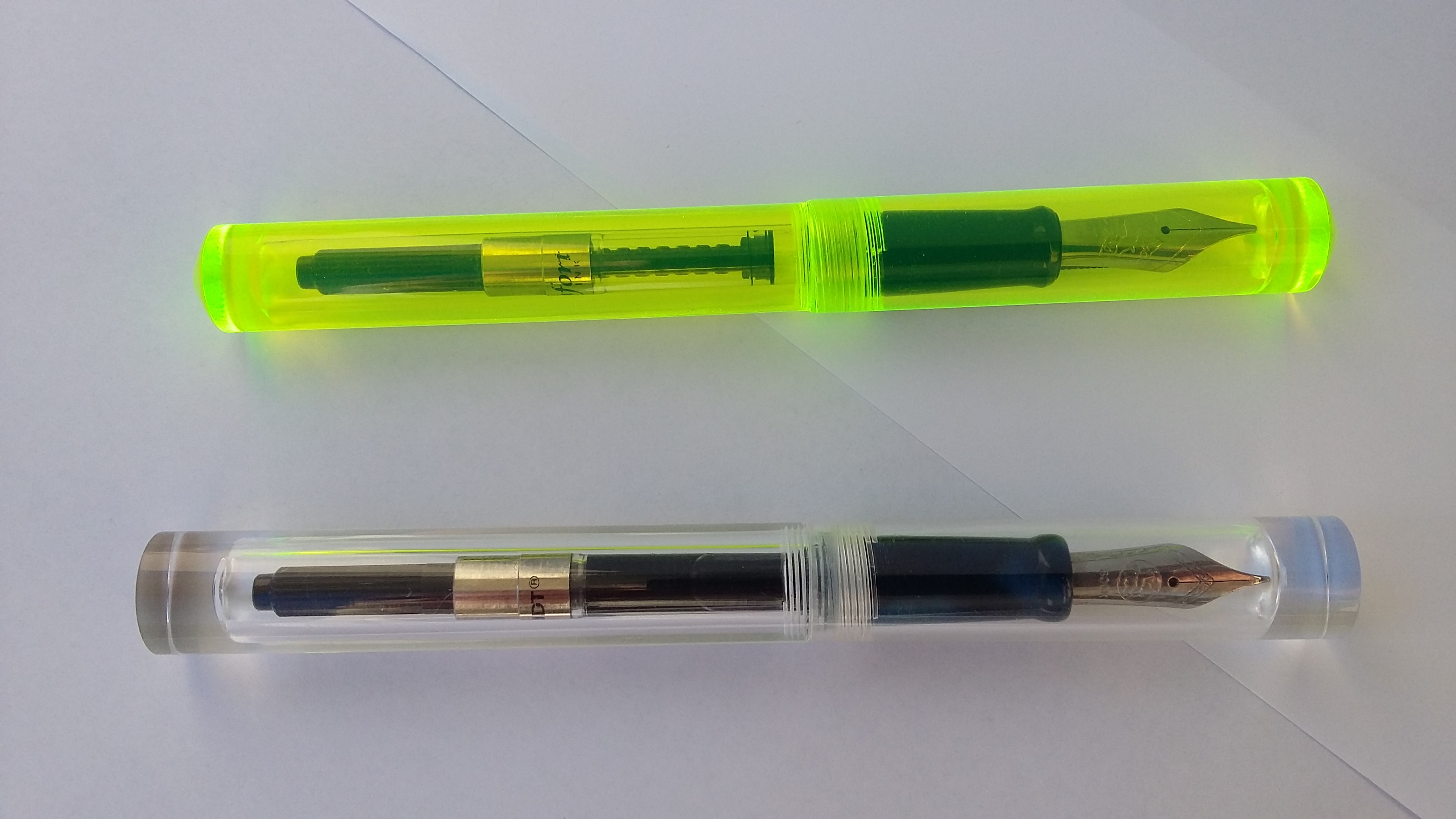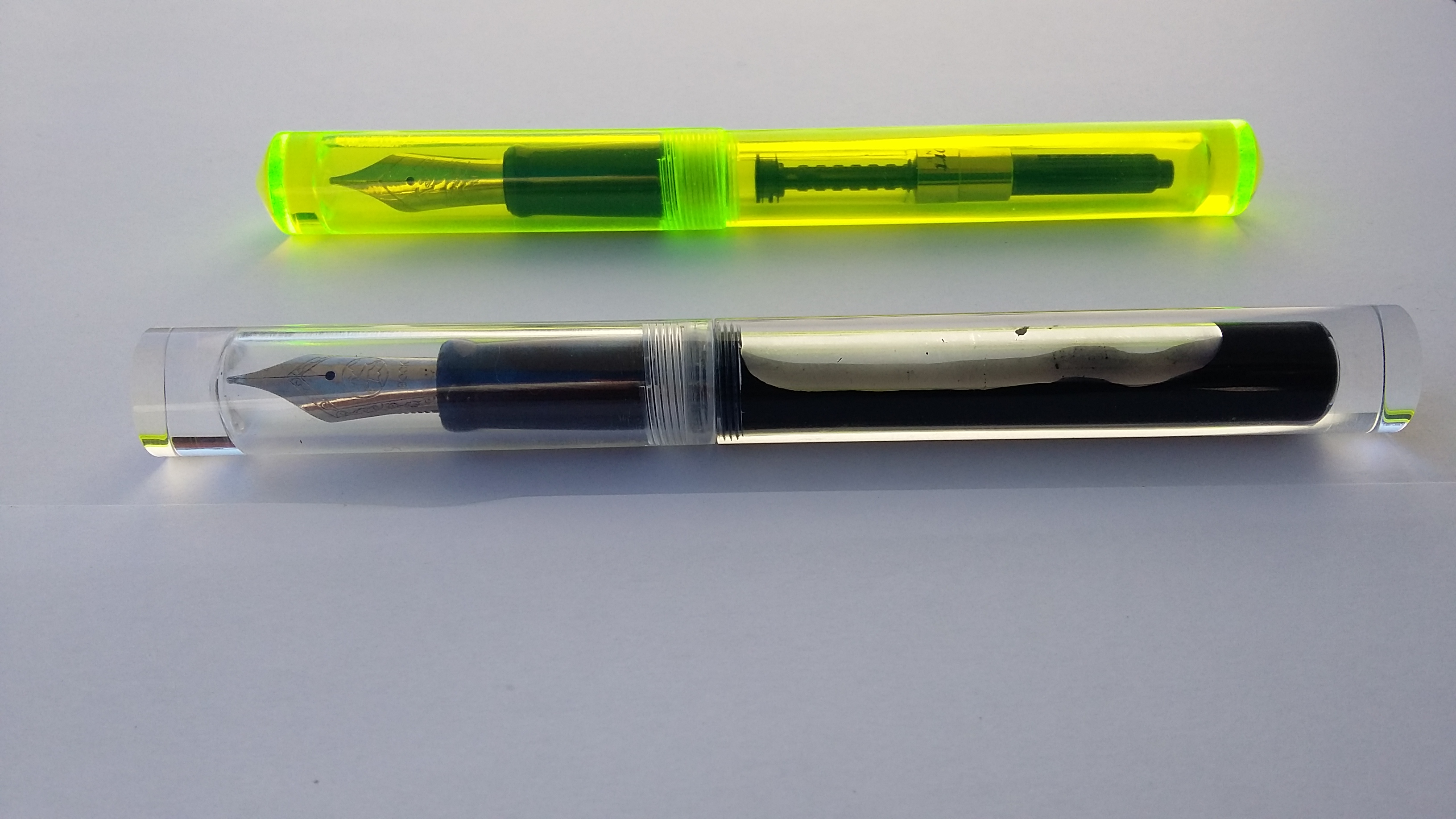 Nella terza foto si può notare che sulla penna trasparente ho eliminato il converter per utilizzare il fusto come serbatoio,con un po' di grasso al silicone sui filetti la tenuta è assicurata.