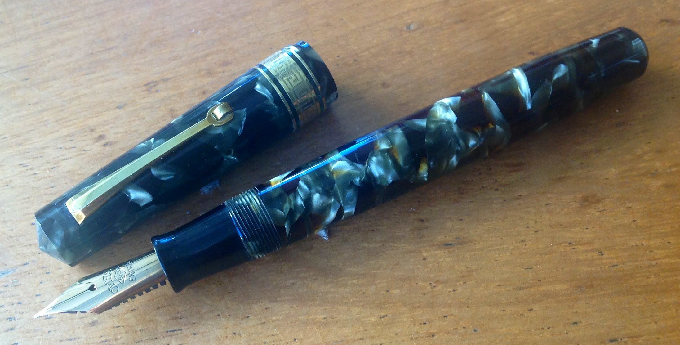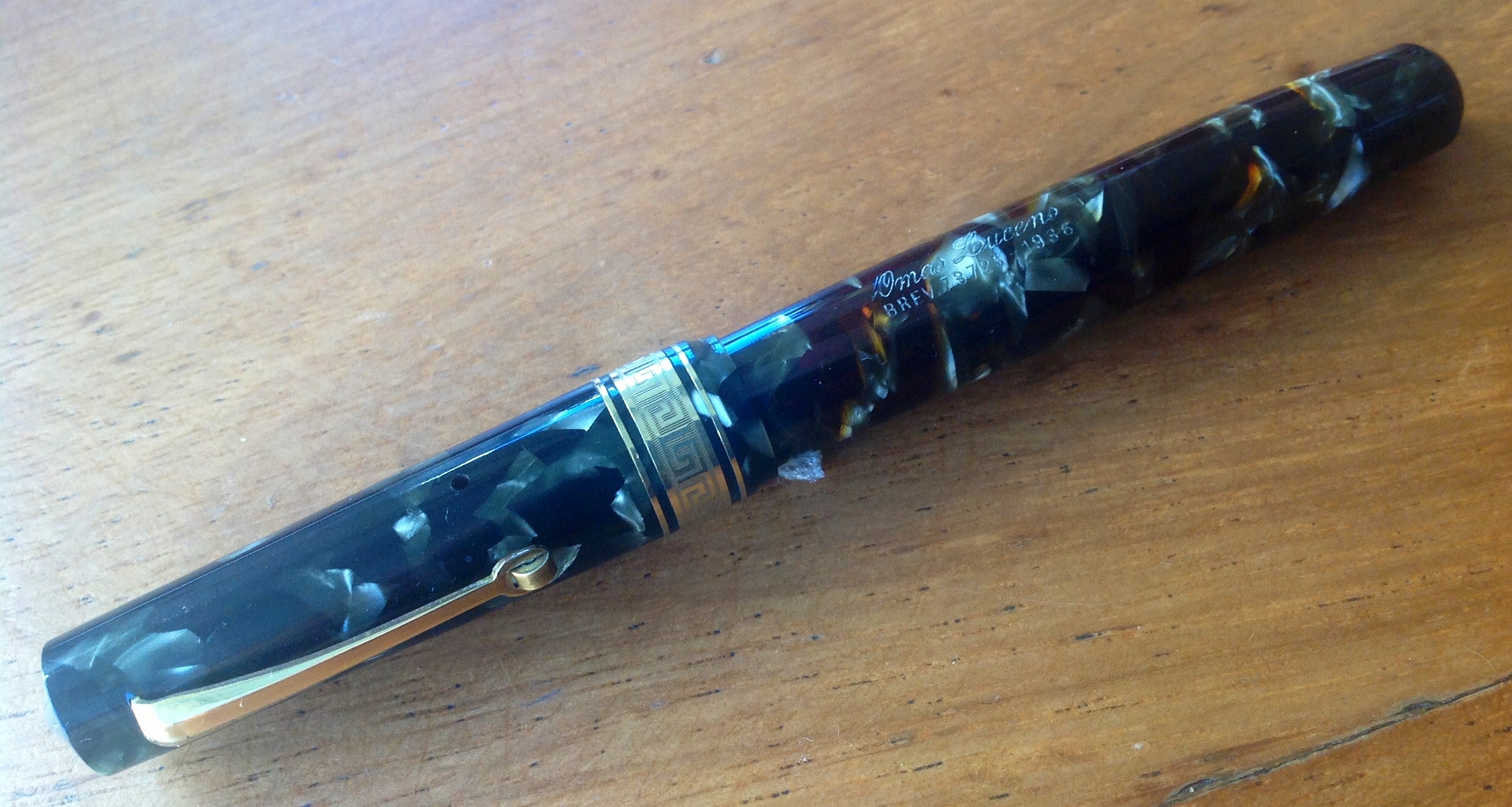 Questa è una Omas Lucens prima serie in misura grande (circa cm. 14 chiusa) del 1936. Si distingue dalla serie successiva, del 1938, per avere ancora gli anellini del cappuccio con la classica fascetta grecata tra due anellini semplici, mentre nella versione successiva avrà solo tre anellini uguali...