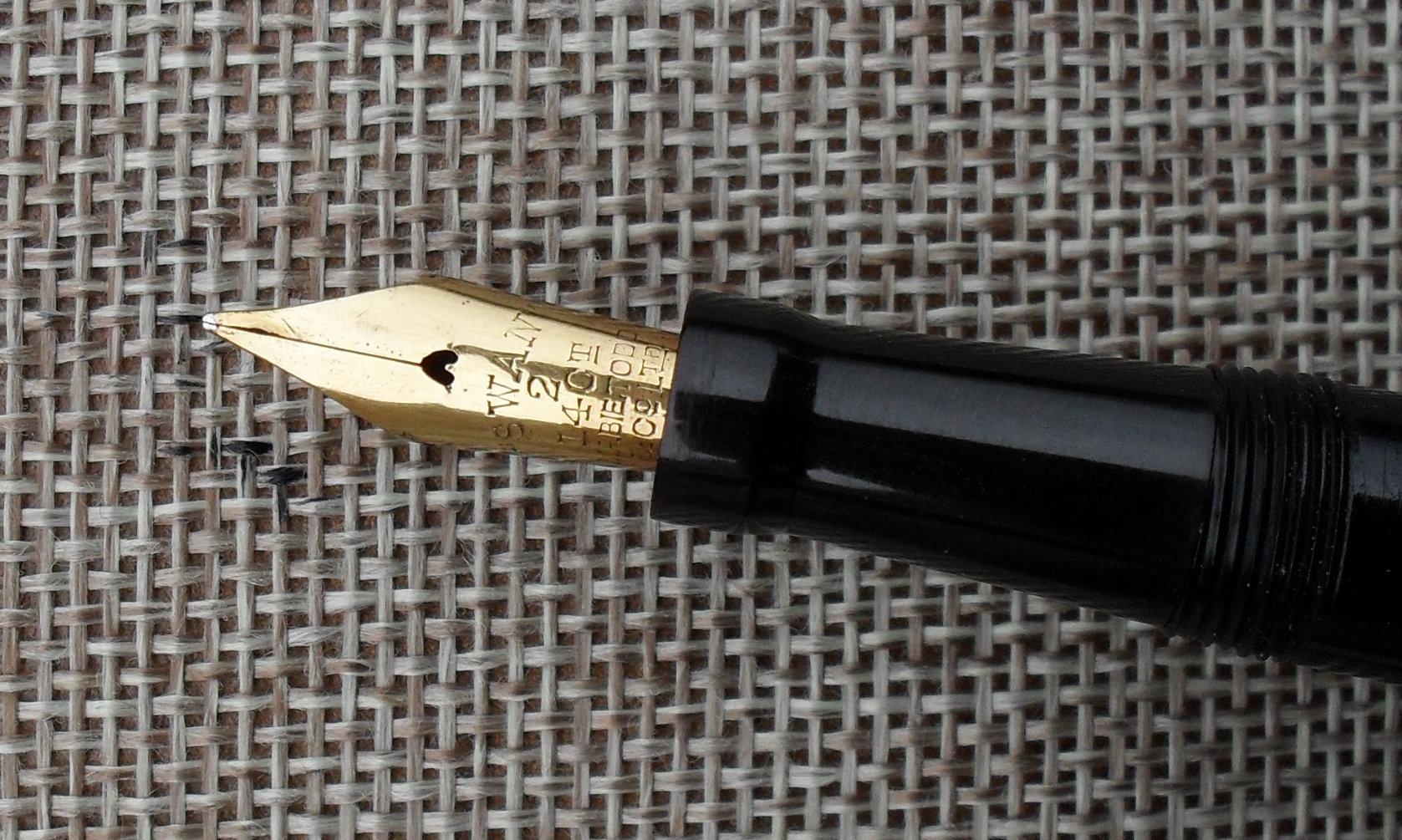 La parte più interessante della penna, o se si vuole la sua caratteristica peculiare, è il pennino. Non solo è di misura ridotta rispetto alla prassi (la versione “oversize” della Leverless Pen usualmente montava pennini più grandi), ma è flessibile, con punta tronca. La sezione riporta la scritta “Swan L2”, del tutto coerente con il pennino. Negli anni ’30, per gli acquirenti di penne costose, e la Leverless Pen 24/60 non era certamente economica, era normale ottenere il montaggio di un pennino personalizzato.