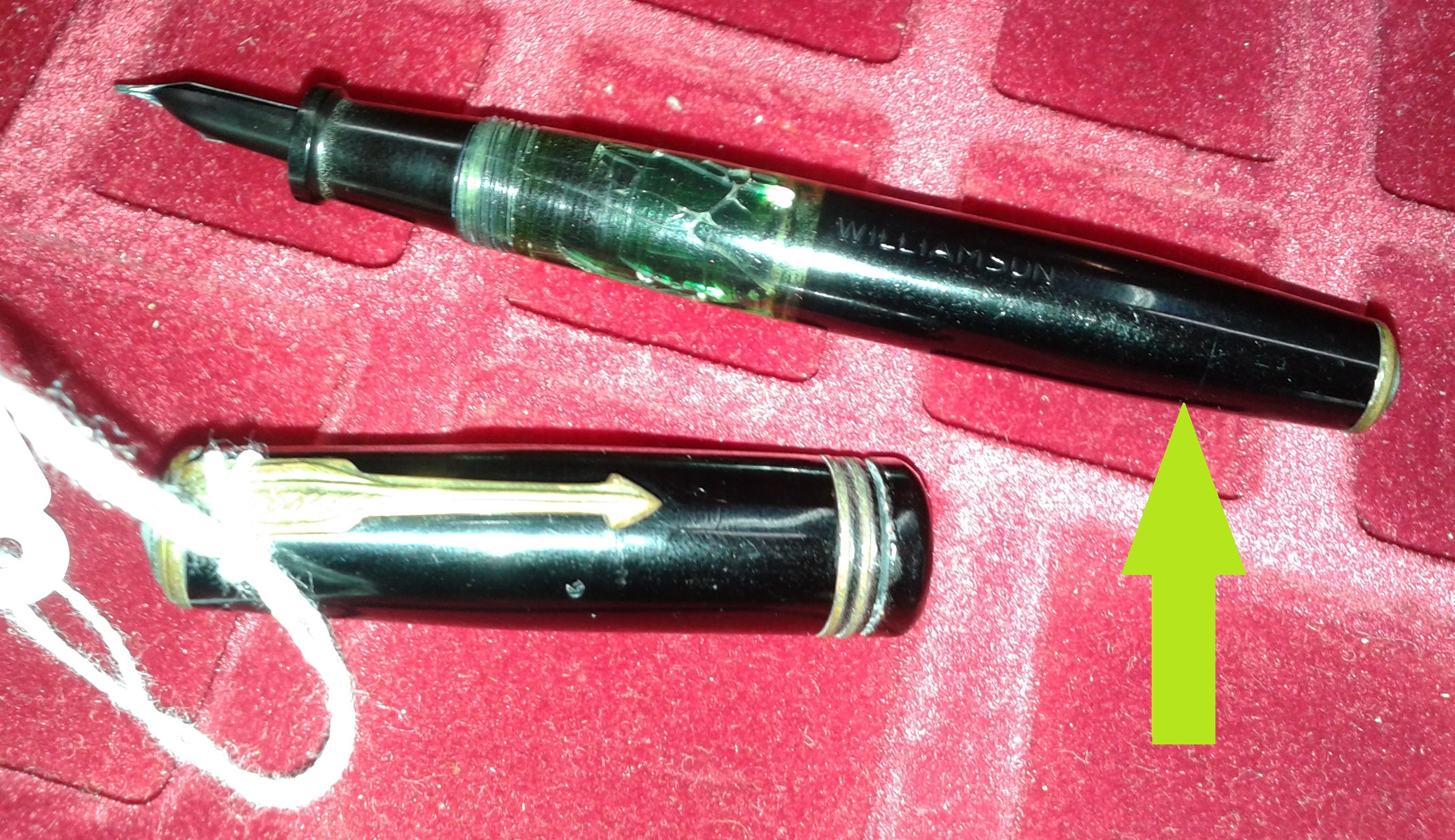 WILLIAMSON - TORINO Junior in celluloide verde marmorizzata tornita da barra piena, parti metalliche a vista dorate, pennino assente, caricamento a pulsante di fondo, produzione Italia anno 1936. La penna presenta il fondello smangiucchiato da qualche bravo bambino, che per quel puerile quanto esiziale sfizio ha fatto percepire al suo sfortunato discendente la risibile somma di Euro 5 (cinque)…