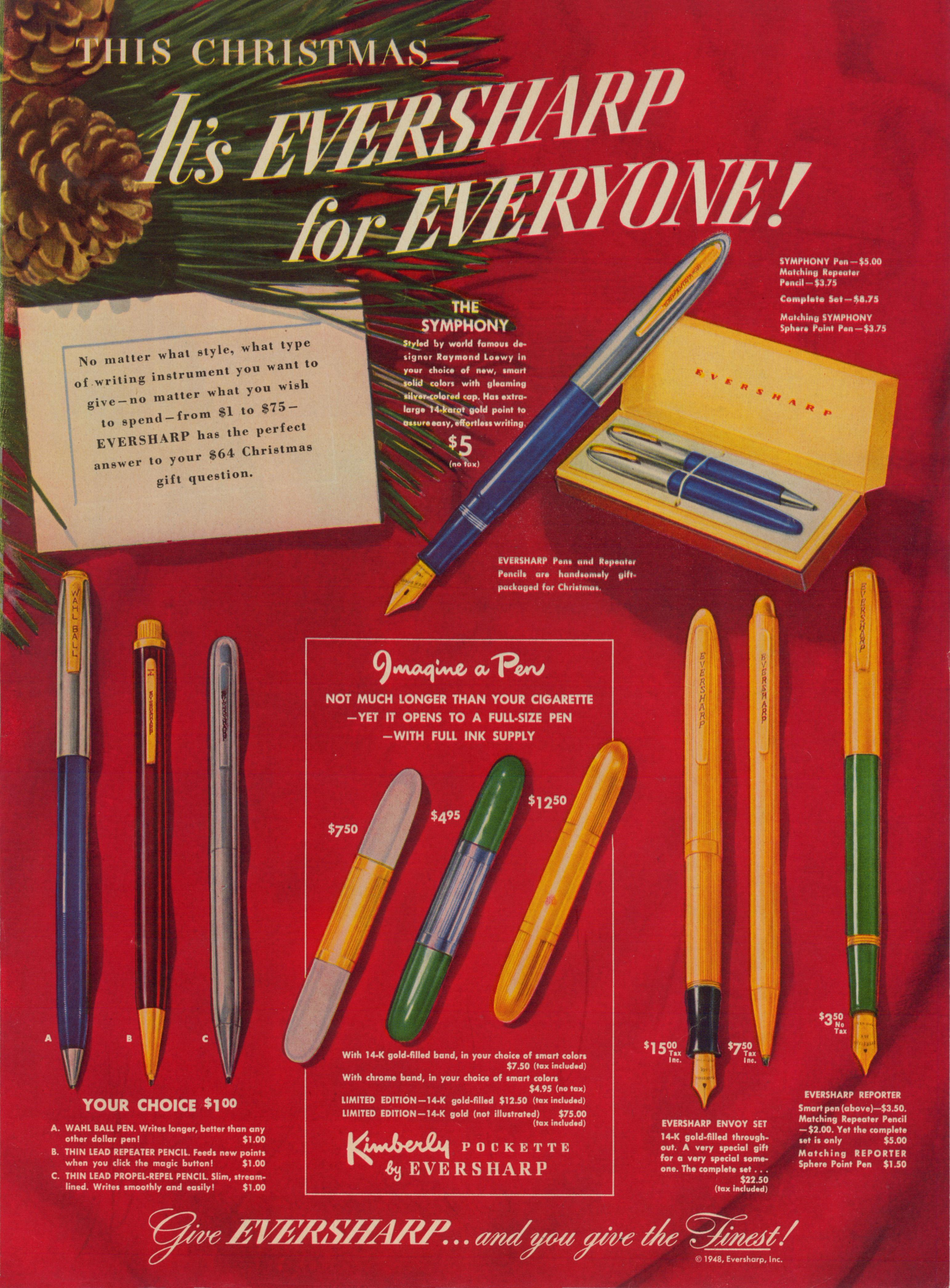 Purtroppo, il "top di gamma" Wahl Eversharp del 1948, ben oltre i 15 $ della "Envoy", era la "Kimberly Pockette": penna frou-frou ma non troppo, ben arrotondata (o arrotolata, visto che è paragonata ad una sigaretta), dotata dell'appeal deleterio ma all'epoca ancora non abusato delle "limited edition", non solo nella versione ( di certo davvero limitatissima) in oro massiccio da 75 $ (!) ma anche nella più semplice laminata oro 14kt da 12.50 $, che nel rapporto peso/potenza supera anche la "Envoy"...