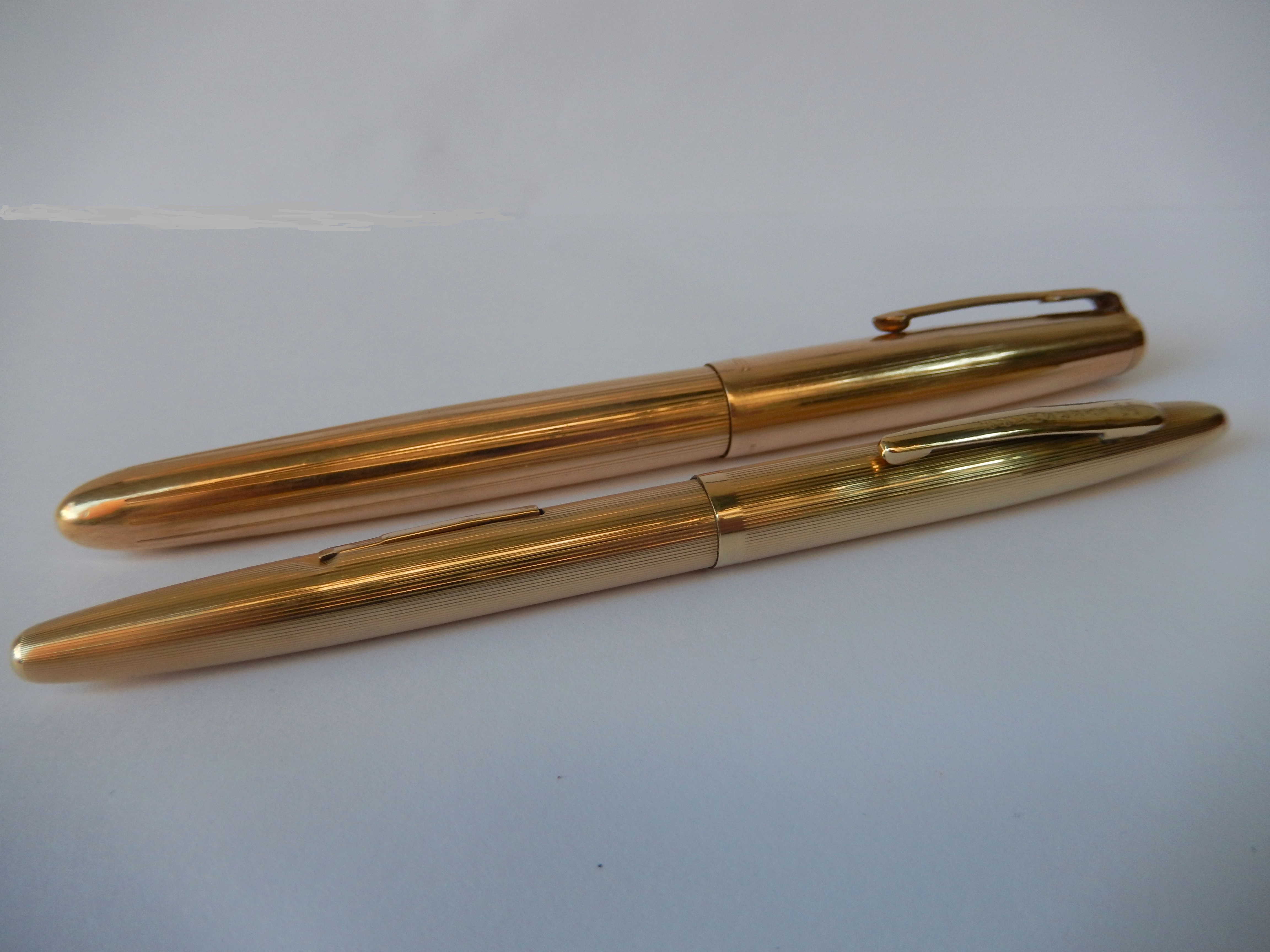 La penna chiusa misura 13,6 cm e 14 aperta, escluso il pennino. Sfoggia una linea affusolata pulita e semplice con un diametro massimo di 0,80 cm, dunque molto sottile come vediamo qui nel confronto con una coeva Parker 51 Signet che ne misura 1,05.