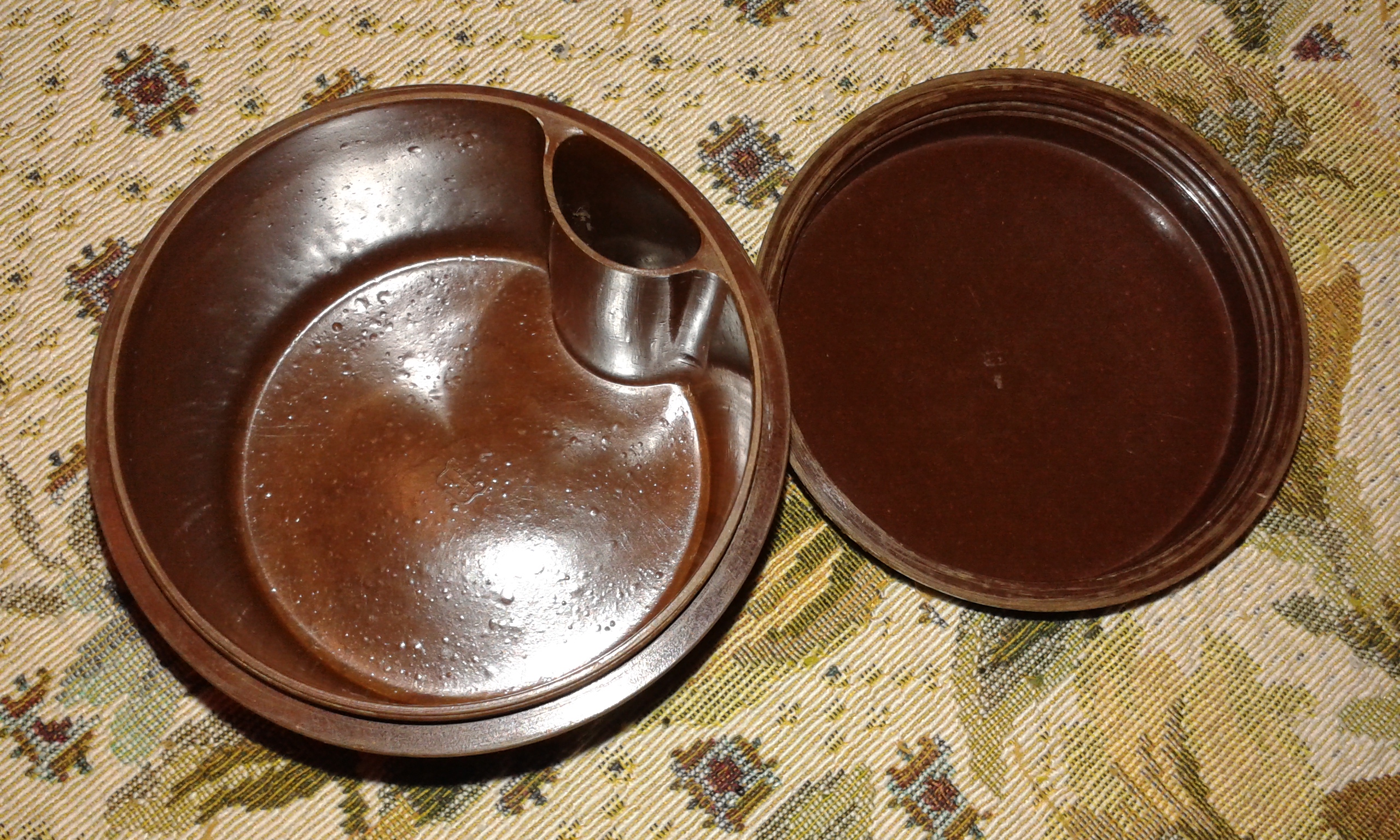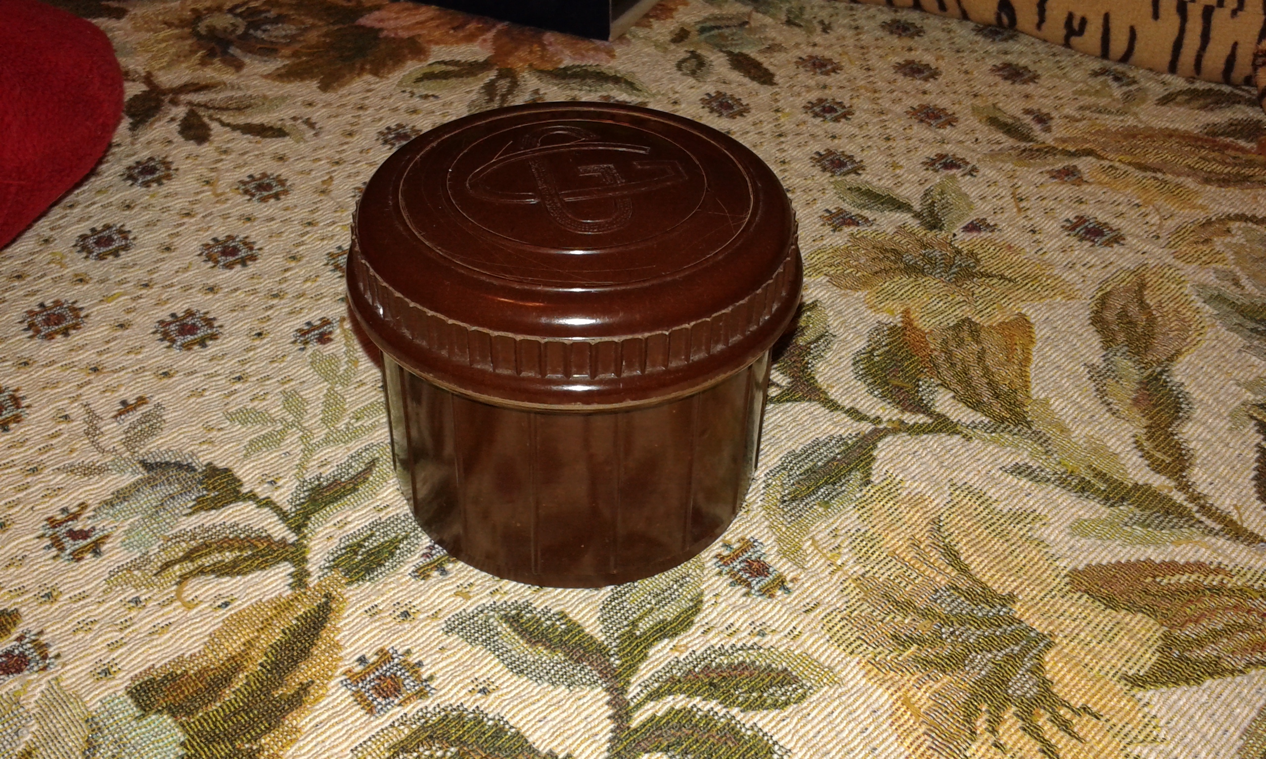 Quelli che ricordo io erano di latta col foro al centro per il pennello, anni 60, questa deve essere antecedente di almeno un ventennio.