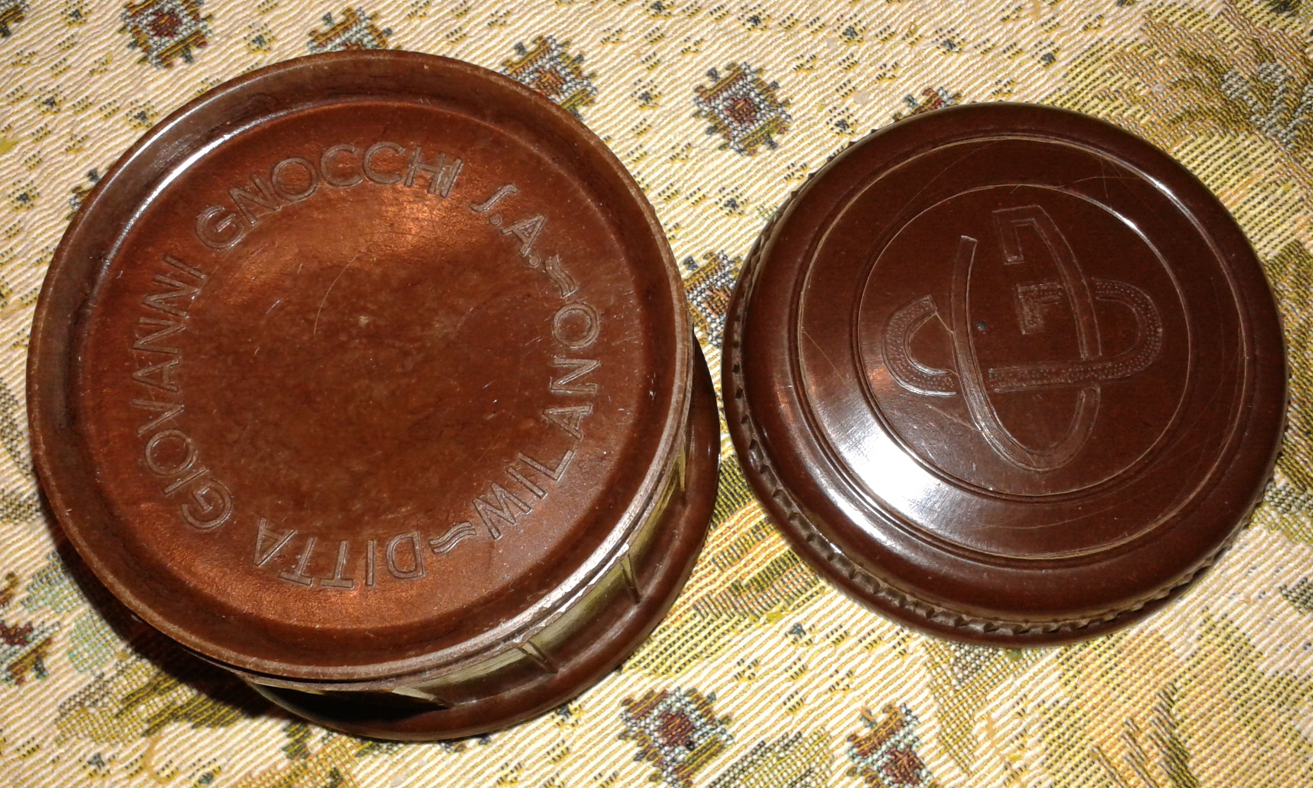 La scatola gnocchi sembrerebbe per la colla da carta, anche chiamata "coccoina" il piccolo alloggiamento era X il pennellino, i suppose