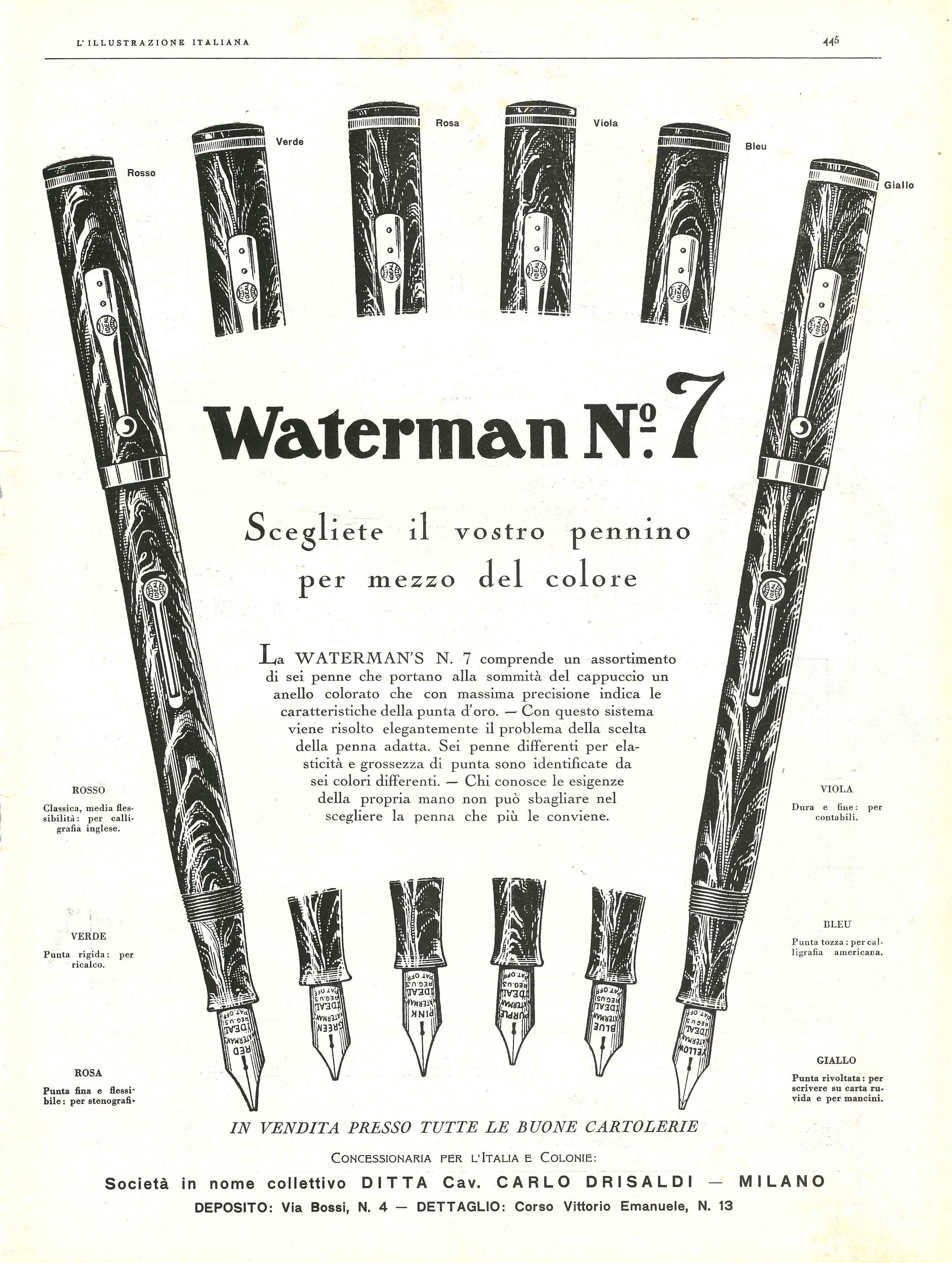 Sempre rimanendo in casa Waterman (noi al calduccio!), ecco una pubblicità del 1929 che ci presenta le splendide N.7. WATERMAN - mod. N°7 - 1929-09-22. L'Illustrazione Italiana - Anno LVI - N.38, pag.445