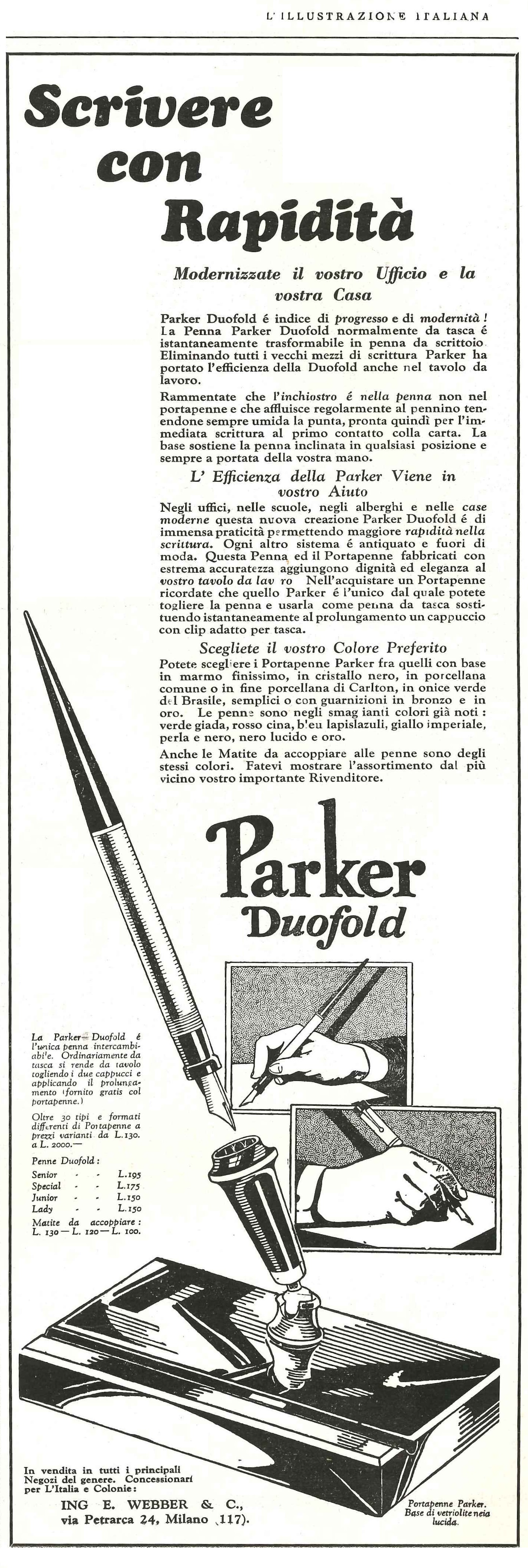 Un salto oltre oceano e troviamo la Parker Duofold da tasca & da scrivania… PARKER - Duofold stiloforo - 1929-09-29. L'Illustrazione Italiana - Anno LVI N.39, pag.482