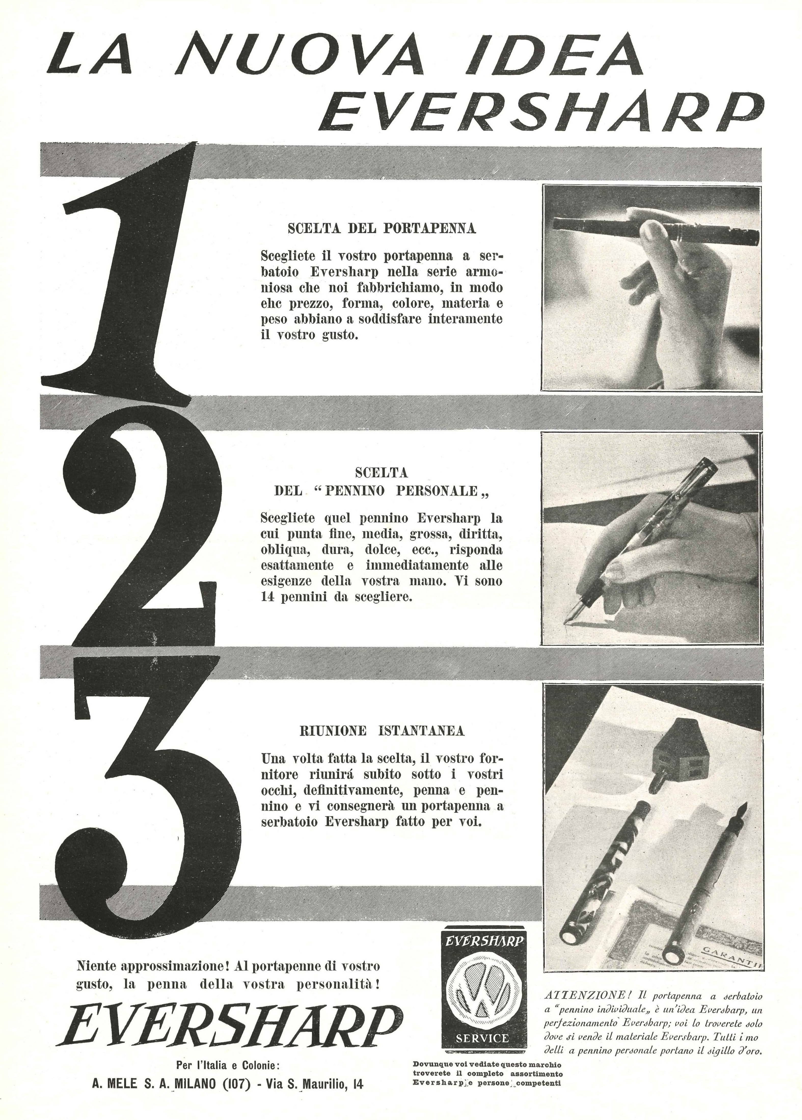 Stessa rivista, solo poche pagine dopo, il gigantesco paginone intero (cm.28x39!) della Eversharp “a pennino individuale” (personal point): c’è persino un’immagine dell’attrezzo usato dal rivenditore per effettuare l’assemblaggio tra la penna (portapenna) scelta ed il pennino preferito tra i 14 disponibili… EVERSHARP - Personal point - 1929-09-29. L'Illustrazione Italiana - Anno LVI N.39, pag.487