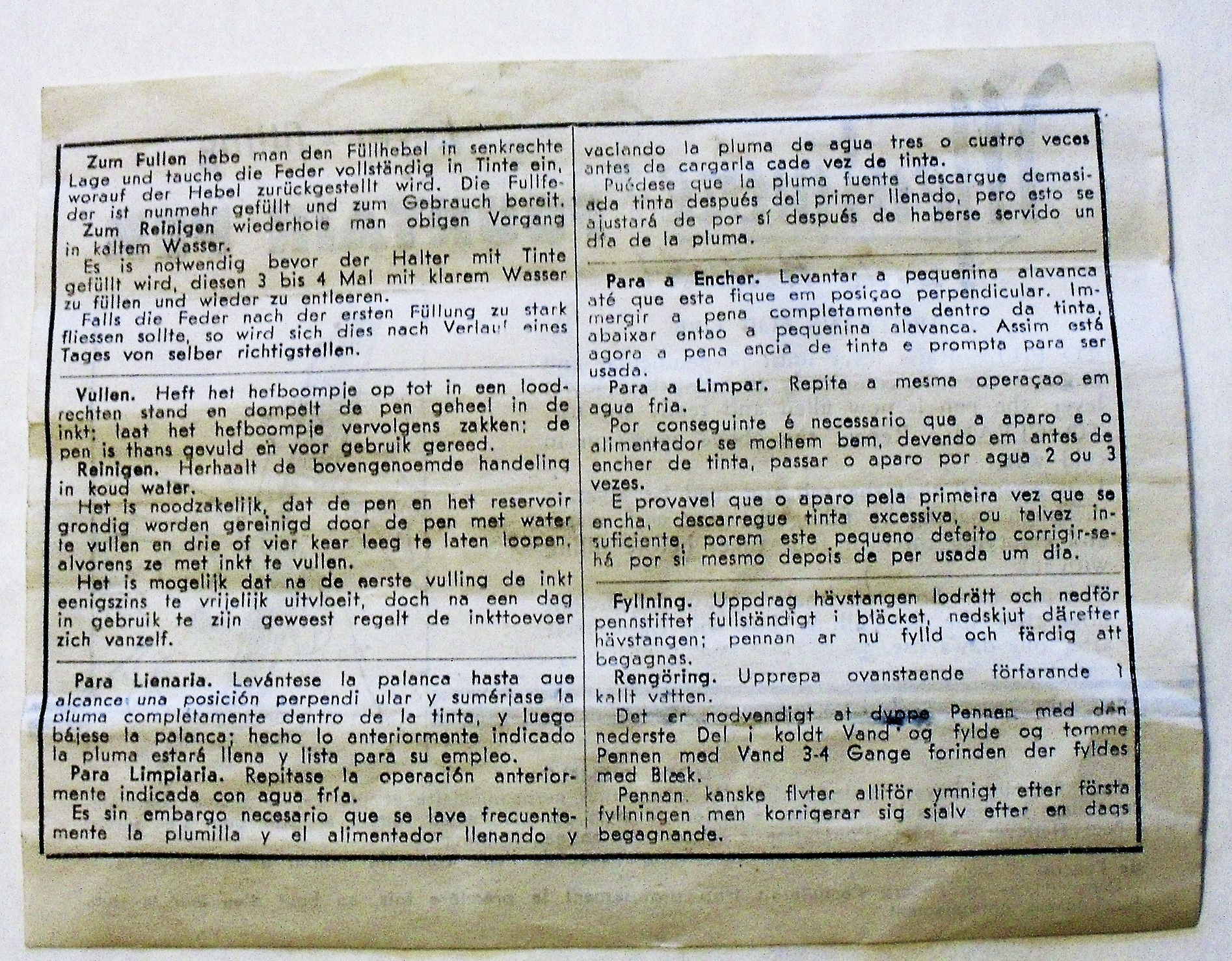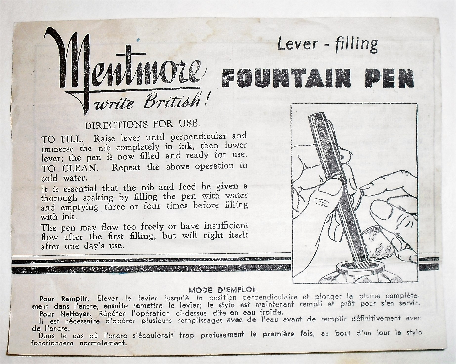 Un piccolo pezzo di carta, ma molto interessante, almeno ai miei occhi. Si tratta del foglietto d'istruzioni che accompagnava negli anni Trenta le stilografiche inglesi Mentmore con alimentazione a levetta. Con tutta probabilità, ne esisteva anche una versione con disegno diverso, dedicata alle penne con alimentazione a pulsante di fondo.