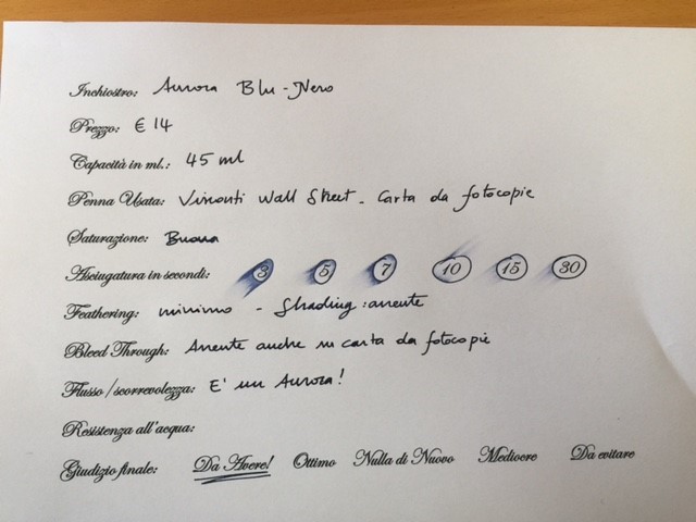 Dopo una ricerca (ancora non conclusa, ho anche postato qualche discussione sul forum) di un Blue-Black che sia tale (Il Waterman Bleu Mysetrious lo sarebbe, se restasse fedele all'inchiostro che tocca la carta...) non sono riuscito a trovare un valido sostituto del Parker Quink BB (troppo vintage per i miei gusti, ma davvero un grande inchiostro). Ecco quindi che ho acquistato senza neanche pensarci la boccetta di BB Aurora, facendo affidamento sulla qualità della Casa. Alle primissime impressioni, è molto simile al Parker Quink, lievemente più scuro. Devo capire, in una mesata, come evolve, e magari lo riporterò anche qui. In ogni caso la scorrevolezza è pari al Parker.