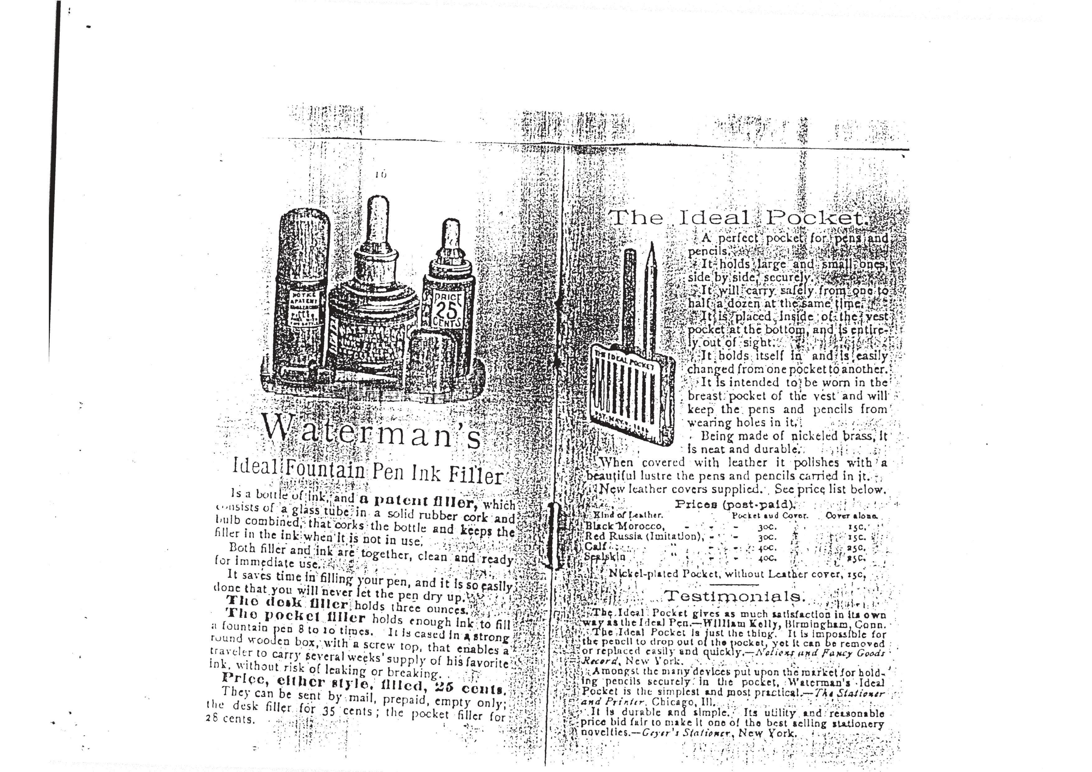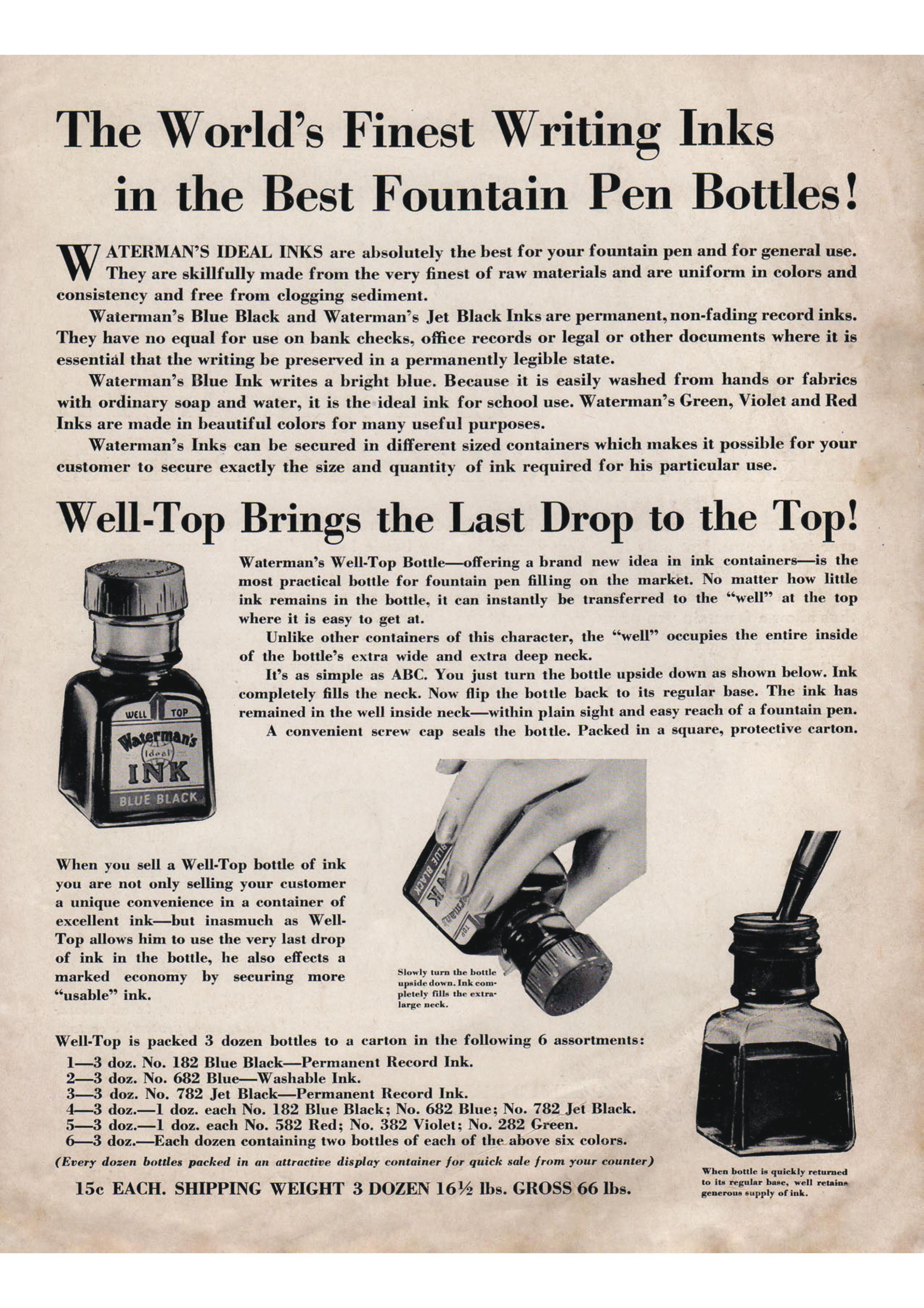 Prima boccetta direi proprio di no: per i primi 40 anni circa la Waterman ha utilizzato il tipo che si vede in questo Catalogo (presunto) del 1892. Sicuramente, tra il 1925 ed il 1928 abbiamo il prototipo ripreso dalla Akkerman che giustamente tu apprezzi. Come puoi vedere, il Catalogo del 1928 la presenta come idea nuovissima.sciumbasci ha scritto:Akkerman, replica della (prima?) bottiglia di inchiostro di WatermanMusicus ha scritto: Ciao!![]()