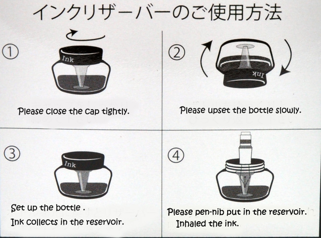 Ed il gioco del ribaltare la boccetta per usare l'inserto a V (usato da twisbi e sailor) si dimostra altrettanto inefficace (più o meno di quanto tempo uno vuole perdere in equlibrismi idrodinamici per farci finire il residuo di inchiostro) quando la boccetta è agli sgoccioli. Il vecchio ink-well della Sheaffer è molto, ma molto più semplice ed efficace.