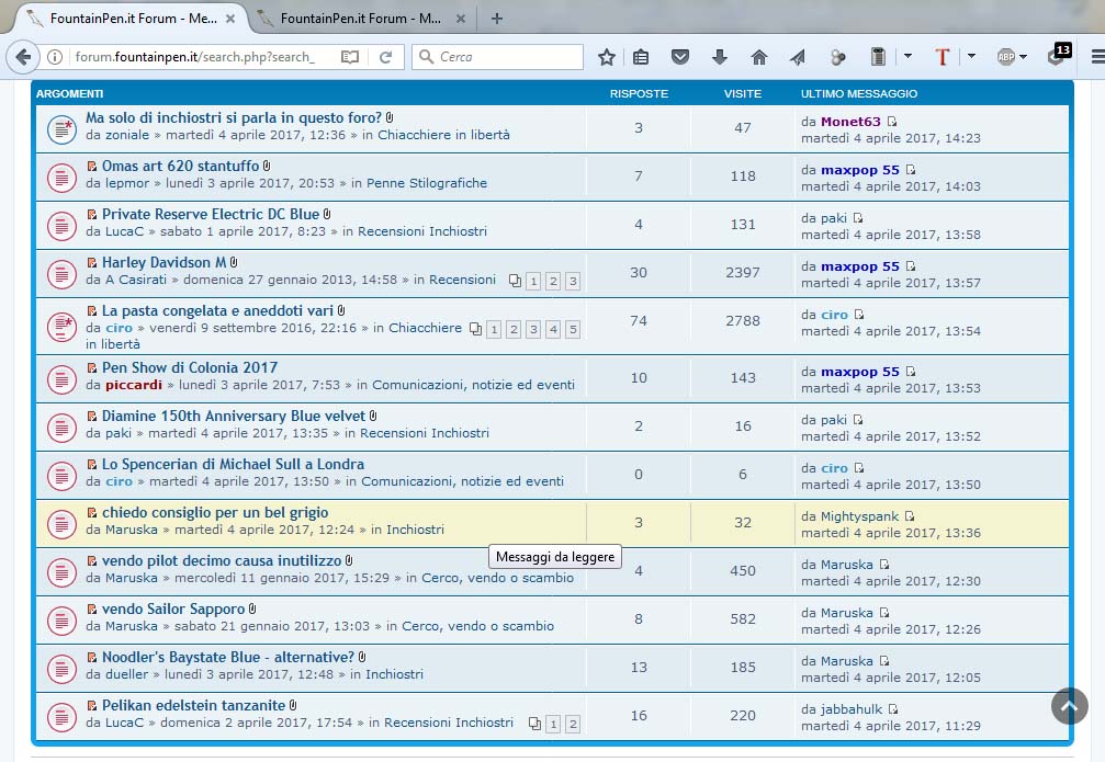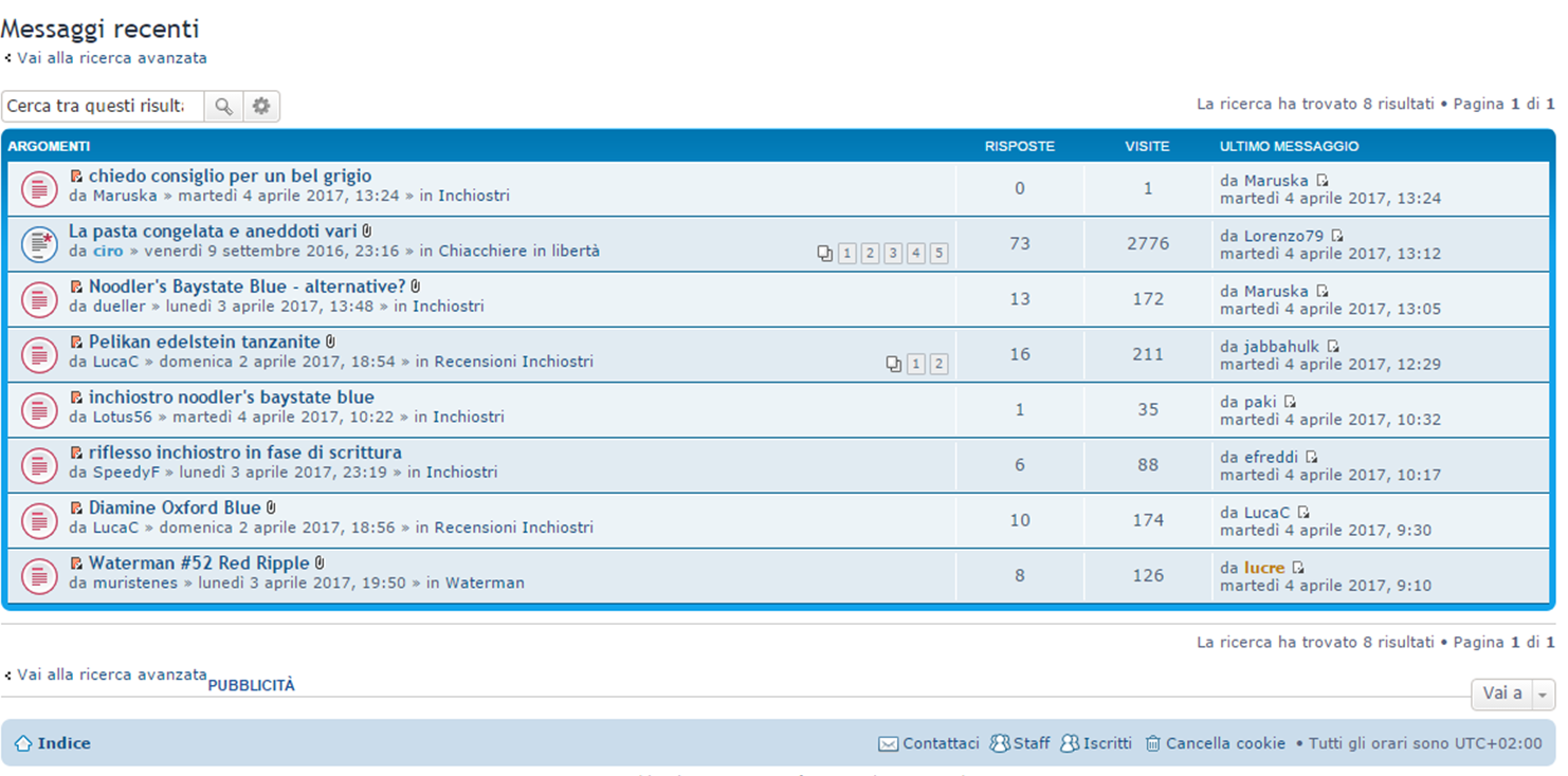 E mi trovo davanti questo panorama desolante: E' mai possibile che di otto discussioni in corso sei riguardino gli inchiostri, una sia di cazzeggio dedicato alle pastiere e solo una riguardi una (pregevolissima) penna stilografica?
