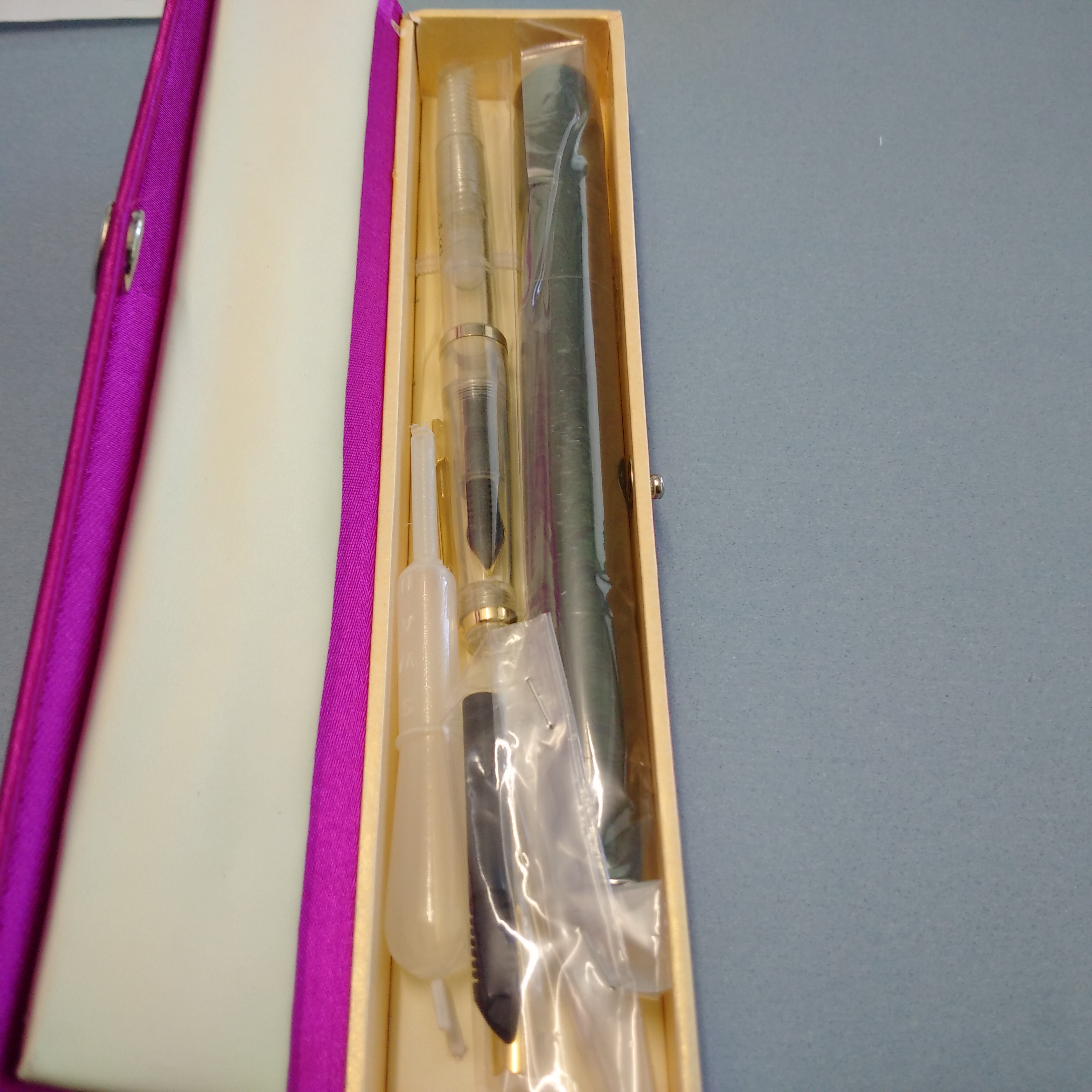 Nella foto con la scatola aperta, dove si intravede anche la penna omaggio, segnalo che trattasi di penna stilografica demonstrator a stantuffo di fattura indiana.