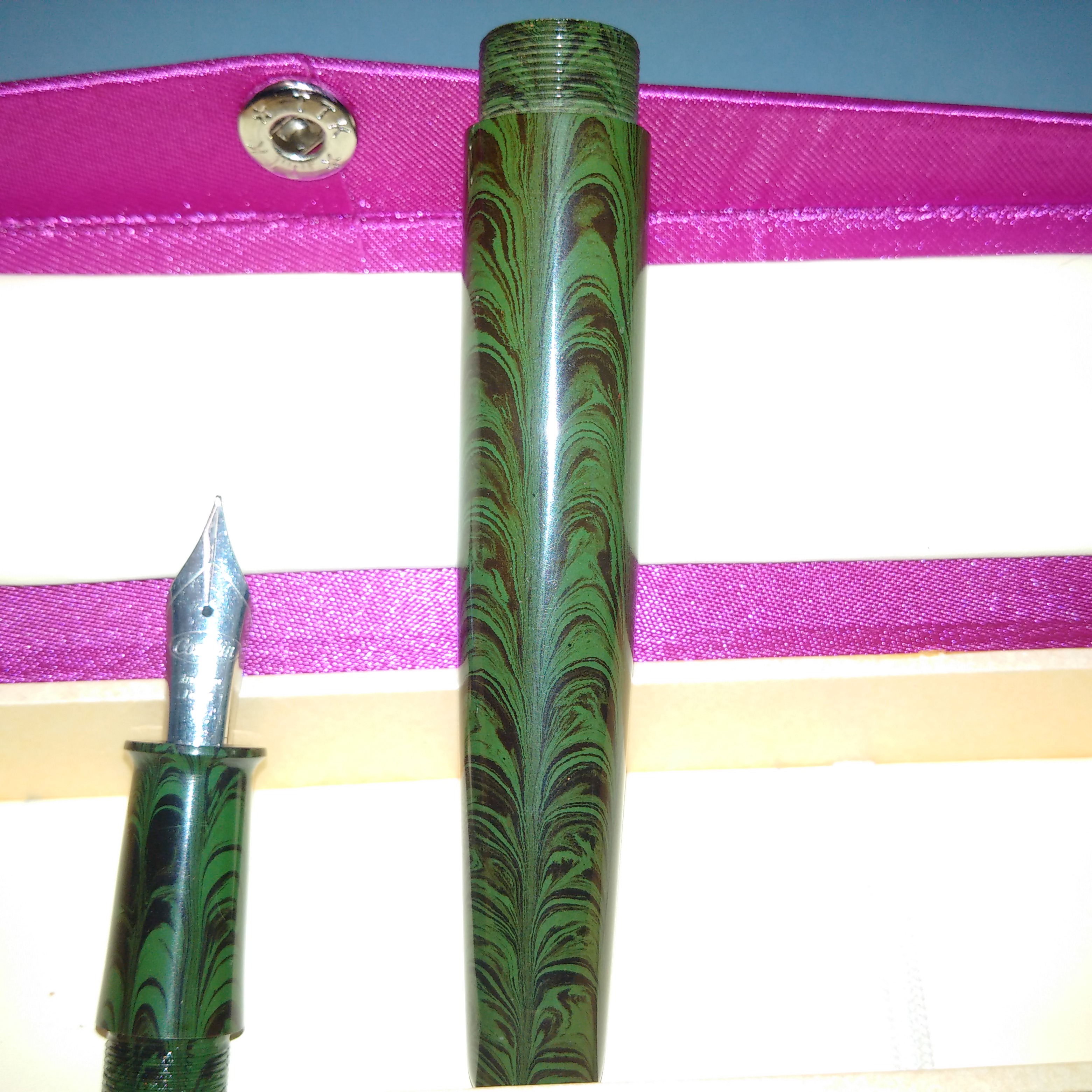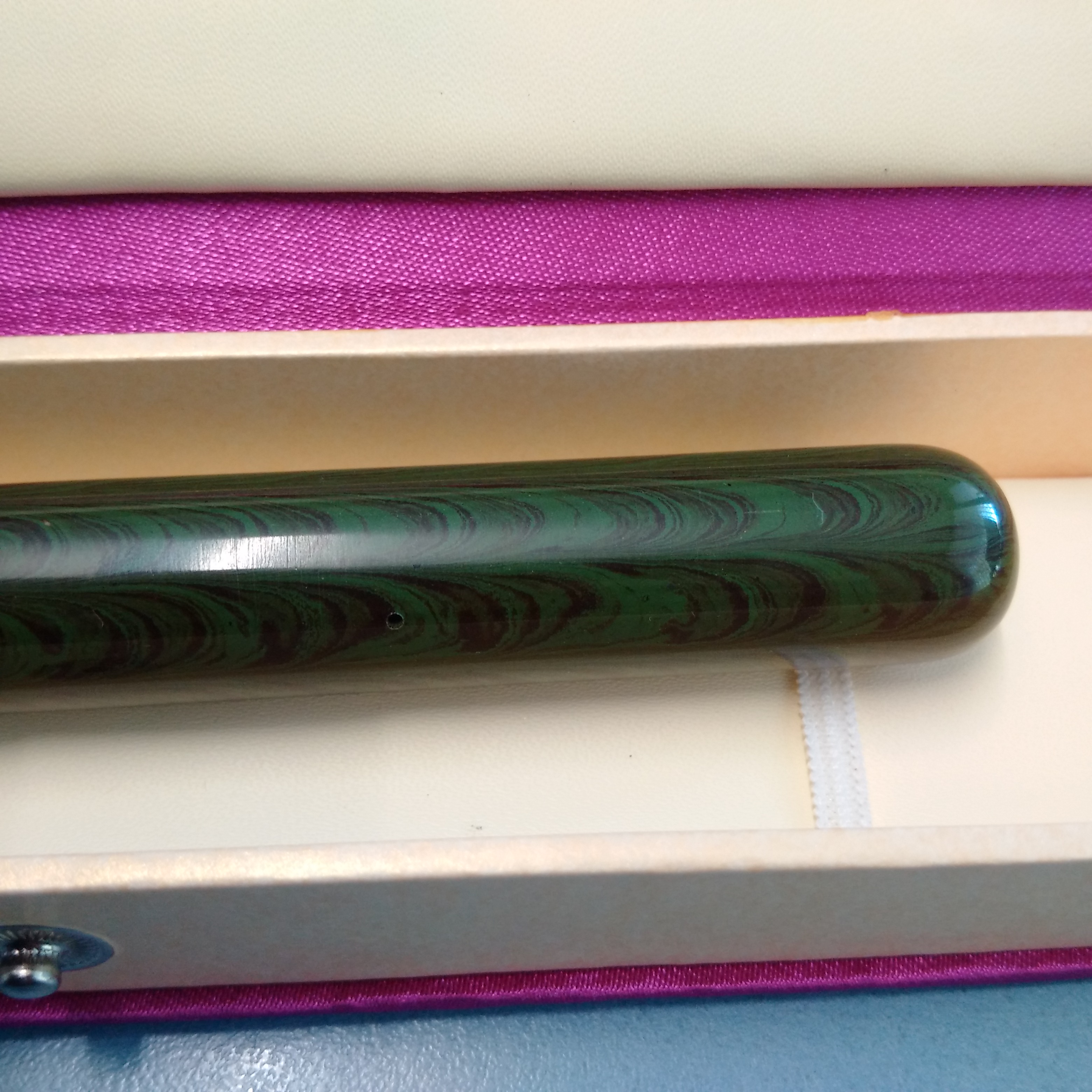 passiamo alle foto io non sono un gran chiacchierone. Questa è la busta di cotone cucita nella quale è arrivata... a sua volta incartata con un giornale indiano con utili annunci di lavoro La scatola è veramente elegante, con all'interno: la penna (eye-dropper) in questione, un pennino f (l'ho richiesto a parte), un contagoccie che ho buttato e una penna in omaggio che devo ancora provare Passiamo alla penna , ha una texture verde oliva ( si poteva scegliere fra diversi colori ) che ho fotografato sia col flash che senza. La penna è gigantesca! il confronto è con una Platinum izumo tagayasan... a sua volta non proprio piccola... In questa foto ho già sostituito il pennino in dotazione con quello F ordinato a parte per pochi € ( cosa che consiglio CALDAMENTE) E questa è la prova di scrittura.