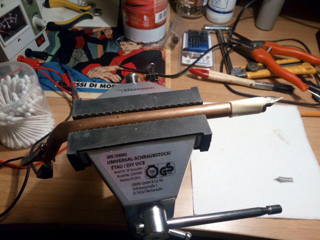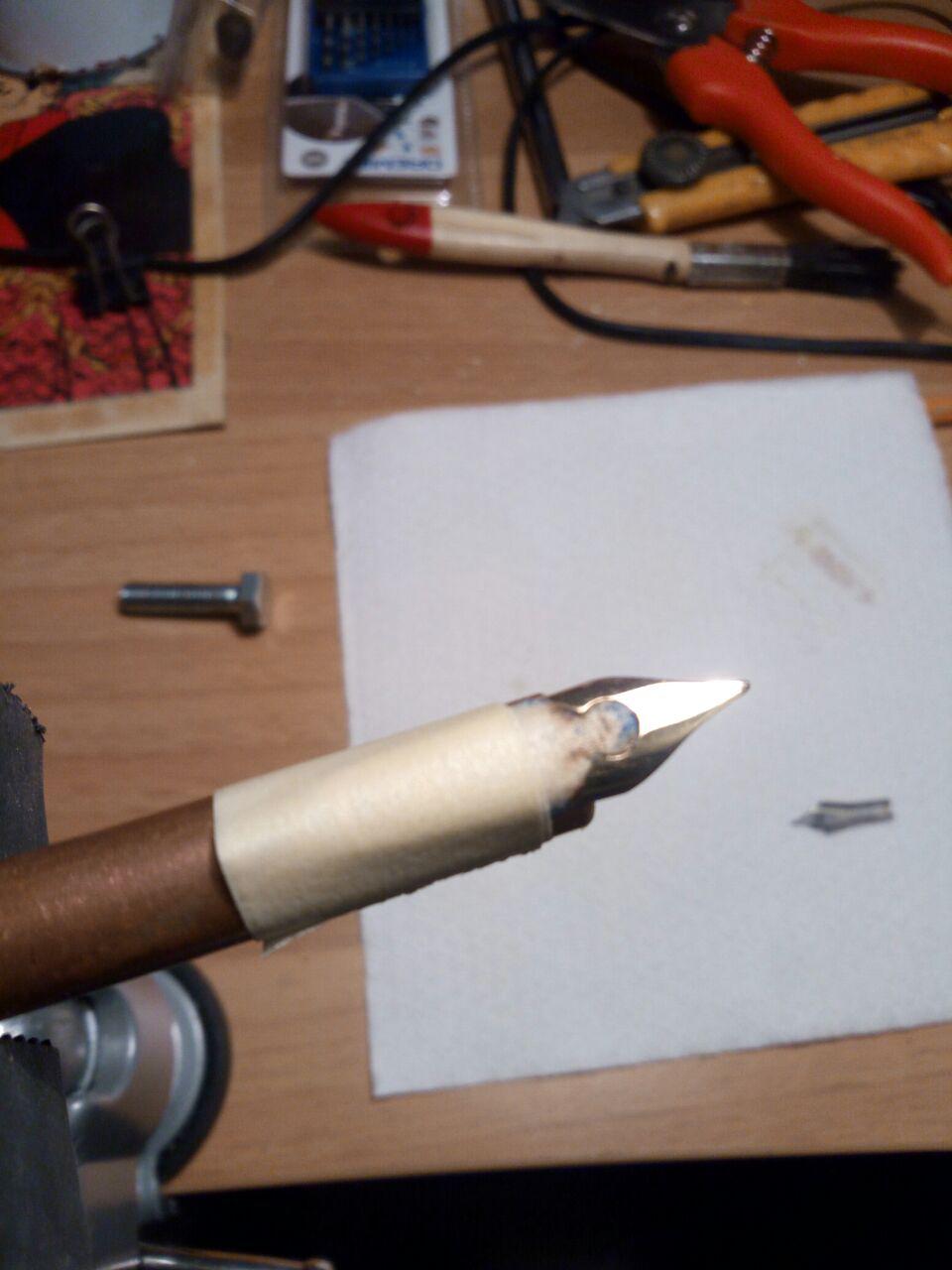Purtroppo le foto col mio cellulare non sono un granchè e mi sono ricordato di fotografare il pennino pre-palladiatura (l'elettrolita rodiato per penna non l' ho trovato) solo con la maschera già su (ed essendo stata la cosa più difficile da fare non la toglievo di certo).