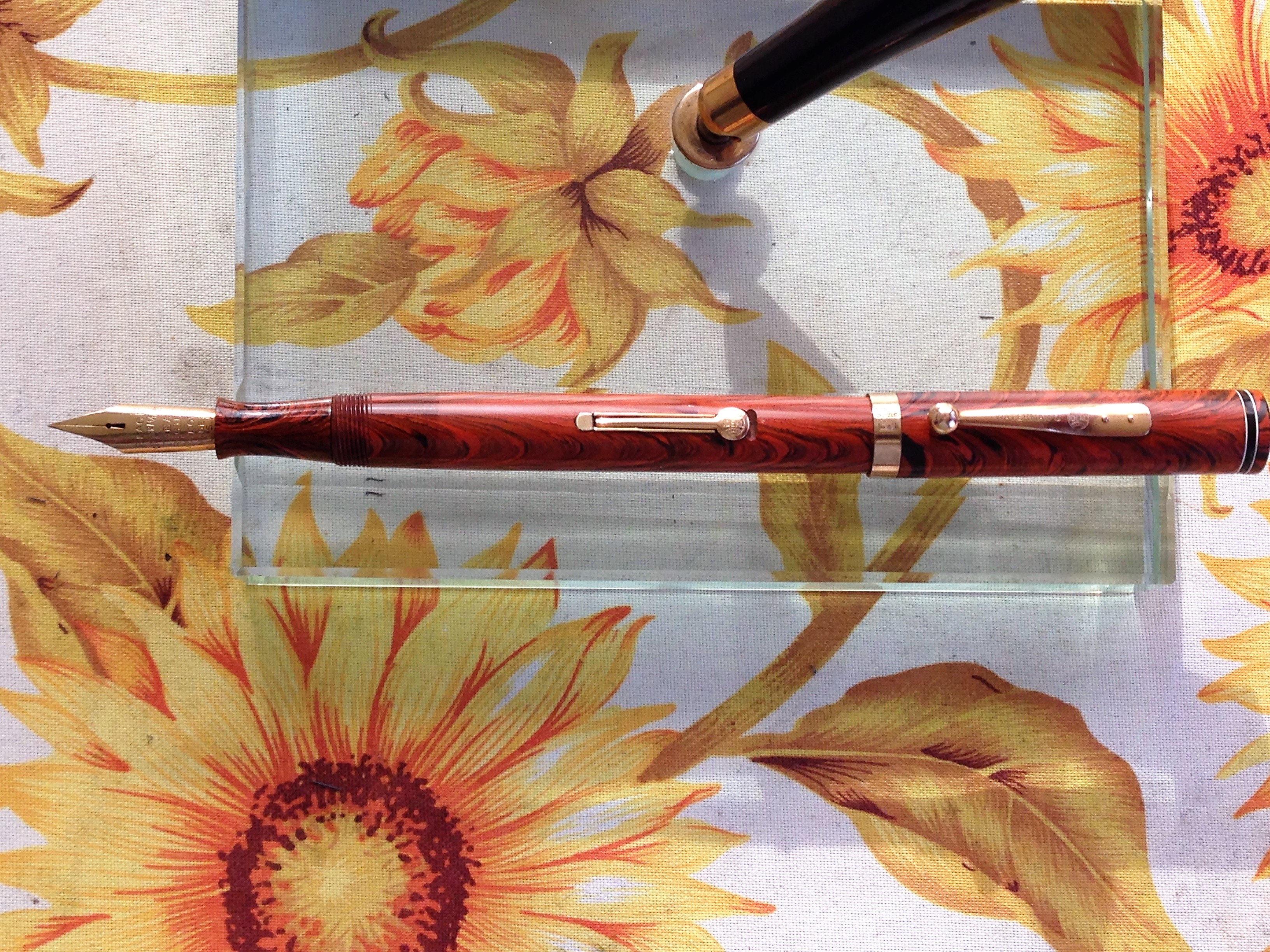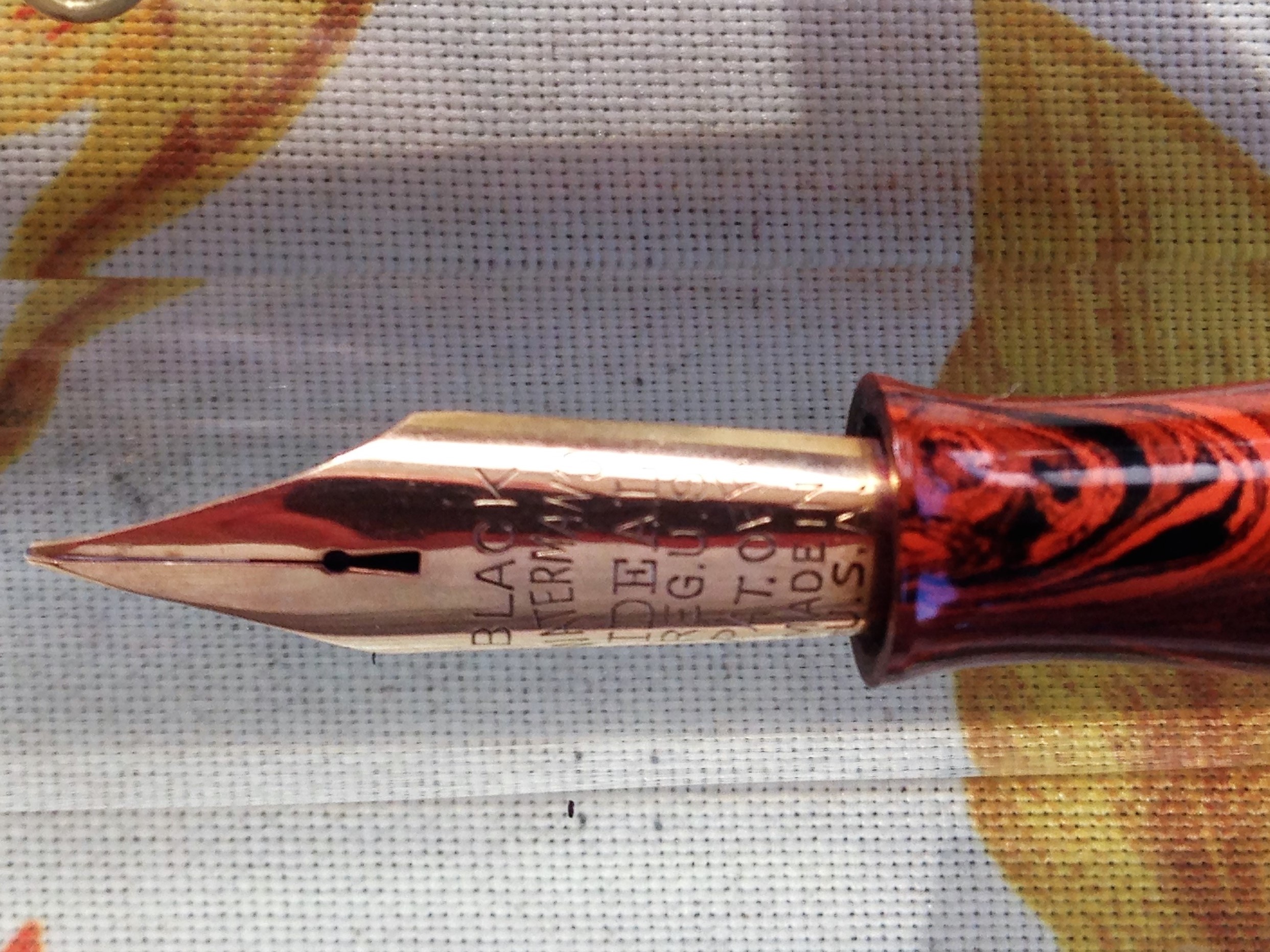 Gran bella penna, ha dei dettagli molto belli: il foro sul pennino a forma di serratura, l'anello nero con i bordi bianchi sul cappuccio, l'alimentatore rosso screziato... E poi hai fatto un ottimo lavoro di recupero. Compliementi!