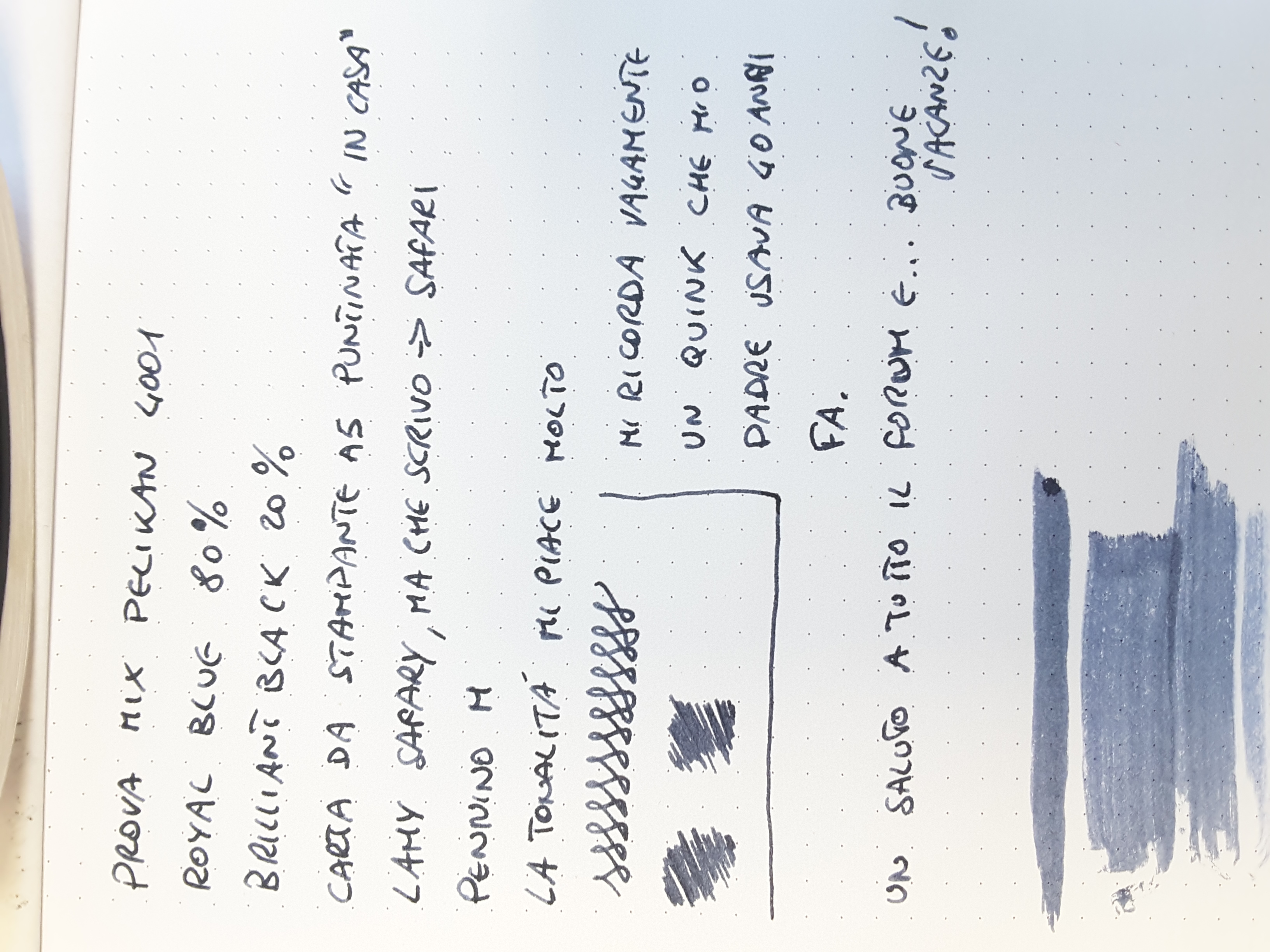 Sono attirato da questi tipi di esperimenti e per curiosita' ho provato a chiedere direttamente a Pelikan se ci sono controndicazioni a riguardo della miscelazione di inchiostri 4001. La risposta che ho ricevuto e' che Pelikan non raccomanda di mescolare tra di loro gli inchiostri della serie 4001.