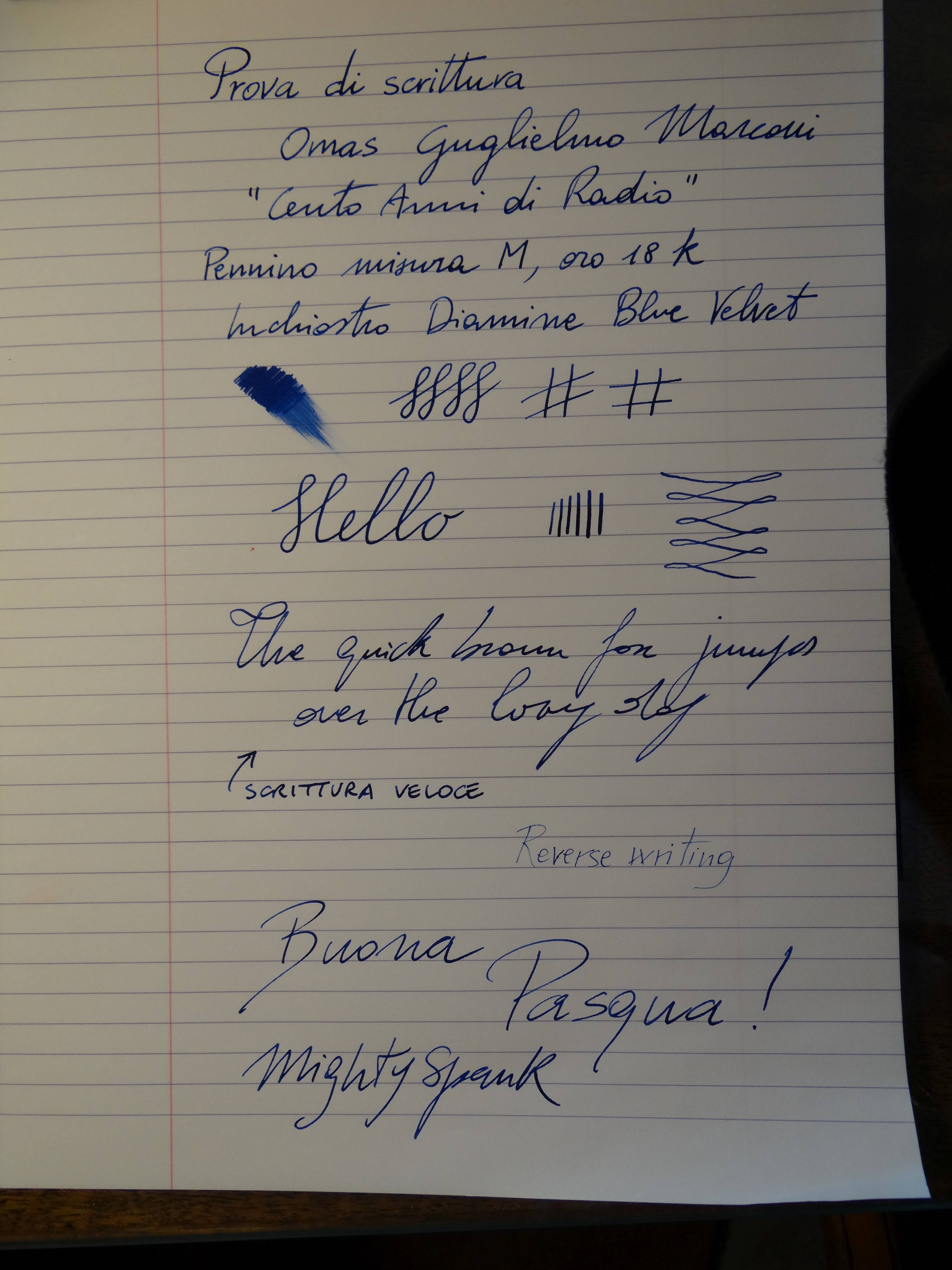 La penna è ben bilanciata, anche con il cappuccio calzato. La scrittura fluida e piacevolissima; ovviamente, essendo un pennino Omas in oro 18 carati, misura media, il tratto è abbondante e succoso.