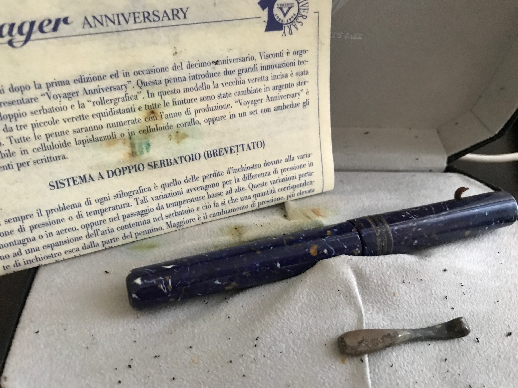 Effettivamente, non è tanto la clip né il meccanismo che mi preoccupano eccessivamente: se non riesco io sicuramente un riparatore (se non Visconti stessa) saranno in grado di riparare il tutto. Quello che mi preoccupa di più è proprio la celluloide della sezione, che si è disintegrata. Che si fa in questi casi, a parte prendere in mano il calendario e per far prima citare il primo di novembre?