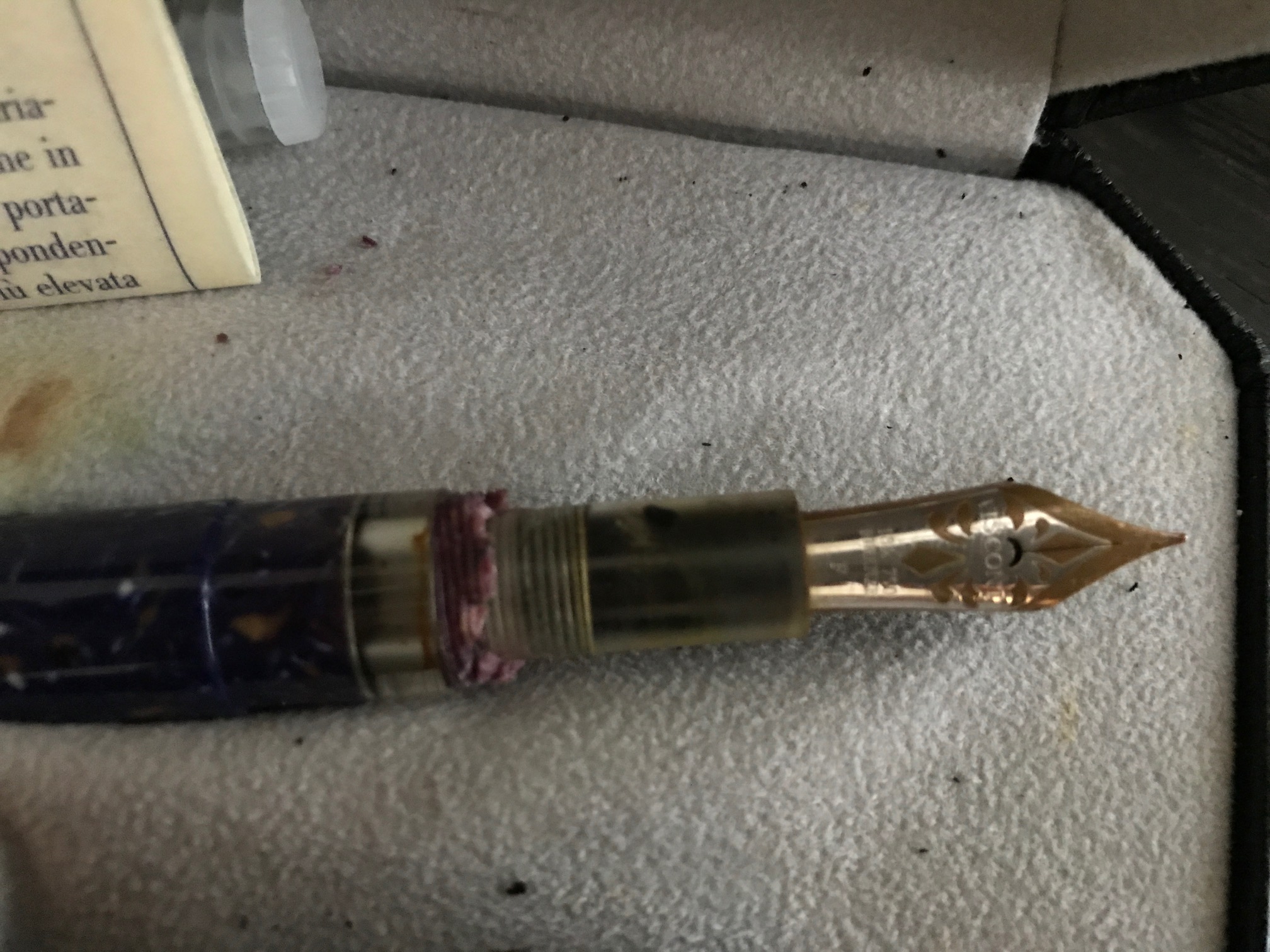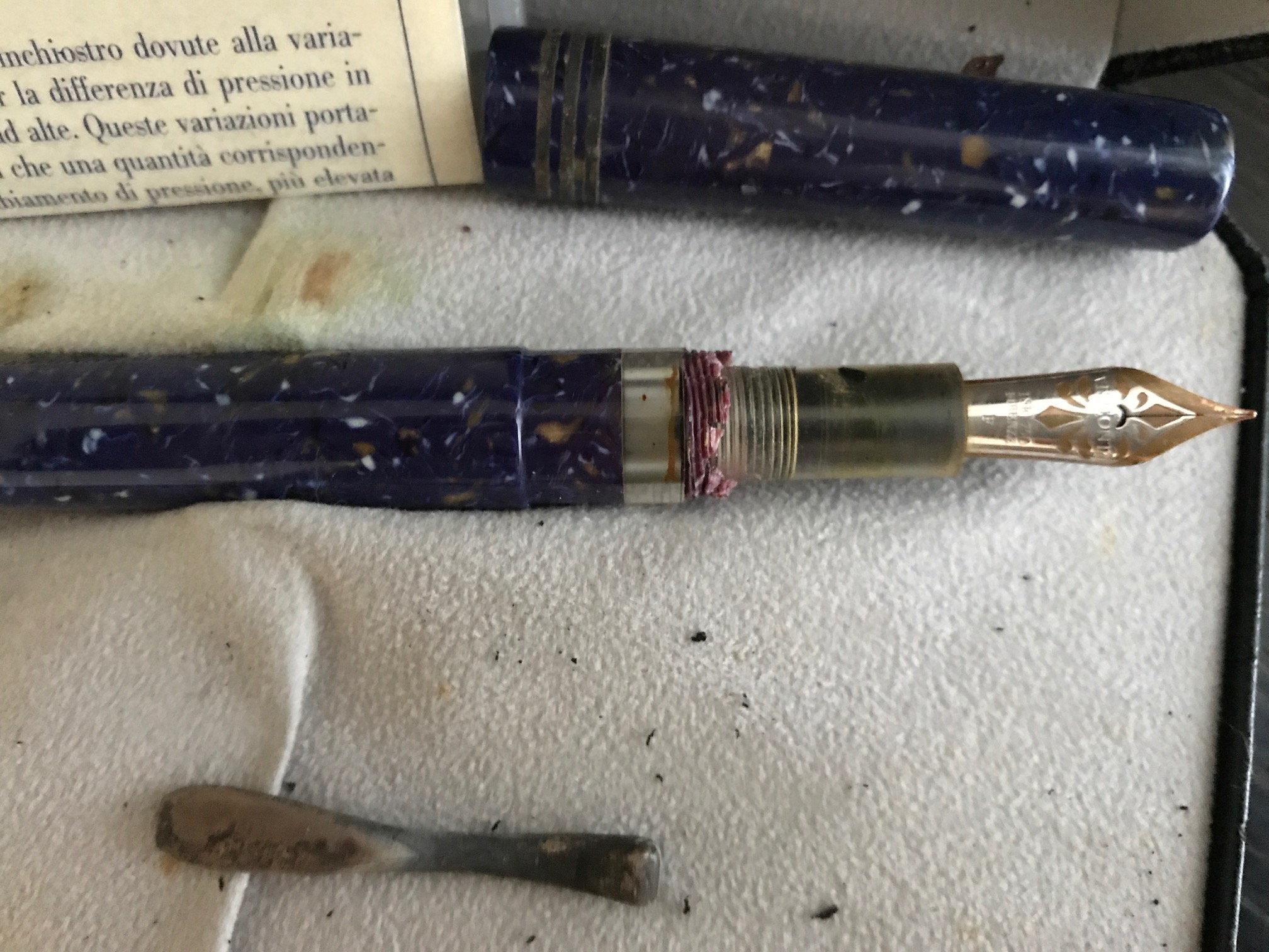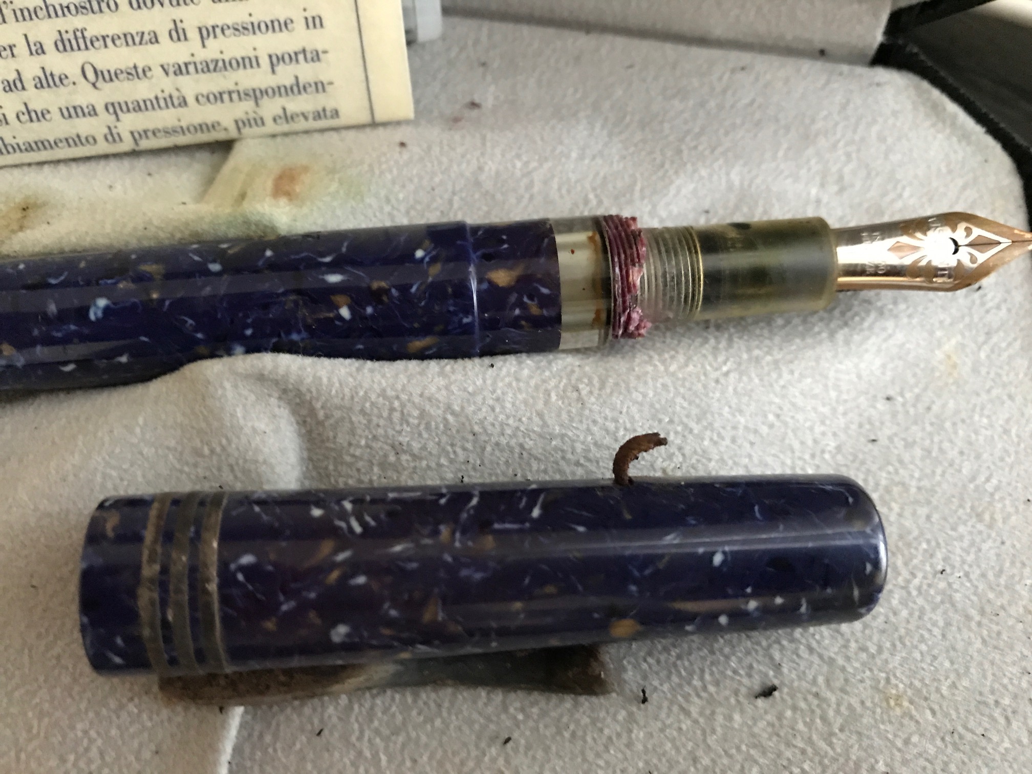 Quando l'ho ripresa, il meccanismo di carica sembrava incollato, la clip era corrosa, e soprattutto la celluloide che ricopriva la sezione si era sfaldata completamente (aveva preso un colore marroncino, se ne vede qualche residuo nelle foto che allego).