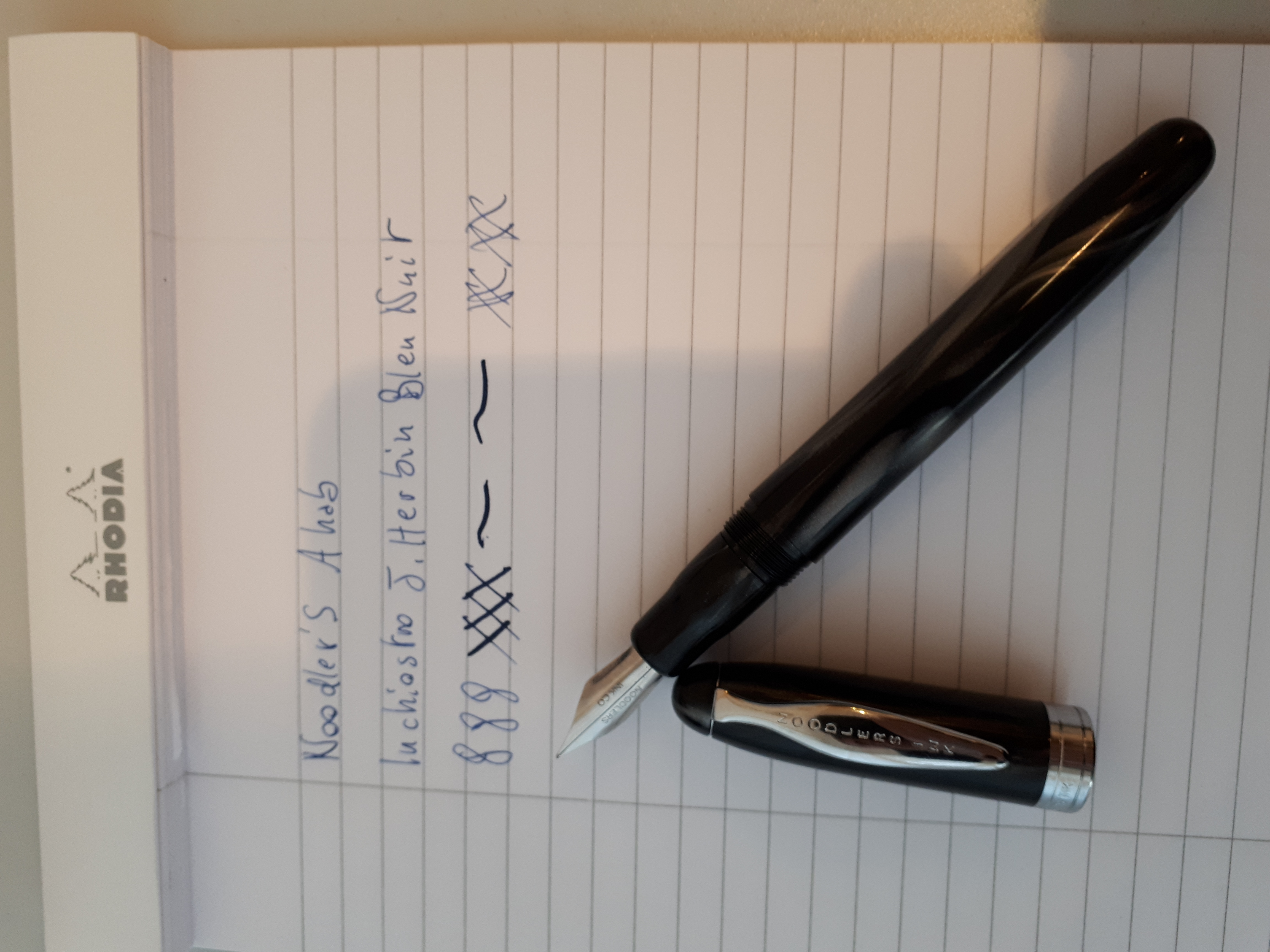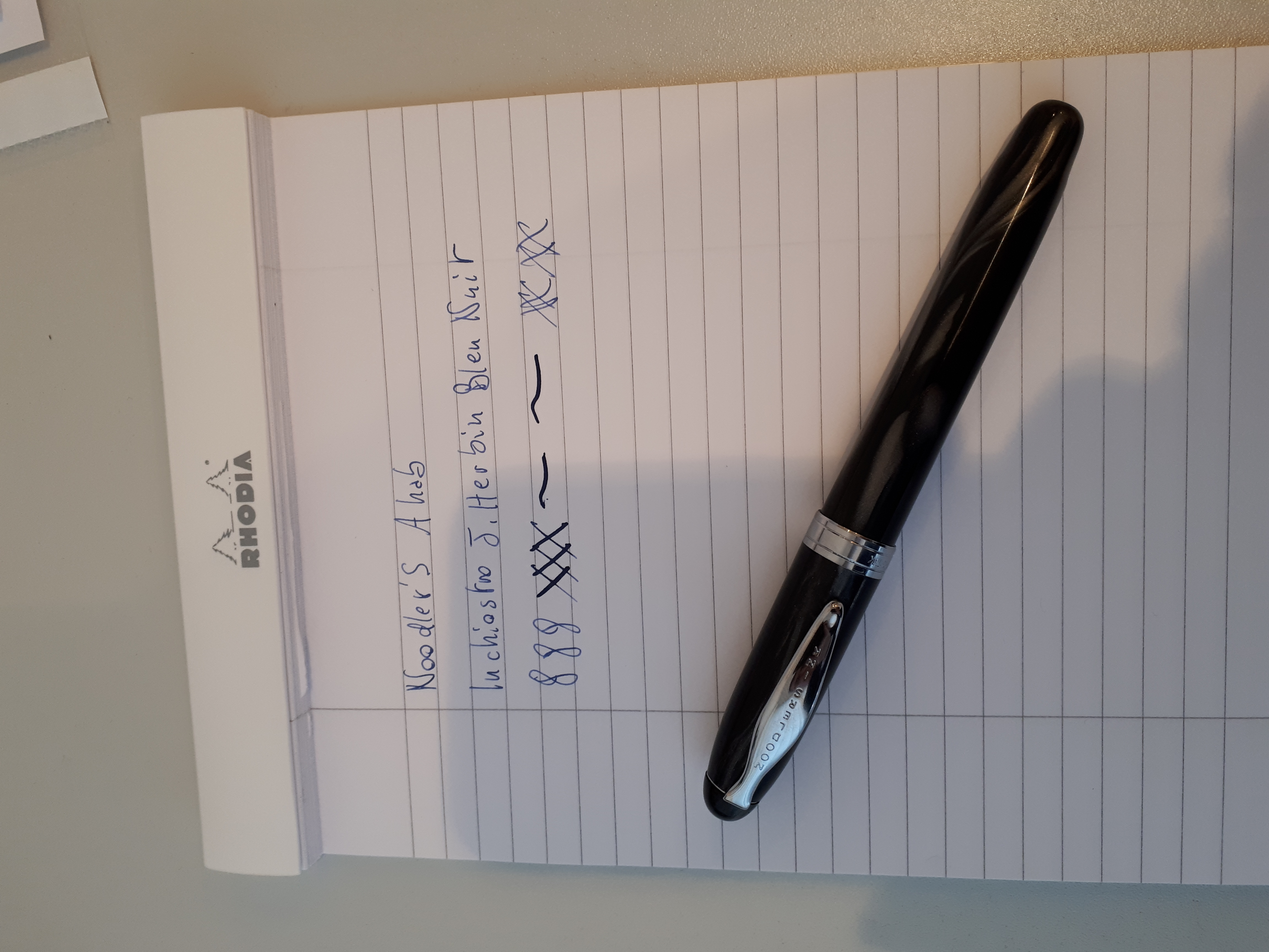 Mi limito a dirvi che la penna è arrivata carica di strane fragranze non proprio gradevoli ma nemmeno troppo cattive, e che ho seguito le istruzioni facendo un bel lavaggio. La penna è tutta smontabile, come si sa, io ho preferito lasciarla con il sistema di riempimento a pistone. L'ho infine caricata con l'Herbin Bleu Nuit e la Ahab è partita subito, rilasciando un tratto piuttosto fine se si scrive normalmente, e decisamente più lago premendo sul pennino, cosa che comunque non farò perché mi basta la scrittura normale. Per ora nessuna falsa partenza, nessuna indecisione, nessun problema. Una penna da provare, secondo me, considerando il modesto impegno finanziario. Piccola avvertenza: cliccando sulle foto le stesse si raddrizzano.