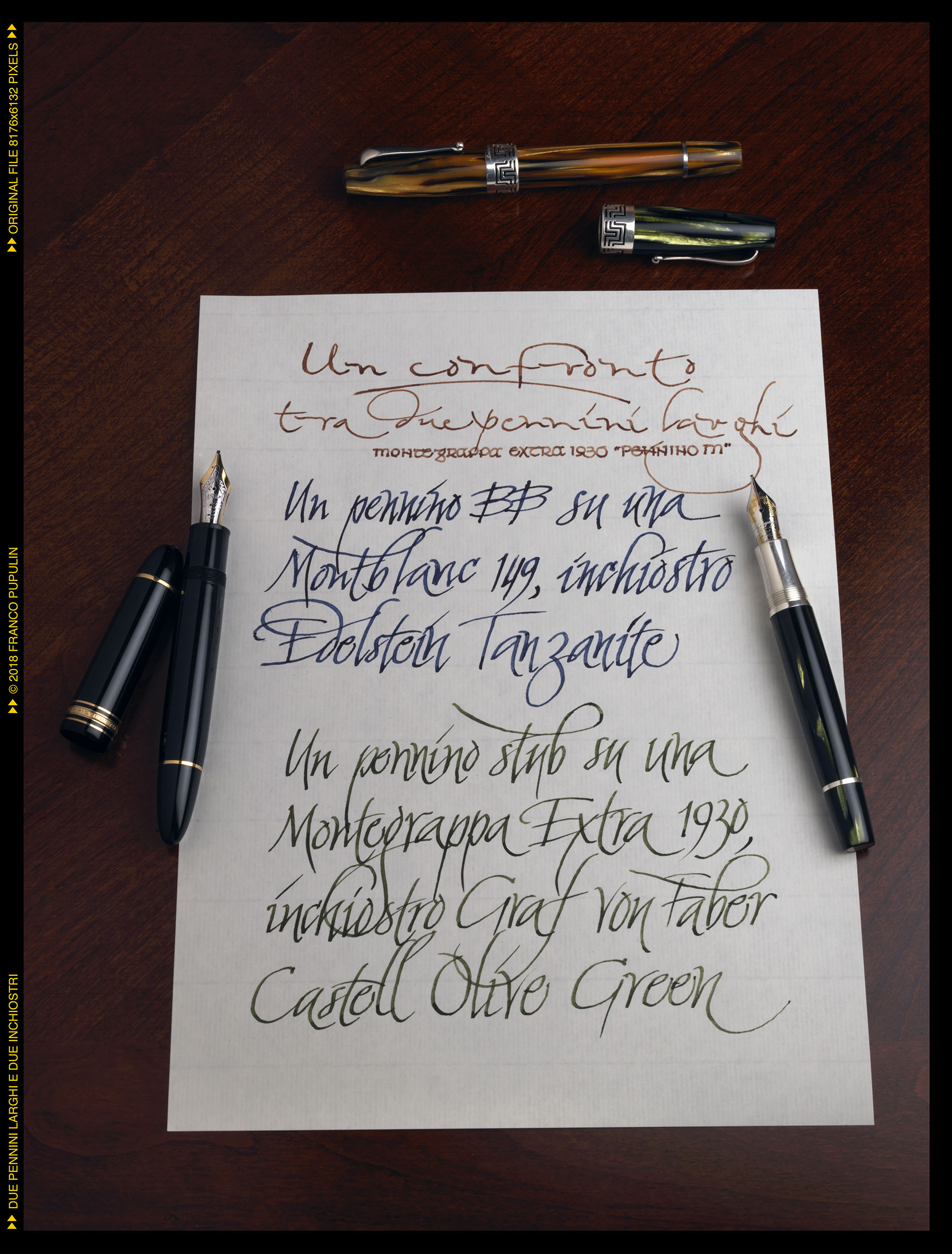 Ho voluto provare la gestuale con due dei miei pennini non-calligrafici piú larghi ed espressivi. Il doppio largo di una Montblanc Meisterstück 149 (circa 1984-1985) e lo stub di una Montegrappa Extra 1930 (contemporaneo).