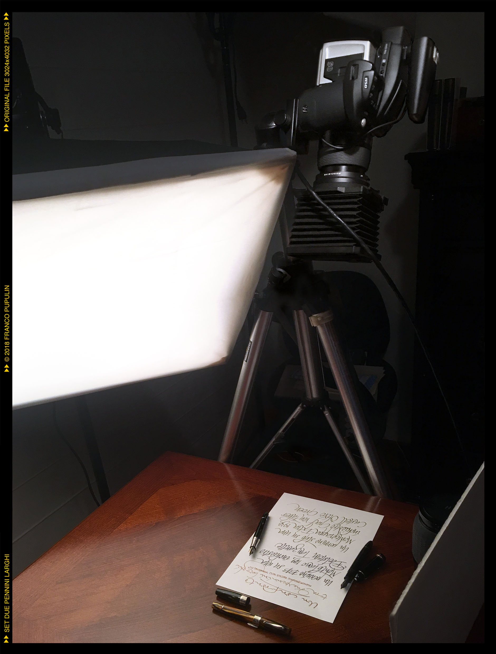 Infine: la foto. Il set é davvero semplicissimo, una luce aperta e diffusa laterale, dalla destra, e un pannello riflettente (bianco) sulla sinistra. Qui ho usato un flash da studio, perché era già notte, ma lo stesso effetto si ottiene di giorno con una finestra schermata da una cortina chiara. La camera é in alto, in modo da ridurre un eccesso di effetto prospettico. Quest’ultimo può eliminarsi con una ripresa assiale, ma le foto che ne risultano sono, secondo me, un po’ prive di vita vera, per quanto in stato di quiete (still life).