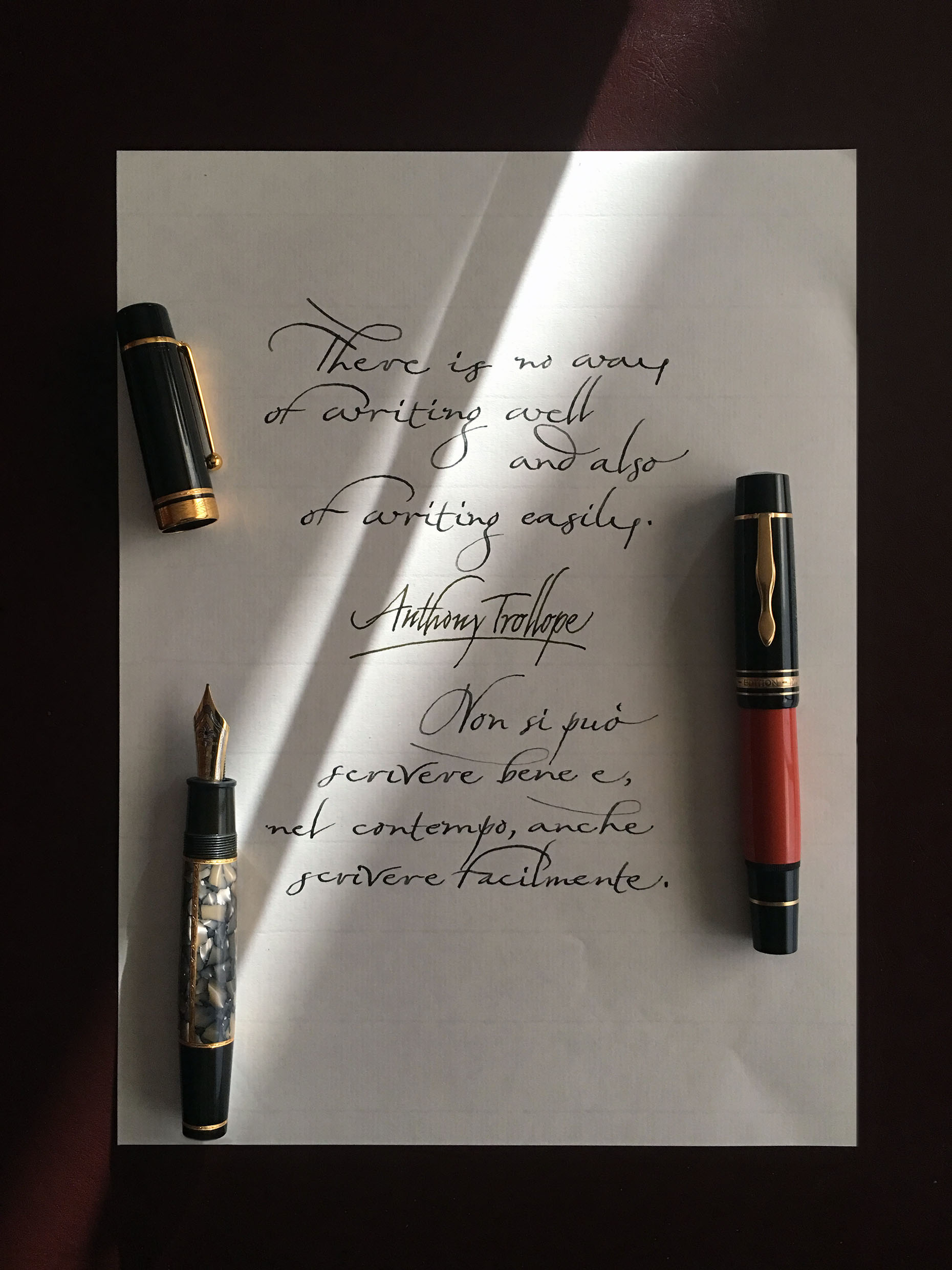 Le righe superiori sono scritte con il pennino medio di un’altra Extra 1930, docile, duttile, educato, collaborativo e facile. L’inchiostro é un Noodler’s #41 Brown, un nome veramente poco suggestivo, in un’epoca nella quale gli inchiostri hanno bei nomi da far invidia ai profumi… La grafia é un'altra delle varianti della gestuale proposte da Godfrey-Nicholls.