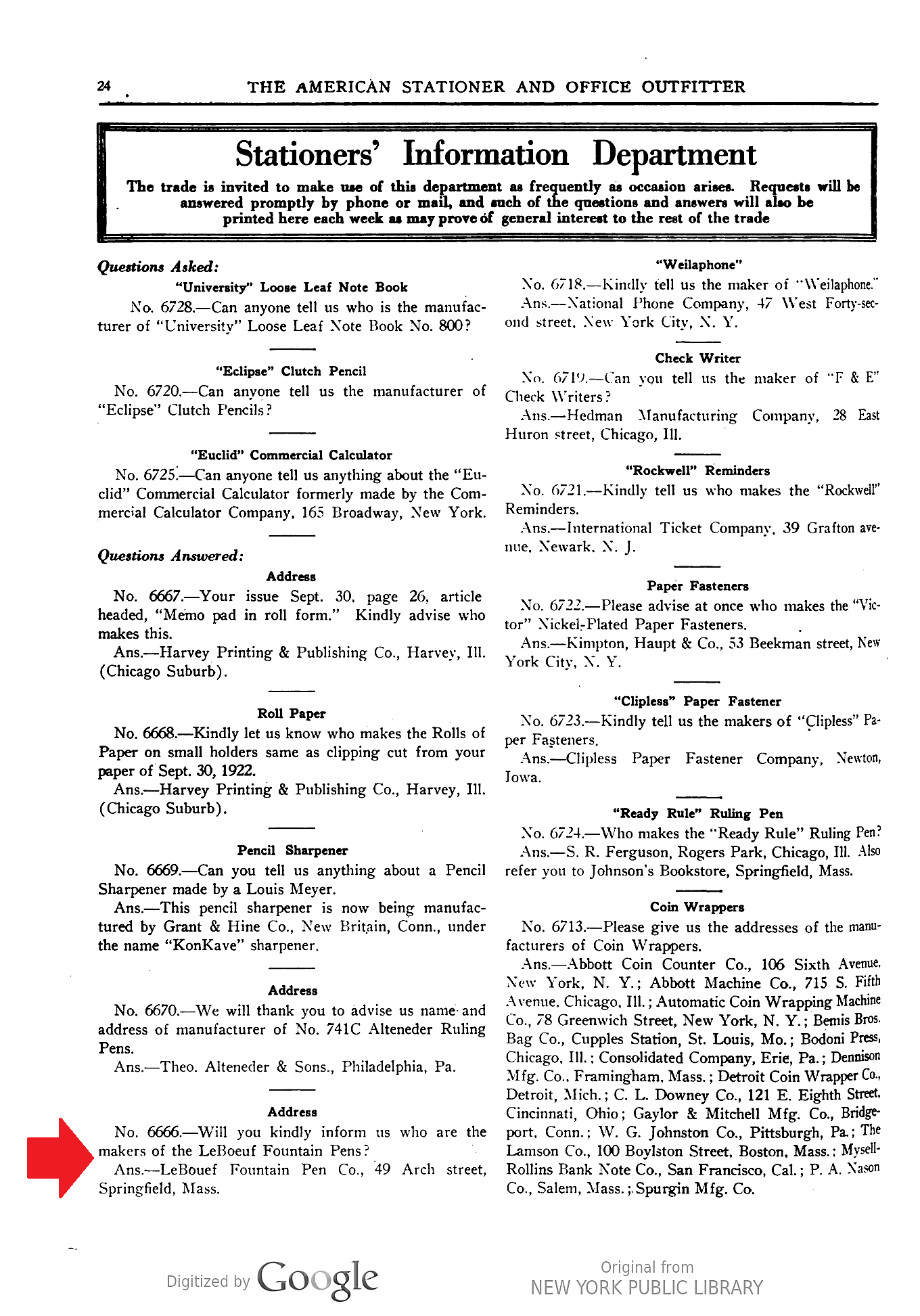 La LeBoeuf Fountain Pen Co fu fondata nel 1921 a Springfield, Massachusetts, all'indirizzo di Arch Street 49, come risulta da questa pagina dell'American Stationer del 16 Dicembre 1922