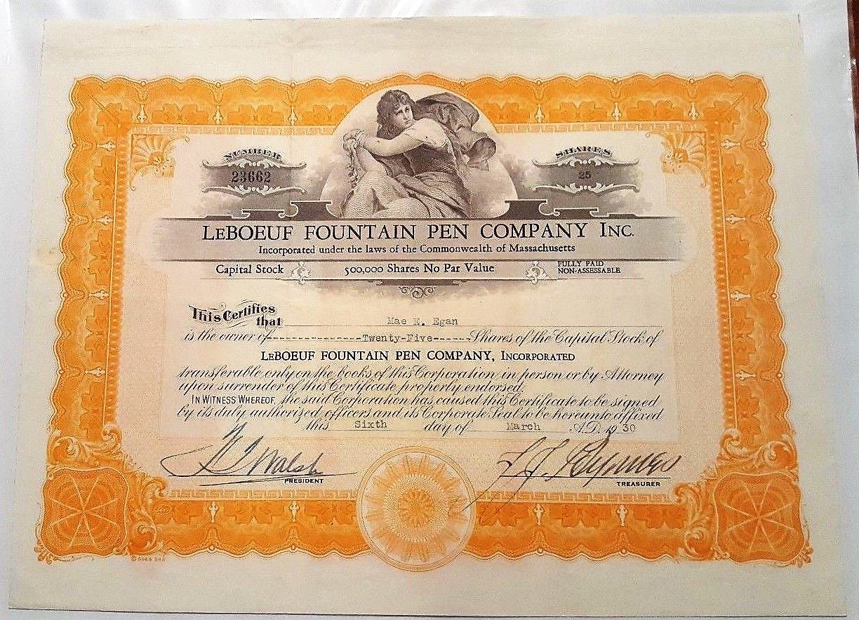 Complimenti (in ritardo) per la gran bella penna e l'altrettanto bella presentazione. Le LeBoeuf sono penne di gran qualità, poco conosciute da noi, ma apprezzatissime negli Stati Uniti. E molto interessante anche il certificato azionario, è il primo che entra nel wiki !
