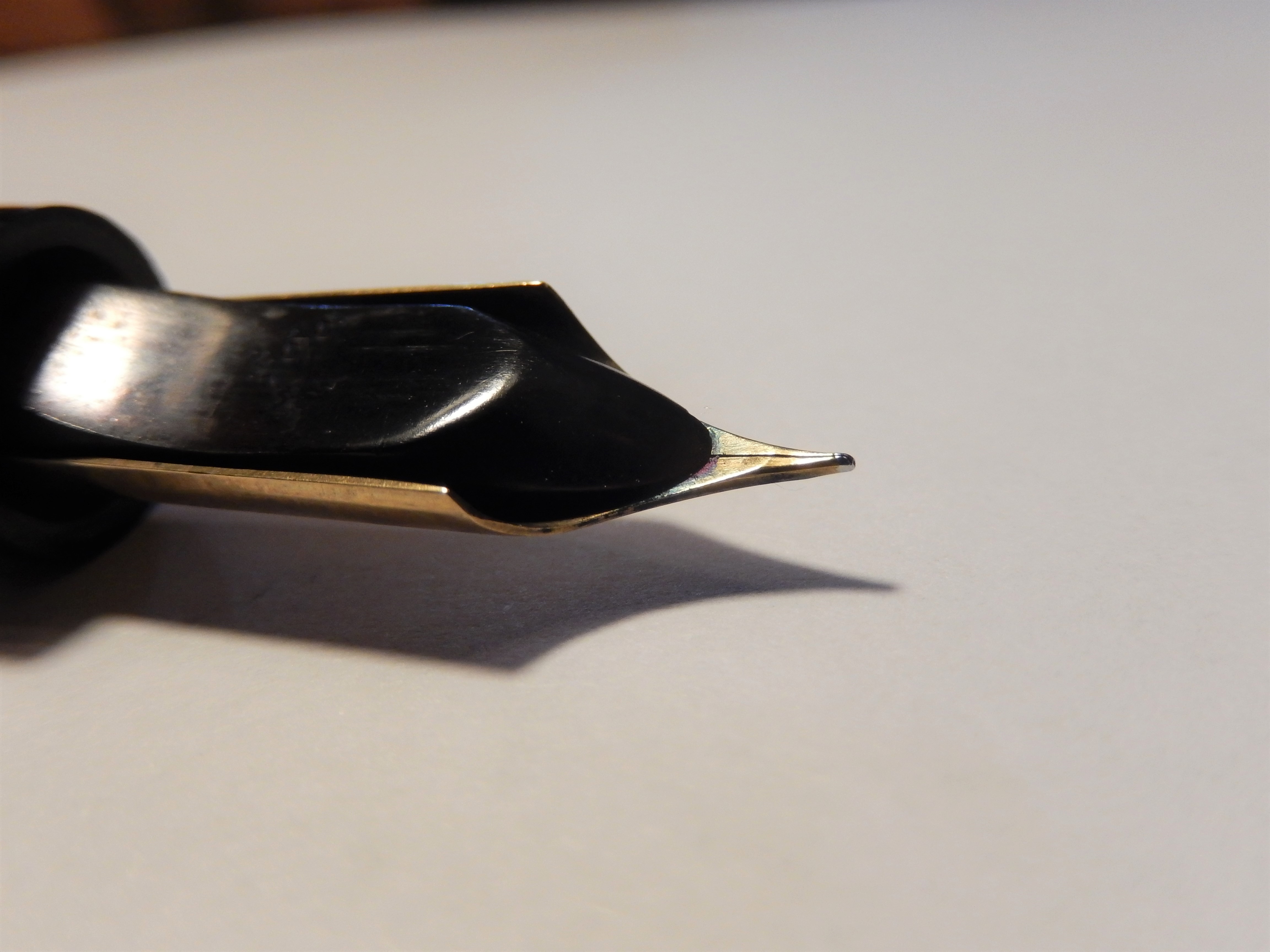 La sezione conica , che si allarga come una coppa verso il pennino, è l'unica parte della penna non colorata ma nera. Alimentatore liscio e leggermente concavo nella parte centrale, come tipico del marchio. Il pennino , un n. 8 di grandi dimensioni, riporta inciso su quattro livelli "LeBoeuf/Springfield/Mass./8 ", con sovrastante foro di areazione a cuoricino. Trattasi nel caso specifico di una punta fine di contenuta flessibilità, con una adeguata presenza di iridio che, grazie anche al perfetto bilanciamento della penna, garantisce una scrittura morbida e piacevole. Anche riutilizzata a distanza di giorni la penna non manifesta esitazioni o false partenze[attachment=0]10.JPG[/attachmentf