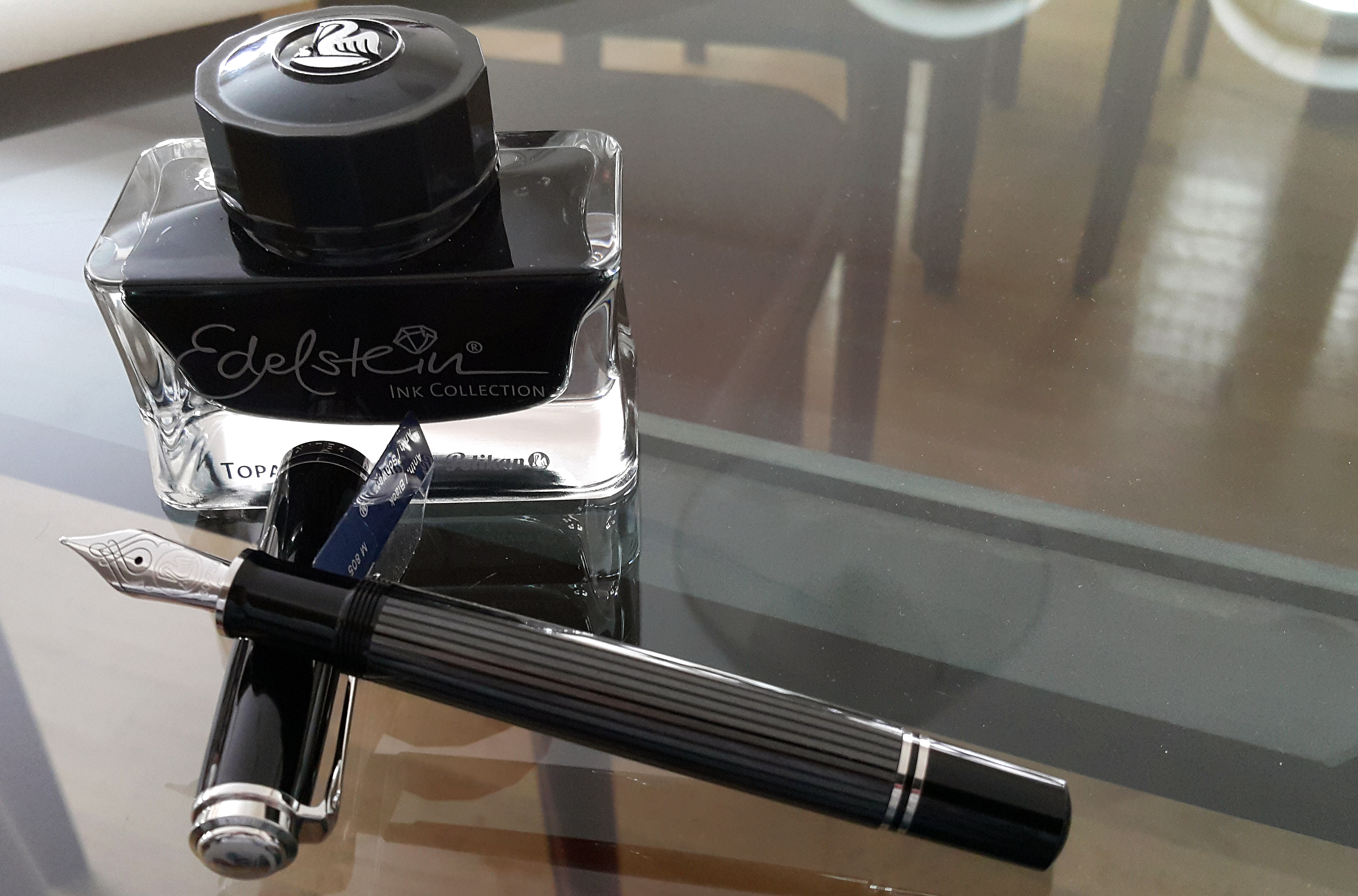 Questa è la mia seconda penna Pelikan. Una M805 antracite-nero, Stresemann, con pennino "F". E' una penna meravigliosa, il peso è ideale e scrive molto agevolmente. Ho anche ricevuto come un regalo un inchiostro Pelikan Edelstein Topaz, ma per ora uso il Platinum Blu - nero che sembra più appropriato per questa bella penna !
