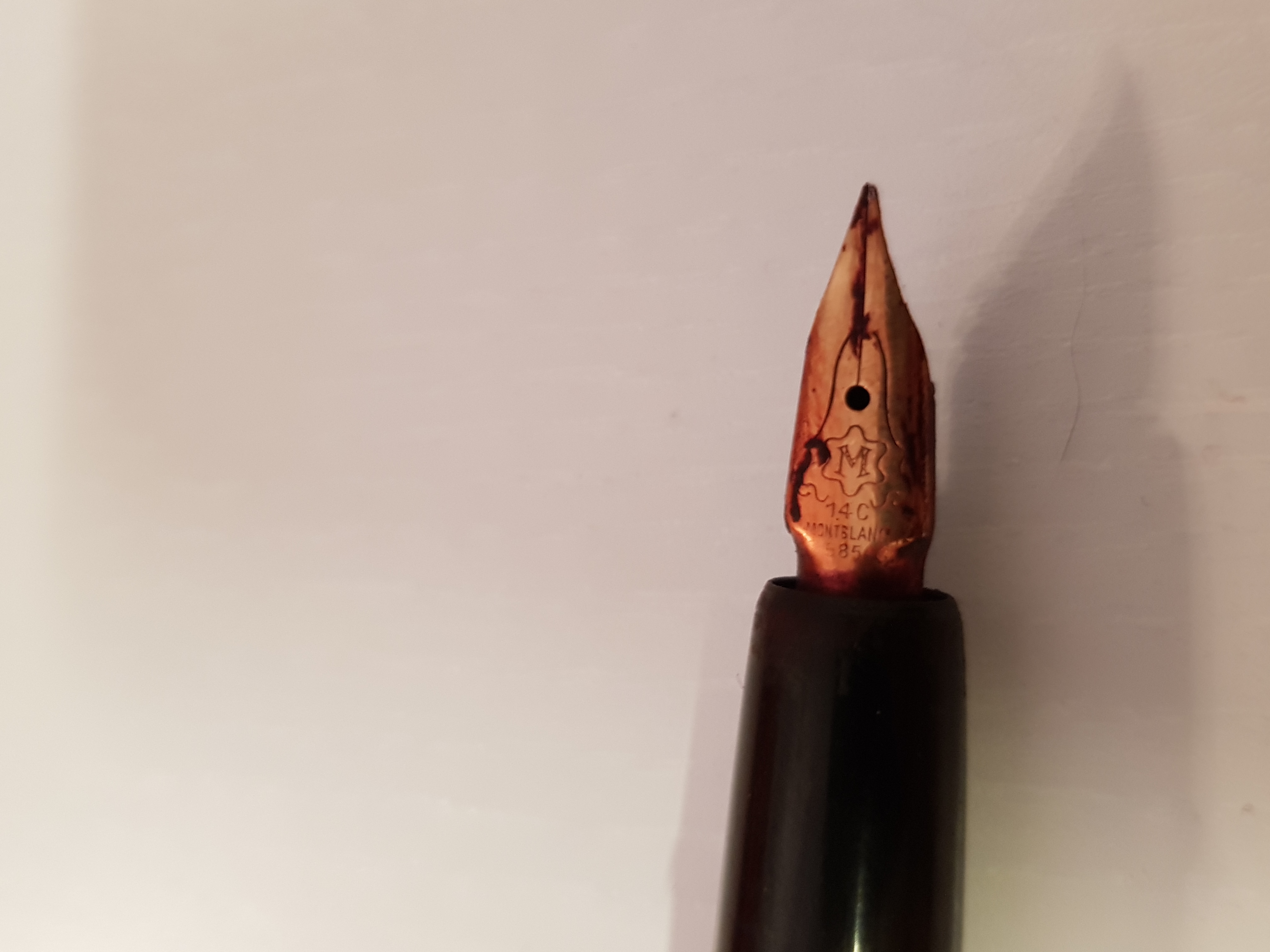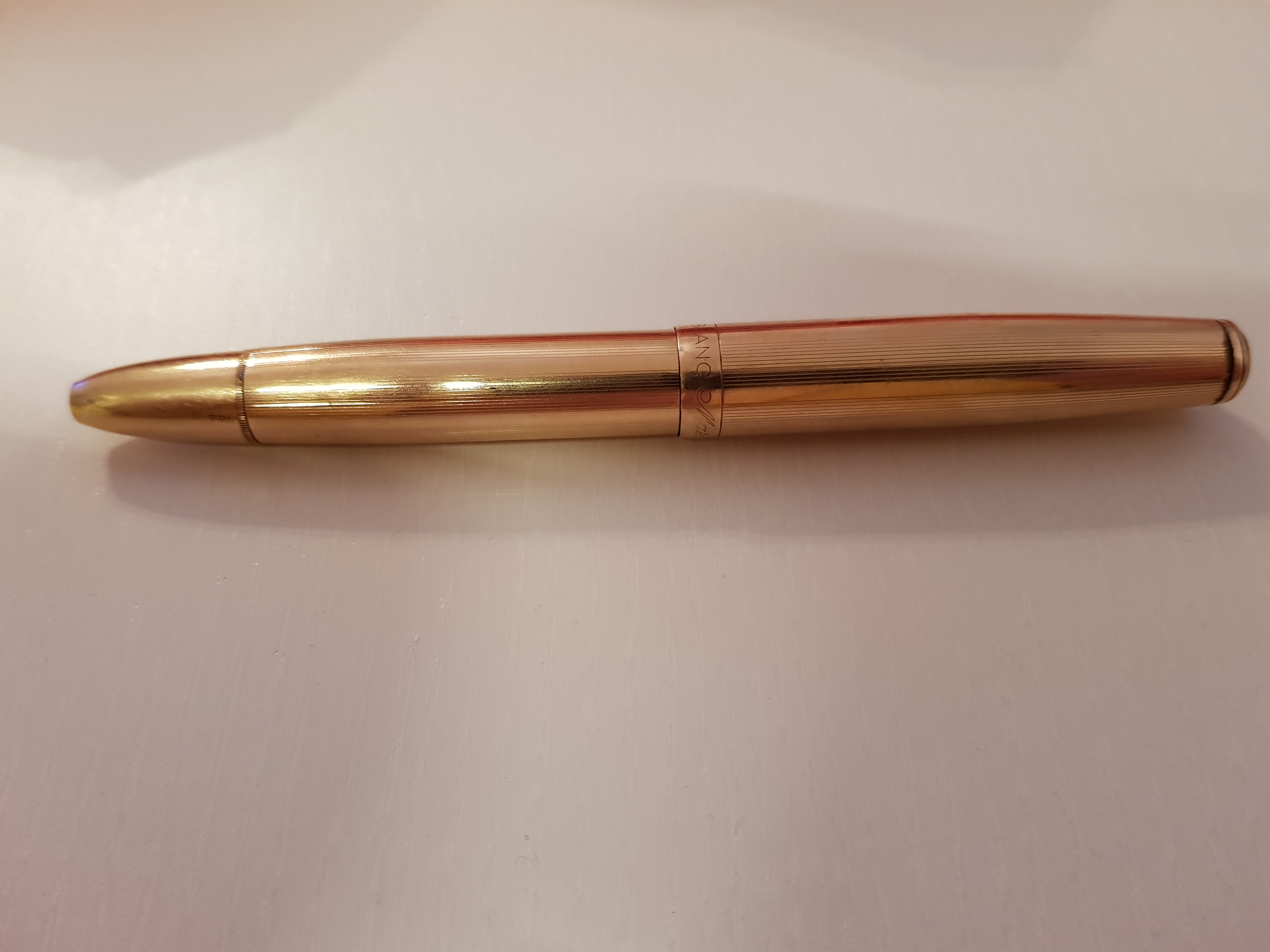 è molto bella e probabilmente abbastanza preziosa. probabilmente, la prima cosa da fare è immergere delicatamente in pennino in acqua fredda. una volta pulita, bisogna capire se il sistema di caricamento funziona. Per caricare, bisogna ruotare la parte terminale del fusto (il fondello) perché si tratta di una penna con un caricamento a stantuffo (guarda il wiki).