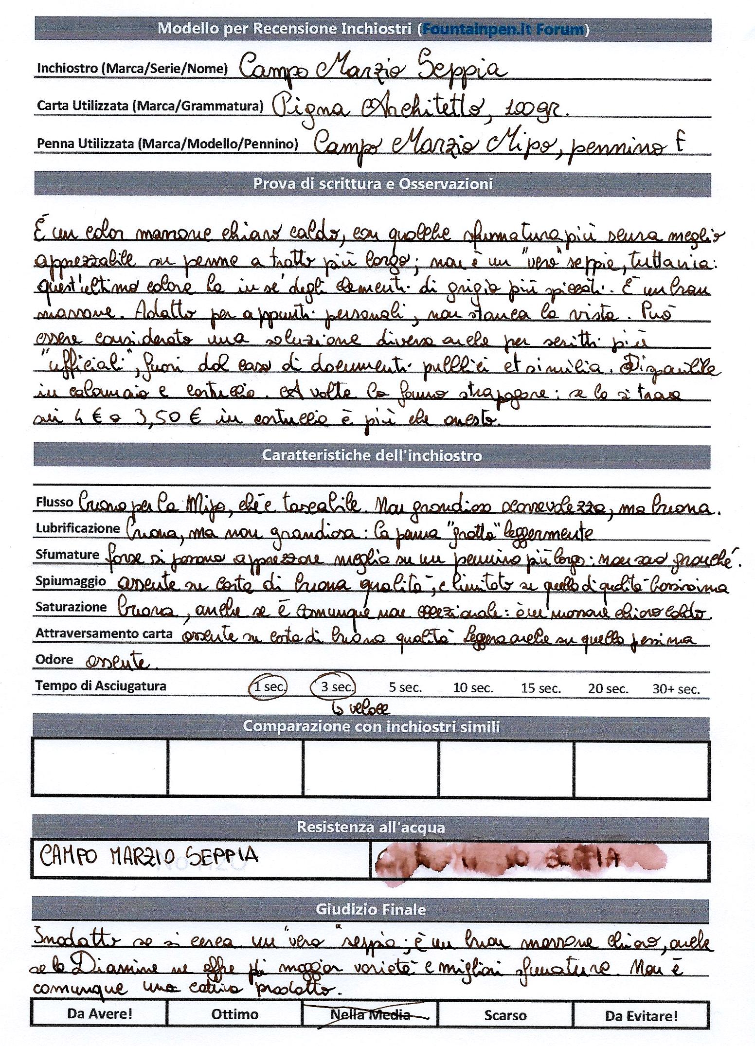 L'elemento del quale io contesto il valore di questo inchiostro è la definizione di "seppia" datagli dalla Campo Marzio: questo è un buon marrone chiaro, ma nel seppia c'è una componente grigia piuttosto consistente, con un 20 blu secondo il modello internazionale RGB, che in questo inchiostro secondo me non è presente, e il fatto che anche tu abbia rinvenuto delle sfumature beige un po' mi conferma in questa opinione.