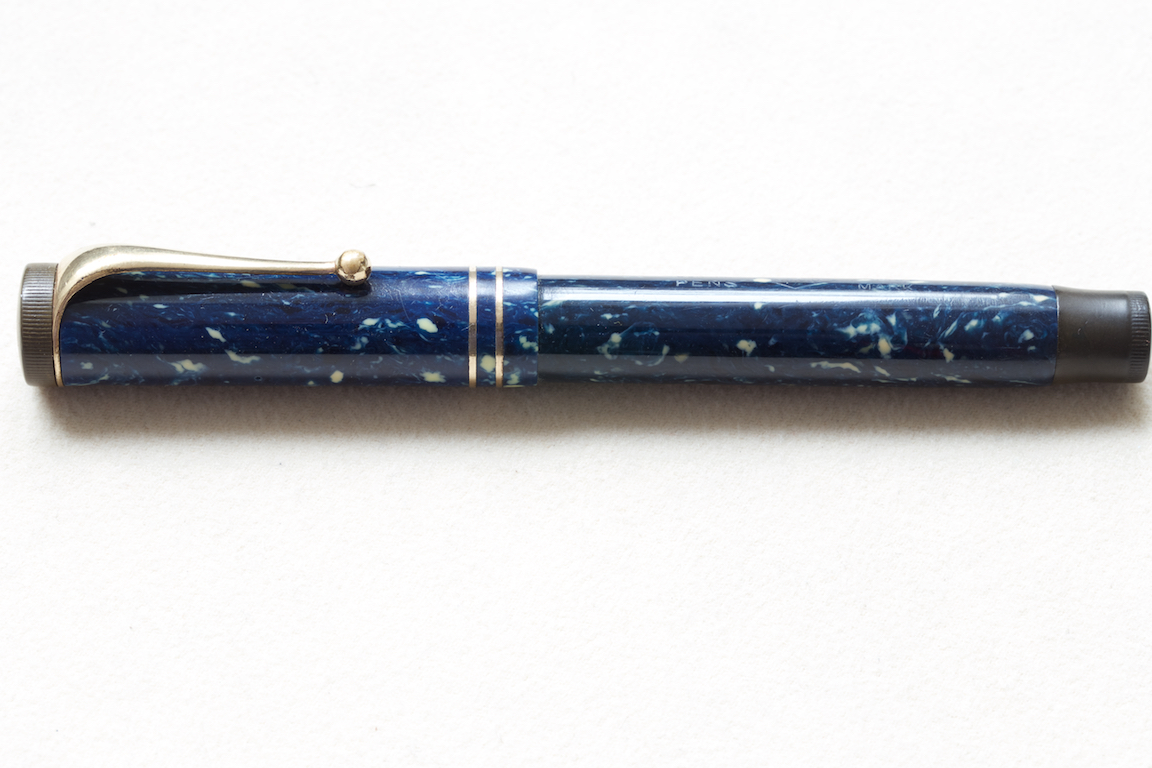 Buongiorno, appena ho visto questa penna ho pensato ad una Parker Duofold, da quello che ho letto la ASCO appartiene alla produzione Aurora. La celluloide di questa penna è semplicemente grandiosa, è un blu che alla luce del sole esplode letteralmente e le macchiette bianche la impreziosiscono ulteriormente. La penna carica tramite pulsante di fondo, il pennino(ZANCO-5-VENEZIA) è in acciaio, doveva essersi rotto l' iridio ed è stato limato per rifare la punta..., le misure sono a penna chiusa cm.13,2 con cappuccio calzato 15,8 e senza cappuccio cm.12,7.
