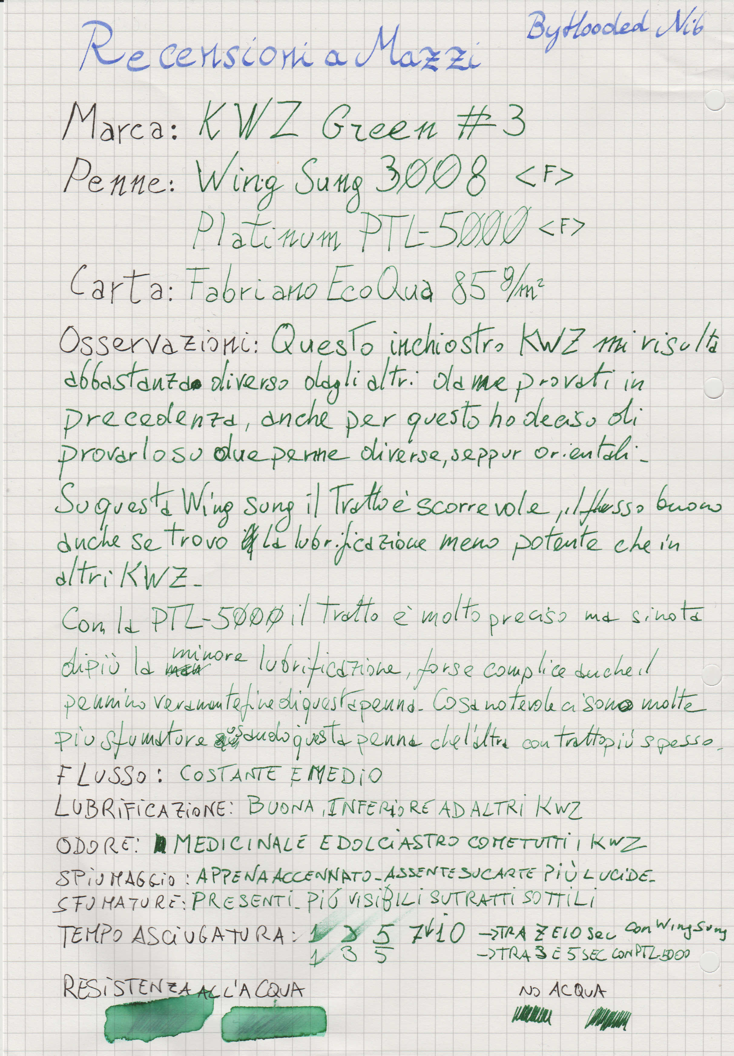 E un inchiostro piu' che buono, solo che ha un certo qual carattere in piu' degli altri KWZ che mi sono capitati per le mani e probabilmente si scontra con penne di carattere ben definito come le Platinum mentre va meglio su penne piu' "accomodanti".
