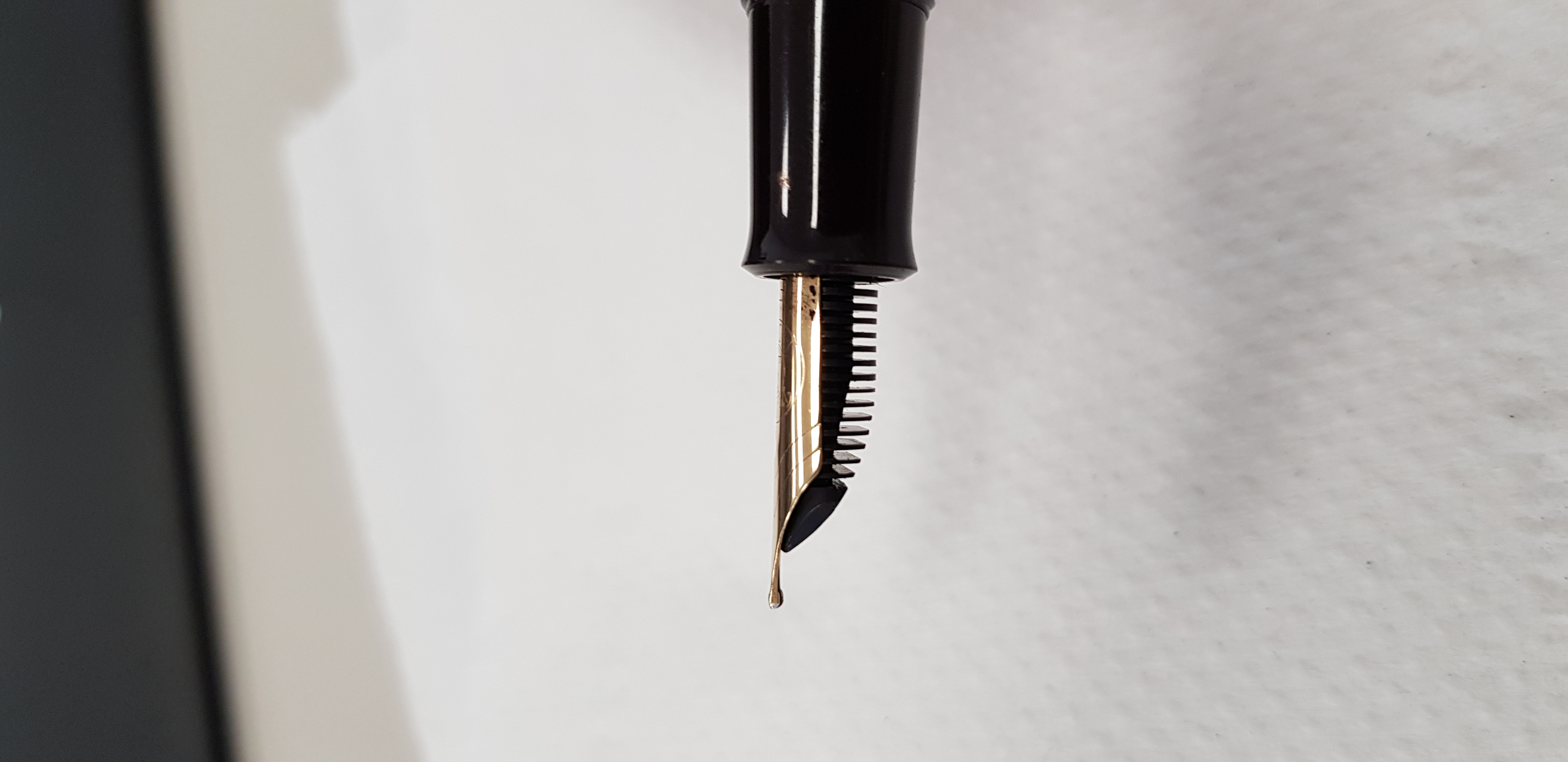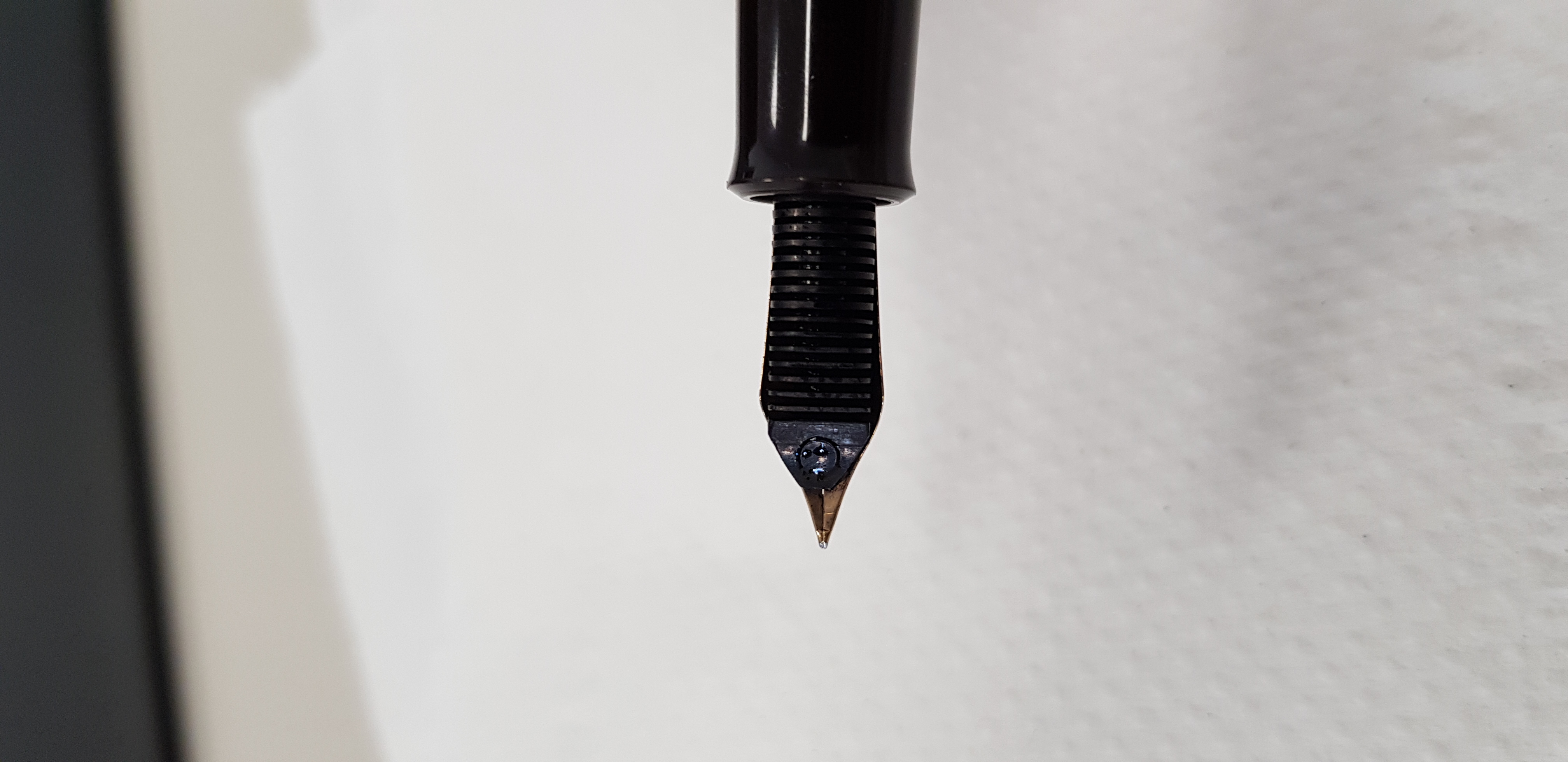 Oltre a questo, quella goccia che si forma sembra proprio una "lacrima" che esce dal pennino, non mi da l'idea di un pennino sporco in generale, insomma è sempre li quella goccia.