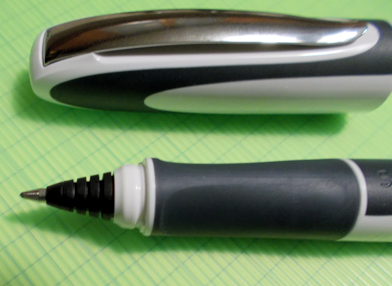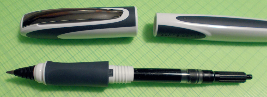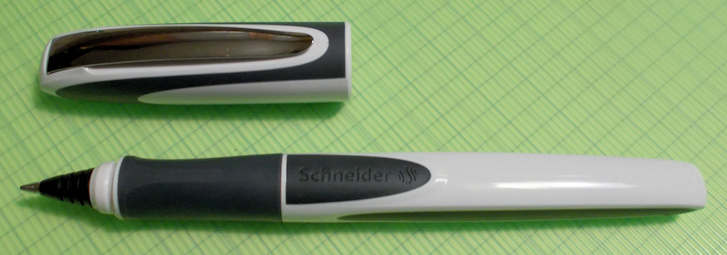 E’ disponibile in due varianti di colore: bianco e grigio e bianco e blu. Io ho scelto quella bianca e grigia perché ha l’impugnatura grigia, mentre nell’altra versione è bianca. Paranoia mia, ma ho avuto una penna con l’impugnatura gommosa bianca e dopo qualche tempo è ingiallita. La parte bianca è di plastica rigida e dalla finitura liscia, quella grigia di plastica più gommosa con la superficie opaca. Il gioco di contrasti la rende gradevole e dall’aspetto meno “economicoso”. Sul fusto, in una “zona grigia” è inciso il marchio Schneider con il relativo logo e sul lato opposto la scritta “Made in Germany”. L’impugnatura è gommosa e con il design ergonomico triangolare tipico di molte penne scolastiche tedesche, Lamy “Safari” su tutte. Schneider ha una vera e propria passione per le clip sovradimensionate, e anche questa “Ray” non fa eccezione. La chiusura del cappuccio è a pressione, sufficientemente salda da evitare l’apertura accidentale nel taschino. Piccola finezza: ruotando il cappuccio a penna chiusa si avvertono distintamente due scatti, che corrispondono al perfetto allineamento delle parti colorate. La penna può essere chiusa anche con il cappuccio disallineato, ma Schneider deve evidentemente aver pensato a quelli che altrimenti avrebbero passato ore ad allinearlo correttamente. La sezione, cilindrica nel punto di avvitamento al cilindro, si appiattisce verso il fondo del tappo e del cilindro. Questo design probabilmente non incontrerà i gusti degli amanti del classico, ma devo dare merito ai designer della casa di essere in grado di realizzare prodotti economici senza farli apparire banali. Infatti questa penna ha vinto uno dei tanti premi tedeschi assegnati al design industriale.