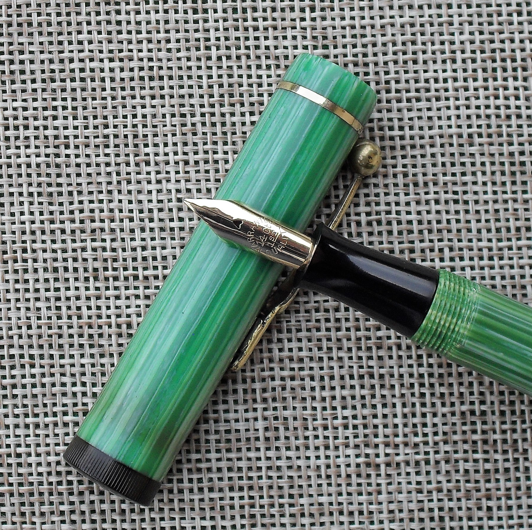 La stilografica è ben conservata ed il suo restauro conservativo non ha richiesto grandi interventi: è bastato procedere ad una pulizia approfondita, anche interna, e riportare al colore nero originario le parti esterne in ebanite (fondello e testa del cappuccio). L’unico difetto estetico che non è stato possibile eliminare è l’annerimento trasmesso internamente alla celluloide dalla filettatura della testa del cappuccio, in pezzo unico con il contro-cappuccio. Ma anche questo elemento estetico fa parte della storia della penna e detto francamente non mi disturba. Grazie all’ottima distribuzione dei pesi, alla lunghezza del corpo e della sezione ed alla sapiente svasatura di quest’ultima, la scrittura si rivela molto confortevole oltre che piacevole. Il cappuccio è piuttosto grande e personalmente preferisco non calzarlo durante l’uso della penna. Il pennino, del tipo "warranted" anteriore al 1935, è morbido, anche se non flessibile, ed è chiaramente stato utilizzato molto, anche se con attenzione. La scrittura risponde appieno ai migliori standard Summit ed è esente da difetti: nessuna falsa partenza, nessun salto, flusso sempre corposo. Ma ecco le caratteristiche tecniche: