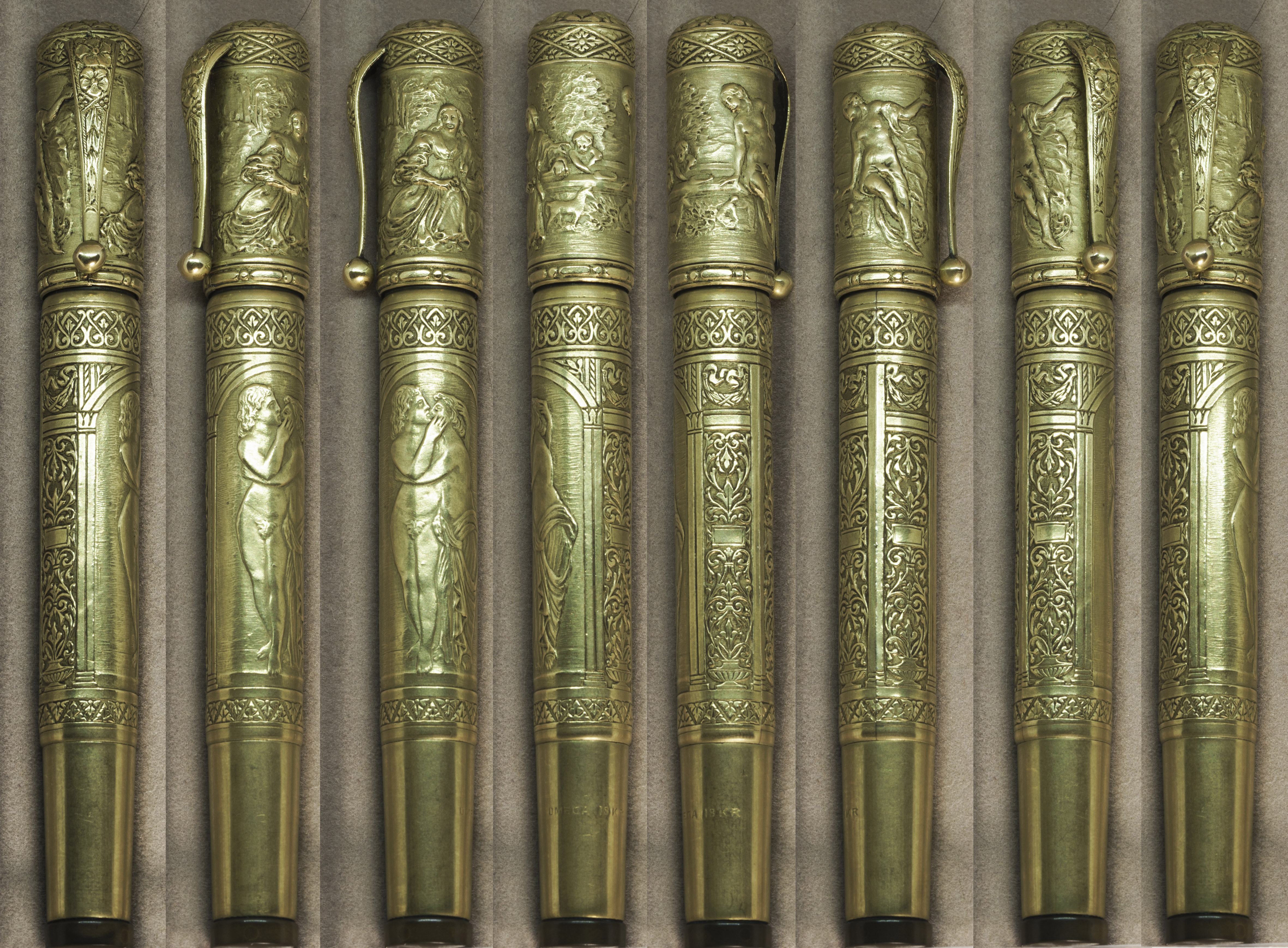 La particolarità che mi fa ritenere questa penna nata così (altre Amor Sacro/Amor Profano hanno il corpo liscio) è che la banda floreale alla base è la metà (riprodotta però ruotata di 90°) di quella alla sommità del cappuccio. inoltre la penna era tutta in patina e anche il pennino è un Omega 14k.