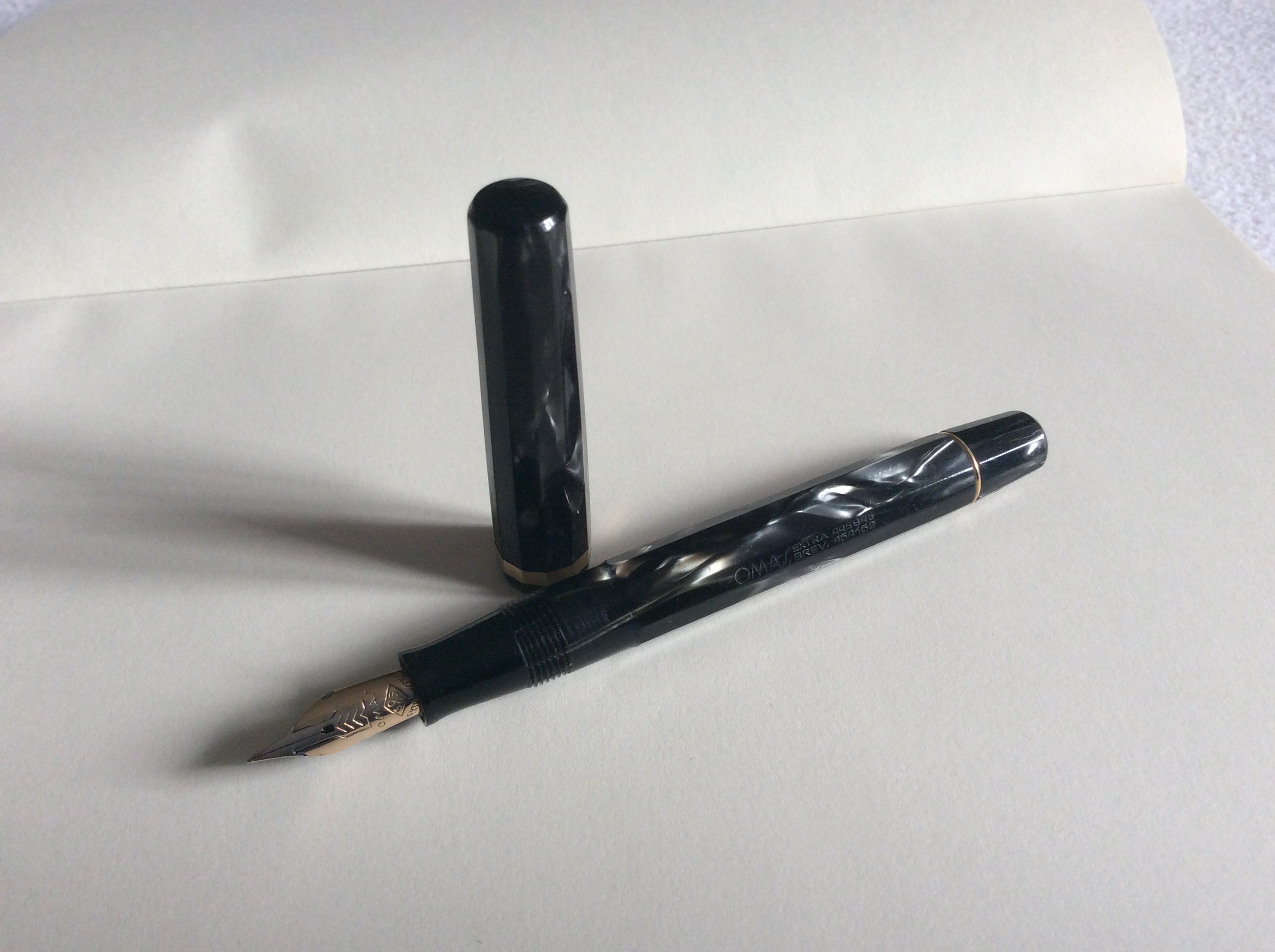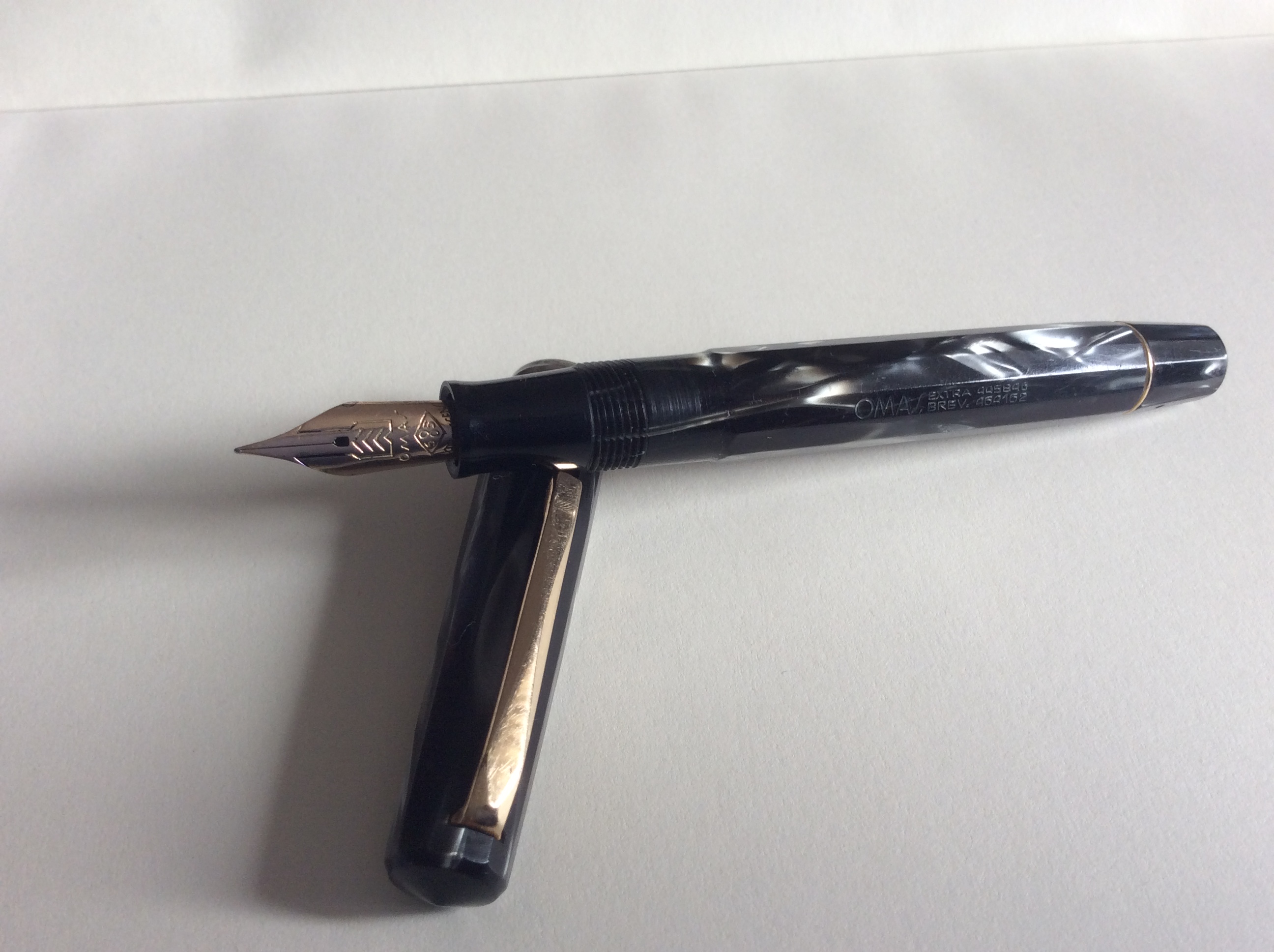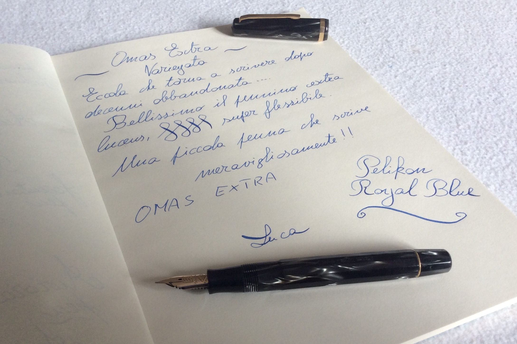 Questa Omas extra in celluloide variegata è la misura piccola della serie che veniva prodotta, misura chiusa 11,2 cm. Carica a pistone, pennino Extra Lucens, una scrittura meravigliosa. Essendo un po’ piccola devo usare anche il cappuccio per avere una impugnatura ottimale. Il pennino è super flessibile, bello scorrevole, regala una piacevole esperienza. Questa penna andrà a fare compagnia alla sorella maggiore in attesa di incappare in quella più grande... :D