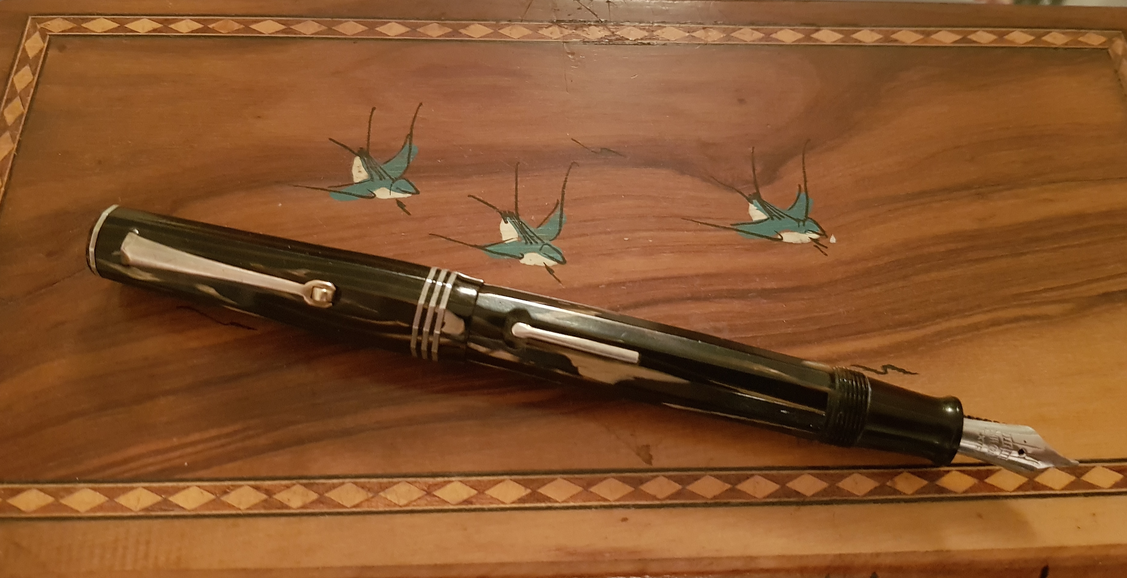 Questa serie era veramente di qualità sia costruttiva che estetica....cosa purtroppo a mio modesto avviso non riscontrabile nei modelli successivi. Per esempio.mi è capitata una bella Montegrappa misura grande anellata trasparente ma con meccanismo di carica twist e quindi con sacchetto interno...mi sono sempre chiesto che senso ha lasciare una trasparenza quando poi c'è il sacchetto. Mentre qui potremmo parlare solo di una scelta scellerata nel sistema di carica da abbinare al fusto in altri casi ho trovato i meccanismi poco affidabili....per non parlare di alcuni modelli fine anni 40 e inizio 50 veramente ingurdabili. Dispiace che un marchio italiano partito così bene sia poi andato a finire così miseramente!!